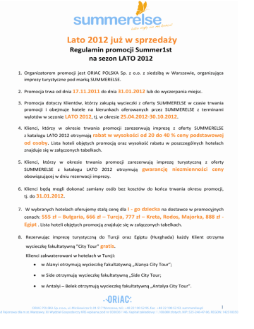 Lato 2012 już w sprzedaży Regulamin promocji Summer1st na sezon LATO 2012 1. Organizatorem promocji jest ORIAC POLSKA Sp. z o.o. z siedzibą w Warszawie, organizująca imprezy turystyczne pod marką SUMMERELSE. 2. Promocja trwa od dnia 17.11.2011 do dnia 31.01.2012 lub do wyczerpania miejsc. 3. Promocja dotyczy Klientów, którzy zakupią wycieczki z oferty SUMMERELSE w czasie trwania promocji i obejmuje hotele na kierunkach oferowanych przez SUMMERELSE z terminami wylotów w sezonie LATO 2012, tj. w okresie 25.04.2012-30.10.2012. 4. Klienci, którzy w okresie trwania promocji zarezerwują imprezę z oferty SUMMERELSE z katalogu LATO 2012 otrzymają rabat w wysokości od 20 do 40 % ceny podstawowej od osoby. Lista hoteli objętych promocją oraz wysokośd rabatu w poszczególnych hotelach znajduje się w załączonych tabelkach. 5. Klienci, którzy w okresie trwania promocji zarezerwują imprezę turystyczną z oferty SUMMERELSE z katalogu LATO 2012 otrzymują gwarancję niezmienności ceny obowiązującej w dniu rezerwacji imprezy. 6. Klienci będą mogli dokonad zamiany osób bez kosztów do kooca trwania okresu promocji, tj. do 31.01.2012. 7. W wybranych hotelach oferujemy stałą cenę dla I - go dziecka na dostawce w promocyjnych cenach: 555 zł – Bułgaria, 666 zł – Turcja, 777 zł – Kreta, Rodos, Majorka, 888 zł - Egipt . Lista hoteli objętych promocją znajduje się w załączonych tabelkach. 8. Rezerwując imprezę turystyczną do Turcji oraz Egiptu (Hurghada) każdy Klient otrzyma wycieczkę fakultatywną ”City Tour” gratis. Klienci zakwaterowani w hotelach w Turcji: w Alanyi otrzymują wycieczkę fakultatywną „Alanya City Tour”; w Side otrzymują wycieczkę fakultatywną „Side City Tour; w Antalyi – Belek otrzymują wycieczkę fakultatywną „Antalya City Tour”. 1 9. Liczba miejsc w promocji jest ograniczona. 10. Klienci objęci są Ogólnymi warunkami uczestnictwa w imprezach organizowanych przez Oriac Polska Sp. z o.o. pod marką Summerelse, zamieszczonymi na naszej stronie internetowej: www.summerelse.pl, w zakładce „Do pobrania”. LISTA HOTELI OBJĘTYCH PROMOCJĄ GRECJA / Kreta Miejscowośd Nazwa hotelu Wyżywienie Rabat Cena minimalna (po rabacie) Ammoudara Santa Marina Beach 4* All Inclusive do 30 % 2099 zł Hersonissos Hersonissos Village 4* All Inclusive do 20 % 1999 zł Scaleta Scaleta Beach 3*+ All Inclusive do 40 % 1899 zł Scaleta Begeti Bay 3* All Inclusive do 20 % 1799 zł Bali Xidas Garden 3* All Inclusive do 20 % 1859 zł All Inclusive do 30 % 1699 zł Rabat Cena minimalna (po rabacie) Rethymno Pantheon 3* GRECJA / Rodos Miejscowośd Nazwa hotelu Wyżywienie Ialyssos Forum Beach & Spa 4* All Inclusive do 40 % 1899 zł Ialyssos Blu Bay Resort & Aqupark 4* All Inclusive do 30 % 1999 zł 1999 zł 1899 zł Ixia Belair Beach 4* All Inclusive do 20 % Ialyssos Matoula Family World 3* All Inclusive do 20 % 2 HISZPANIA / Majorka Miejscowośd Palma Nova Magaluf Portals Nous Playa de Palma Can Pastilla Arenal Arenal Nazwa hotelu Ibersol Son Caliu Mar & Beach Resort 4* Marina Barracuda 3* Maria Luisa 3* Ambos Mundos 3* Gala Miraflores 3* Ipanema Beach 3* Palma Bay 3* Wyżywienie All Inclusive All Inclusive All Inclusive All Inclusive FB All Inclusive All Inclusive Rabat Cena minimalna (po rabacie) do 30 % do 20 % do 40 % do 30 % do 20 % do 20 % do 20 % 2089 zł 1999 zł 2099 zł 1999 zł 2059 zł 2099 zł 2099 zł EGIPT / Hurghada Miejscowośd Nazwa hotelu Wyżywienie Rabat Cena minimalna (po rabacie) Hurghada Hurghada Hurghada Hurghada Hurghada Hurghada Hurghada Hurghada Hurghada Hurghada Hurghada Hurghada Alf Leila Wa Leila 4* Jungle Aqua Park 4*+ Aqua Vista Resort 4* Beach Albatros Garden 4* Beach Albatros Resort 4* Albatros Palace 5* Aqua Blu 4* Dana Beach 5* Paradise Golden 5 5* Club Golden 5 4* Topaz Club Suites 4* Diamond 5* All Inclusive All Inclusive All Inclusive All Inclusive All Inclusive All Inclusive All Inclusive All Inclusive All Inclusive All Inclusive All Inclusive All Inclusive do 40 % do 30 % do 20 % do 20 % do 20 % do 20 % do 20 % do 20 % do 20 % do 20 % do 20 % do 20 % 2029 zł 2129 zł 2129 zł 2069 zł 2399 zł 2429 zł 2069 zł 2329 zł 1929 zł 1839 zł 1839 zł 1929 zł Wyżywienie Rabat Cena minimalna (po rabacie) All Inclusive All Inclusive All Inclusive do 20% do 20% do 30% 2249 zł 2129 zł 2099 zł EGIPT / Sharm El Sheikh Miejscowośd Sharm El Sheikh Sharm El Sheikh Sharm El Sheikh Nazwa hotelu Albatros Royal Moderna 5* Beach Albatros Sharm Resort 4* Aqua Blu Sharm 4* 3 BUŁGARIA / Burgas Miejscowośd Nazwa hotelu Wyżywienie Rabat Cena minimalna (po rabacie) Słoneczny Brzeg Słoneczny Brzeg Słoneczny Brzeg Słoneczny Brzeg Słoneczny Brzeg Słoneczny Brzeg Słoneczny Brzeg Słoneczny Brzeg Yavor Palace 4* Meridien 4* Sun Palace 4* Diamant 4* Flamingo 4* Globus 4* Azurro 3* Parkhotel Continental 3* All Inclusive All Inclusive All Inclusive HB, All Inclusive HB, FB HB All Inclusive All Inclusive do 30 % do 30 % do 20 % do 40 % do 20 % do 20 % do 20 % do 30 % 1629 zł 1699 zł 1599 zł 1299 zł 1359 zł 1459 zł 1479 zł 1499 zł TURCJA / Alanya Miejscowośd Nazwa hotelu Wyżywienie Rabat Cena minimalna (po rabacie) Alanya Alanya Alanya Belek Belek Antalya - Lara Alanya Side Alanya Lycus Beach 5* Eftalia Village 5* Holiday Park 5* Belek Beach 5* Letoonia Golf 5* Miracle 5* Eftalia Resort 4* Hera Park 4* Diamore 3* All Inclusive All Inclusive All Inclusive Ultra All Inclusive Ultra All Inclusive Ultra All Inclusive All Inclusive All Inclusive All Inclusive do 30 % do 20 % do 20 % do 20 % do 20 % do 30 % do 40 % do 20 % do 20 % 1999 zł 1799 zł 1899 zł 2399 zł 2559 zł 2699 zł 1799 zł 1699 zł 1499 zł 4 LISTA HOTELI OBJĘTYCH STAŁĄ CENĄ DLA DZIECKA GRECJA / Kreta Miejscowośd Ammoudara Hersonissos Scaleta Scaleta Bali Rethymno Nazwa hotelu Santa Marina Beach 4* Hersonissos Village 4* Scaleta Beach 3*+ Begeti Bay 3* Xidas Garden 3* Pantheon 3* GRECJA / Rodos 1. dziecko od Wyżywienie Cena dla 1. dziecka n