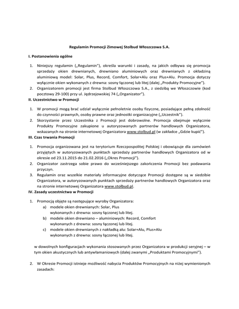 Regulamin Promocji Zimowej Stolbud Włoszczowa S.A. I. Postanowienia ogólne 1. Niniejszy regulamin („Regulamin”), określa warunki i zasady, na jakich odbywa się promocja sprzedaży okien drewnianych, drewniano aluminiowych oraz drewnianych z okładziną aluminiową model: Solar, Plus, Record, Comfort, Solar+Alu oraz Plus+Alu. Promocja dotyczy wyłącznie okien wykonanych z drewna: sosny łączonej lub litej (dalej „Produkty Promocyjne”). 2. Organizatorem promocji jest firma Stolbud Włoszczowa S.A., z siedzibą we Włoszczowie (kod pocztowy 29-100) przy ul. Jędrzejowskiej 74 („Organizator”). II. Uczestnictwo w Promocji 1. W promocji mogą brać udział wyłącznie pełnoletnie osoby fizyczne, posiadające pełną zdolność do czynności prawnych, osoby prawne oraz jednostki organizacyjne („Uczestnik”). 2. Skorzystanie przez Uczestnika z Promocji jest dobrowolne. Promocja obejmuje wyłącznie Produkty Promocyjne zakupione u autoryzowanych partnerów handlowych Organizatora, wskazanych na stronie internetowej Organizatora www.stolbud.pl (w zakładce „Gdzie kupić”). III. Czas trwania Promocji 1. Promocja organizowana jest na terytorium Rzeczpospolitej Polskiej i obowiązuje dla zamówień przyjętych w autoryzowanych punktach sprzedaży partnerów handlowych Organizatora od w okresie od 23.11.2015 do 21.02.2016 („Okres Promocji”). 2. Organizator zastrzega sobie prawo do wcześniejszego zakończenia Promocji bez podawania przyczyn. 3. Regulamin oraz wszelkie materiały informacyjne dotyczące Promocji dostępne są w siedzibie Organizatora, w autoryzowanych punktach sprzedaży partnerów handlowych Organizatora oraz na stronie internetowej Organizatora www.stolbud.pl. IV. Zasady uczestnictwa w Promocji 1. Promocją objęte są następujące wyroby Organizatora: a) modele okien drewnianych: Solar, Plus wykonanych z drewna: sosny łączonej lub litej. b) modele okien drewniano – aluminiowych: Record, Comfort wykonanych z drewna: sosny łączonej lub litej. c) modele okien drewnianych z nakładką alu: Solar+Alu, Plus+Alu wykonanych z drewna: sosny łączonej lub litej. w dowolnych konfiguracjach wykonania stosowanych przez Organizatora w produkcji seryjnej – w tym okien akustycznych lub antywłamaniowych (dalej zwanymi „Produktami Promocyjnymi”). 2. W Okresie Promocji istnieje możliwość nabycia Produktów Promocyjnych na niżej wymienionych zasadach: a) Uczestnicy - klienci indywidualni (tj. ostateczni odbiorcy/użytkownicy) z rabatem w wysokości 25 % w przypadku zakupu w autoryzowanych punktach sprzedaży prowadzonych przez partnerów handlowych Organizatora, pod warunkiem: - wpłacenia zaliczki w wysokości 50 % wartości zamówienia objętego promocją, - udostępnienia Organizatorowi swoich danych (miasto, numer telefonu, adres e-mail), 3. Wyżej wymienione promocje nie łącza się z promocją pracowniczą oraz innymi promocjami. V. Reklamacje 1. Wszelkie reklamacje w zakresie niezgodności przeprowadzenia Promocji z Regulaminem należy zgłosić w Okresie Promocji lub w terminie 30 dni od dnia zakończenia Promocji, listem poleconym na adres: Stolbud Włoszczowa S.A. 29-100 Włoszczowa, ul. Jędrzejowska 74. Reklamacje, które wpłyną do Organizatora po upływie 30 dni od dnia zakończenia Promocji, nie będą rozpatrywane. 2. Zgłoszenie reklamacyjne powinno zawierać: imię i nazwisko Uczestnika, adres do korespondencji jak również opis podstaw reklamacji oraz podpis wnoszącego reklamację. 3. Reklamacje rozpatrywane będą w terminie 14 dni od daty otrzymania przez Organizatora. VI. Ochrona danych osobowych 1. Udział w promocji i podanie związanych z udziałem w niej danych osobowych jest całkowicie dobrowolne. Organizator Promocji zapewnia ochronę danych osobowych Uczestników i oświadcza, że wykorzystanie danych osobowych będzie zgodne z ustawą z dnia 29 sierpnia 1997 roku o ochronie danych osobowych (Dz.U. 2014 r. poz. 1182) – „Ustawa”. 2. Przed wzięciem udziału w Promocji, Uczestnik jest zobowiązany do zapoznania się i zaakceptowania Regulaminu oraz wyrażenia zgody na przetwarzanie swoich danych osobowych przez Organizatora Promocji na potrzeby prowadzenia Promocji, zgodnie z obowiązującymi przepisami prawa. Złożenie zamówienia w Okresie Promocji na Produkty promocyjne oznacza akceptację warunków Promocji oraz treści Regulaminu. Udzielenie zgody przez Uczestnika Promocji na przetwarzanie danych osobowych w celach, o których mowa w zdaniu pierwszym jak powyżej, następuje przez złożenie oddzielnego oświadczenia. 3. Administratorem danych osobowych zebranych podczas Promocji jest - w rozumieniu Ustawy Organizator. Uczestnicy mają prawo dostępu do ich danych osobowych, jak również prawo do ich zmieniania, uzupełniania lub poprawiania. Dane osobowe Uczestników nie będą przekazywane podmiotom trzecim. VI. Postanowienia końcowe. 1. Naruszenie przez Uczestnika warunków Regulaminu może spowodować cofnięcie uprawnień przysługujących mu z tytułu udziału w Promocji. 2. Organizator zastrzega sobie prawo do zmiany Regulaminu pod warunkiem, że nie naruszy to praw już nabytych Uczestników Promocji do dnia wejścia w życie jego zmian. Informacja o zmianach w Regulaminie będzie dostępna na stronie www.stolbud.pl Zmiany Regulaminu wchodzą w życie w dniu następnym po dniu ich opublikowania w sposób podany w zdaniu poprzedzającym. 3. Prawa i obowiązki Organizatora oraz Uczestnika określone są wyłącznie w Regulaminie i obowiązujących przepisach prawa.