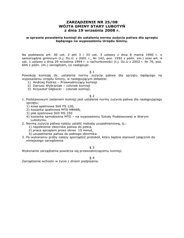 ZARZĄDZENIE NR 25/08 WÓJTA GMINY STARY LUBOTYŃ z dnia 19 września 2008 r. w sprawie powołania komisji do ustalenia normy zuŜycia paliwa dla sprzętu będącego na wyposaŜeniu Urzędu Gminy. Na podstawie art. 30 ust. 2 pkt 3 i 33 ust. 3 ustawy z dnia 8 marca 1990 r. o samorządzie gminnym (t.j. Dz.U. z 2001 r., Nr 142, poz. 1592 z późn. zm.) oraz art. 4 ust. 1 ustawy z dnia 29 września 1994 r. o rachunkowości (t.j. Dz.U z 2002 r. Nr 76, poz. 694 z późn. zm.) zarządzam, co następuje: §1 Powołuję komisję ds. ustalenia normy zuŜycia paliwa dla sprzętu będącego na wyposaŜeniu Urzędu Gminy, w następującym składzie: 1) Andrzej Podrez – Przewodniczący komisji 2) Dariusz Wybraniak – członek komisji 3) Krzysztof Głębocki – członek komisji. §2 1. Podstawowym zadaniem komisji jest ustalenie normy zuŜycia paliwa dla następującego sprzętu: 1) kosa spalinowa Still FS 120, 2) kosiarka spalinowa MTD HB46B, 3) piła spalinowa Still MS 250 4) kosiarka samobieŜna MTD – na wyposaŜeniu Szkoły Podstawowej w Starym Lubotyniu. 2. Normę zuŜycia paliwa naleŜy ustalić metodą uzupełnieniową, tj.: 1) napełnienie zbiornika paliwa do pełna, 2) praca sprzętem przez okres 15 minut, 3) uzupełnienie paliwa do pełnego zbiornika 3. Po wykonaniu próby naleŜy sporządzić protokół, który będzie stanowił załącznik do niniejszego zarządzenia. §3 Wykonanie zarządzenia powierza się przewodniczącemu komisji. §4 Zarządzenie wchodzi w Ŝycie z dniem podpisania.