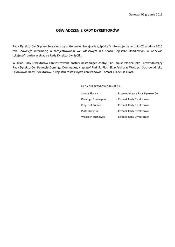 Genewa, 02 grudnia 2015 OŚWIADCZENIE RADY DYREKTORÓW Rada Dyrektorów Orphée SA z siedzibą w Genewie, Szwajcaria („Spółka”) informuje, że w dniu 02 grudnia 2015 roku powzięła informację o zarejestrowaniu we właściwym dla Spółki Rejestrze Handlowym w Genewie („Rejestr”) zmian w składzie Rady Dyrektorów Spółki. W skład Rady Dyrektorów zarejestrowane zostały następujące osoby: Pan Janusz Płocica jako Przewodniczący Rady Dyrektorów, Panowie Domingo Dominguez, Krzysztof Rudnik, Piotr Skrzyński oraz Wojciech Suchowski jako Członkowie Rady Dyrektorów. Z Rejestru zostali wykreśleni Panowie Tomasz i Tadeusz Tuora. RADA DYREKTORÓW ORPHÉE SA : Janusz Płocica - Przewodniczący Rady Dyrektorów Domingo Dominguez - Członek Rady Dyrektorów Krzysztof Rudnik - Członek Rady Dyrektorów Piotr Skrzyński - Członek Rady Dyrektorów Wojciech Suchowski - Członek Rady Dyrektorów