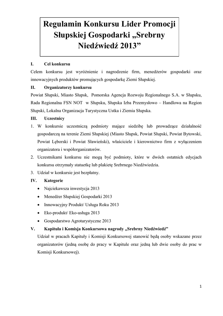 Regulamin Konkursu Lider Promocji Słupskiej Gospodarki „Srebrny Niedźwiedź 2013” I. Cel konkursu Celem konkursu jest wyróżnienie i nagrodzenie firm, menedżerów gospodarki oraz innowacyjnych produktów promujących gospodarkę Ziemi Słupskiej. II. Organizatorzy konkursu Powiat Słupski, Miasto Słupsk, Pomorska Agencja Rozwoju Regionalnego S.A. w Słupsku, Rada Regionalna FSN NOT w Słupsku, Słupska Izba Przemysłowo – Handlowa na Region Słupski, Lokalna Organizacja Turystyczna Ustka i Ziemia Słupska. III. Uczestnicy 1. W konkursie uczestniczą podmioty mające siedzibę lub prowadzące działalność gospodarczą na terenie Ziemi Słupskiej (Miasto Słupsk, Powiat Słupski, Powiat Bytowski, Powiat Lęborski i Powiat Sławieński), właściciele i kierownictwo firm z wyłączeniem organizatora i współorganizatorów. 2. Uczestnikami konkursu nie mogą być podmioty, które w dwóch ostatnich edycjach konkursu otrzymały statuetkę lub plakietę Srebrnego Niedźwiedzia. 3. Udział w konkursie jest bezpłatny. IV. V. Kategorie Najciekawsza inwestycja 2013 Menedżer Słupskiej Gospodarki 2013 Innowacyjny Produkt/ Usługa Roku 2013 Eko-produkt/ Eko-usługa 2013 Gospodarstwo Agroturystyczne 2013 Kapituła i Komisja Konkursowa nagrody „Srebrny Niedźwiedź” Udział w pracach Kapituły i Komisji Konkursowej stanowić będą osoby wskazane przez organizatorów (jedną osobę do pracy w Kapitule oraz jedną lub dwie osoby do prac w Komisji Konkursowej). 1 VI. Przebieg konkursu 1. Warunkiem udziału w konkursie jest przesłanie wypełnionego formularza zgłoszeniowego wraz z wymaganymi załącznikami, stosownie do kategorii w terminie do dnia 1 września br. pocztą tradycyjną lub osobiście na adres: Starostwo Powiatowe w Słupsku, ul. Szarych Szeregów 14, 76-200 Słupsk z dopiskiem „Srebrny Niedźwiedź 2013” lub drogą elektroniczną na adres email: [email protected]. 2. Formularz zgłoszeniowy wraz z Regulaminem dostępny będzie na stronach organizatorów Konkursu. Konkurs zostanie również ogłoszony w mediach. 3. Komisja Konkursowa na pierwszym posiedzeniu ustali harmonogram prac. 4. Komisja Konkursowa na ostatnim posiedzeniu po zapoznaniu się z nadesłanymi zgłoszeniami i bezstronnej dyskusji dokona oceny kandydatów w skali od 1-5 (każdy z członków Komisji) wg poniższych parametrów: Najciekawsza Inwestycja 2013: - wysokość nakładów inwestycyjnych, - wysokość pozyskanych środków zewnętrznych na inwestycję, - efekty ekonomiczne, - wpływ inwestycji na atrakcyjność regionu. Menadżer Słupskiej Gospodarki 2013: - wyniki ekonomiczne prowadzonej działalności i osobisty wkład w rozwój firmy, - szczególne osobiste osiągnięcia zawodowe, - uzyskane wyróżnienia i nagrody. Innowacyjny Produkt/Usługa Roku 2013: - innowacyjność produktu wdrożonego/oryginalność pomysłu w skali branży i kraju, - ocena efektów wdrożenia projektu/wymiar ekonomiczno-rynkowy produktu w skali dla przedsiębiorstwa, regionu i gospodarki kraju, dla możliwości wzrostu polskiego eksportu, dla postępu technicznego w polskiej gospodarce. - oddziaływanie na środowisko. Eko-produkt/ Eko-usługa 2013: - wyniki ekonomiczne firmy, - uzyskany efekt ekologiczny, - innowacyjność i oryginalność wdrożeń lub innych działań, - promowanie edukacji ekologicznej, - inwestycje służące ochronie środowiska, - posiadane certyfikaty, nagrody i wyróżnienia. 2 Gospodarstwo Agroturystyczne 2013: - posiadana baza rekreacyjna, - oferowany program pobytu, - liczba pokoi/miejsc noclegowych w obiekcie, - nagrody i wyróżnienia, - estetyka obiektu. 5. Komisja Konkursowa na podstawie dokonanych ocen wybierze 3 nominowanych z największą liczbą punktów w każdej kategorii. 6. Komisja Konkursowa zastrzega sobie prawo do: - wizyty u uczestników Konkursu, - zasięgnięcia opinii o podmiotach uczestniczących w konkursie u ich klientów i dostawców oraz wglądu do oryginalnych dokumentów potwierdzających informacje podane w karcie zgłoszeniowej do udziału w konkursie. 7. Kapituła Konkursowa na podstawie przedstawionych przez Komisję Konkursową nominacji wskaże laureatów do nagrody głównej i plakiety pamiątkowej w każdej z kategorii. 8. Laureat nagrody głównej w danej kategorii otrzyma statuetkę Srebrnego Niedźwiedzia 2013, a zdobywca drugiego miejsca otrzyma pamiątkową plakietę. 9. Wręczenie nagród nastąpi podczas gali, która odbędzie się w październiku br. w ramach Słupskich Dni Gospodarki 2014. VII. Postanowienia końcowe Komórka organizacyjna odpowiedzialna za przebieg Konkursu Srebrny Niedźwiedź 2013: Oddział Promocji i Współpracy w Wydziale Rozwoju Powiatu i Inwestycji Starostwo Powiatowe w Słupsku ul. Szarych Szeregów 14 76 – 20 Słupsk tel: 59 841 87 21 e-mail: [email protected] VIII. Załączniki 1. Arkusz Zgłoszeniowy w kategorii „Najciekawsza Inwestycja 2013”, 2. Arkusz Zgłoszeniowy w kategorii „Menedżer Słupskiej Gospodarki 2013”, 3. Arkusz Zgłoszeniowy w kategorii „Innowacyjny Produkt/Usługa Roku2013”, 4. Arkusz Zgłoszeniowy w kategorii „Eko-produkt/ Eko-usługa 2013”, 5. Arkusz Zgłoszeniowy w kategorii „Gospodarstwo Agroturystyczne 2013”. 3