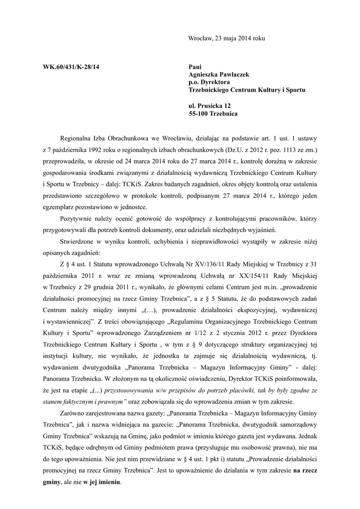 Wrocław, 23 maja 2014 roku WK.60/431/K-28/14 Pani Agnieszka Pawlaczek p.o. Dyrektora Trzebnickiego Centrum Kultury i Sportu ul. Prusicka 12 55-100 Trzebnica Regionalna Izba Obrachunkowa we Wrocławiu, działając na podstawie art. 1 ust. 1 ustawy z 7 października 1992 roku o regionalnych izbach obrachunkowych (Dz.U. z 2012 r. poz. 1113 ze zm.) przeprowadziła, w okresie od 24 marca 2014 roku do 27 marca 2014 r., kontrolę doraźną w zakresie gospodarowania środkami związanymi z działalnością wydawniczą Trzebnickiego Centrum Kultury i Sportu w Trzebnicy – dalej: TCKiS. Zakres badanych zagadnień, okres objęty kontrolą oraz ustalenia przedstawiono szczegółowo w protokole kontroli, podpisanym 27 marca 2014 r., którego jeden egzemplarz pozostawiono w jednostce. Pozytywnie należy ocenić gotowość do współpracy z kontrolującymi pracowników, którzy przygotowywali dla potrzeb kontroli dokumenty, oraz udzielali niezbędnych wyjaśnień. Stwierdzone w wyniku kontroli, uchybienia i nieprawidłowości wystąpiły w zakresie niżej opisanych zagadnień: Z § 4 ust. 1 Statutu wprowadzonego Uchwałą Nr XV/136/11 Rady Miejskiej w Trzebnicy z 31 października 2011 r. wraz ze zmianą wprowadzoną Uchwałą nr XX/154/11 Rady Miejskiej w Trzebnicy z 29 grudnia 2011 r., wynikało, że głównymi celami Centrum jest m.in. „prowadzenie działalności promocyjnej na rzecz Gminy Trzebnica”, a z § 5 Statutu, że do podstawowych zadań Centrum należy między innymi „(…), prowadzenie działalności ekspozycyjnej, wydawniczej i wystawienniczej”. Z treści obowiązującego „Regulaminu Organizacyjnego Trzebnickiego Centrum Kultury i Sportu” wprowadzonego Zarządzeniem nr 1/12 z 2 stycznia 2012 r. przez Dyrektora Trzebnickiego Centrum Kultury i Sportu , w tym z § 9 dotyczącego struktury organizacyjnej tej instytucji kultury, nie wynikało, że jednostka ta zajmuje się działalnością wydawniczą, tj. wydawaniem dwutygodnika „Panorama Trzebnicka – Magazyn Informacyjny Gminy” - dalej: Panorama Trzebnicka. W złożonym na tą okoliczność oświadczeniu, Dyrektor TCKiS poinformowała, że jest na etapie „(...) przystosowywania w/w przepisów do potrzeb placówki, tak by były zgodne ze stanem faktycznym i prawnym” oraz zobowiązała się do wprowadzenia zmian w tym zakresie. Zarówno zarejestrowana nazwa gazety: „Panorama Trzebnicka – Magazyn Informacyjny Gminy Trzebnica”, jak i nazwa widniejąca na gazecie: „Panorama Trzebnicka, dwutygodnik samorządowy Gminy Trzebnica” wskazują na Gminę, jako podmiot w imieniu którego gazeta jest wydawana. Jednak TCKiS, będące odrębnym od Gminy podmiotem prawa (przysługuje mu osobowość prawna), nie ma do tego upoważnienia. Nie jest nim przewidziane w § 4 ust. 1 pkt i) statutu „Prowadzenie działalności promocyjnej na rzecz Gminy Trzebnica”. Jest to upoważnienie do działania w tym zakresie na rzecz gminy, ale nie w jej imieniu. W przedmiotowej gazecie zamieszczano publikacje ukazujące opozycję w negatywnym świetle oraz ogłoszenia i reklamy – płatne i bezpłatne. Kolegium Regionalnej Izby Obrachunkowej we Wrocławiu w sprawie wydawania gazety gminnej zajęło w dniu 7 maja 2014 r. następujące stanowisko: „ I. Wydawanie gazety gminnej i jej dopuszczalna treść Przy ocenie czy gmina może wydawać gazetę, jaka jest jej dopuszczalna treść, czy może zamieszczać w niej ogłoszenia i reklamy – płatne i bezpłatne – należy wyjść od ustawowego zakresu działania gminy. Zgodnie z art. 6 ust. 1 ustawy z dnia 8 marca 1990 r. o samorządzie gminnym (Dz.U. z 2013 r. poz. 594 z późn. zm.), zwanej dalej „u.s.g.”, do zakresu tego należą wszystkie sprawy publiczne o znaczeniu lokalnym, niezastrzeżone ustawami na rzecz innych podmiotów. „Przez zadania publiczne należy rozumieć te, które mają na celu korzyść ogółu. W art. 7 ust. 1 ustawy o samorządzie gminnym korzyść ogółu określona jest jako zaspokajanie zbiorowych potrzeb wspólnoty samorządowej, którą tworzą mieszkańcy gminy. O publicznym bądź prywatnym charakterze działania organów gminy przesądza więc bezpośredni cel tego działania, tzn. czy głównym zamierzeniem i skutkiem jest zaspokajanie zbiorowej potrzeby wspólnoty samorządowej, czy też jego skutki służą osobom fizycznym i prawnym ze względu na ich prywatne cele” (uchwała Kolegium RIO we Wrocławiu nr 261/97 z dnia 17 grudnia 1997 r., Lex nr 42178). Działanie przez gminę wyłącznie w zakreślonych przez ustawodawcę granicach jest bardzo istotne, bowiem dysponuje ona pieniędzmi publicznymi, tzn. pieniędzmi „wszystkich mieszkańców”. Nie może więc wydawać ich dowolnie. W konsekwencji to możliwość zaspokajania w ten sposób zbiorowych potrzeb mieszkańców powinna decydować już o samej dopuszczalności wydawania przez gminę gazety, a co za tym idzie – także o jej treści. Granice określone w art. art. 6 ust. 1 w zw. z art. 7 ust. 1 usg stanowią dla prasy gminnej zarazem granice ustanowionej w art. 54 ust 1 Konstytucji zasady swobody wypowiedzi i przewidzianej w art. 1 ustawy z dnia 26 stycznia 1984 r. Prawo prasowe (Dz.U. nr 5, poz. 24 z późn. zm.) zasady wolności prasy. W literaturze podnosi się, że wolności konstytucyjne nie odnoszą się do władzy publicznej (M. Sieradzka, Komentarz do art. 4 ustawy o swobodzie działalności gospodarczej, Lex 2013 i powołana tam literatura). Z orzecznictwa Europejskiego Trybunału Praw Człowieka wynika zaś, że wolność prasy nie ma charakteru absolutnego, lecz musi się mieścić w granicach wytyczonych przez prawo (E. Ferenc – Szydełko, Komentarz do art. 1 ustawy Prawo prasowe, Lex 2013). Wolność prasy gminnej może więc istnieć tylko w granicach tej treści, która zaspokaja zbiorowe potrzeby mieszkańców. Warunek ten spełniają przede wszystkim informacje o działaniach i zamierzeniach organów gminy i jej jednostek organizacyjnych, w tym o aktach prawa miejsc