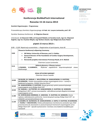 Uniwersytet Rzeszowski al. Rejtana 16c 35-959 Rzeszów Konferencja BioMedTech International Rzeszów 15-16 marca 2013 Komitet Organizacyjno - Programowy Przewodniczący Komitetu Organizacyjnego: dr hab. inż. Lucyna Leniowska, prof. UR Dyrektor Naukowy Konferencji: dr Zbigniew Nawrat Członkowie: dr Sławomir Wilk, dr Krzysztof Malicki, dr Karolina Cynk, mgr inż. Wojciech Żeglicki, mgr inż. Krystian Miąsik, mgr Barbara Gaweł, mgr Małgorzata Kuta-Pałach piątek 15 marca 2013 r. 8:00 – 12:00 Rejestracja uczestników • Registration of participants, Aula A0 Otwarcie Konferencji • Opening Ceremony 9:00 • • • JM Rektor University of Rzeszow, prof. A. Bobko, General Director of the Foundation of Cardiac Surgery Development, dr J. Sarna Kierownik projektu Internetowa Promocja Nauki, dr K. Malicki Chairman Lucyna Leniowska 9:15 Referat plenarny • Plenary Lecture J.CWANEK, V.LIUBIMOV, Wybrane zagadnienia bioprotezoplastyki stawu biodrowego SESJA SZTUCZNE NARZĄDY Chairman Janusz Cwanek 10:00 10:20 10:40 11:00 11:20 W.BUJOK, M. DARŁAK, L. WILCZYŃSKI, M. GAWLIKOWSKI, R. KUSTOSZ, M.GONSIOR, Polskie wszczepialne pompy wspomagania serca – rozwój w badaniach programu „Polskie Sztuczne Serce” M. GAWLIKOWSKI, R. KUSTOSZ, Nowej generacji system pozaustrojowego wspomagania serca Religa Heart EXT M. DARŁAK, J. ALTYNTSEV, M. GAWLIKOWSKI, R. KUSTOSZ, M. GONSIOR, ReligaHeart–ROT: wirowa wszczepialna odśrodkowa pompa długoterminowego wspomagania serca M. KOŚCIELNIAK-ZIEMNIAK, K. JANICZAK, R. KUSTOSZ, M. GONSIOR, Ocena wpływu oddziaływania polimerów konstrukcyjnych pompy Religa Heart EXT na składniki czerwonokrwinkowe krwi A.SZUBER, M. GŁOWACKI, M. GAWLIKOWSKI, A. KAPIS, R. KUSTOSZ, M.GONSIOR, T. RUSIN, T. MACHOCZEK, Polska jednodyskowa mechaniczna zastawka typu Moll przeznaczona do stosowania w pozaustrojowych komorach wspomagania serca Religa Heart EXT - Sposób wytwarzania i montażu oraz badania kwalifikacyjne zastawek Projekt współfinansowany ze środków Unii Europejskiej w ramach Europejskiego Funduszu Społecznego tel. +48 17 872 13 43 [email protected] www.inprona.pl Przerwa • Break 11:40 SESJA ROBOTY MEDYCZNE Chairman Lucyna Leniowska Referat plenarny • Plenary Lecture 12:00 13:00 13:20 13:40 K. WARWICK, The Diminishing Human-Machine Interface Z. NAWRAT, The Robin Heart – achievements and perspectives of Polish surgical robot G. ILEWICZ, Z. NAWRAT, K. SOKOŁOWSKA, Projektowanie mechatroniczne, optymalizacja i bioinżynieria telemanipulatora torakokardichirurgicznego Z. MAŁOTA, Z. NAWRAT, P. KOSTKA, W. SADOWSKI, P. RYBKA, K. ROHR, Stanowiska treningowo-badawcze narzędzi i robotów chirurgicznych Fundacji Rozwoju Kardiochirurgii w Zabrzu 14:00 Lunch SESJA ROBOTY MEDYCZNE Chairman Zbigniew Nawrat 15:00 15:20 15:40 L. LENIOWSKA, R. LENIOWSKI, Prototyp wieloczłonowego robota chirurgicznego ROCH-1 M. GROCHOWINA , R.LENIOWSKI, L. LENIOWSKA, Ocena napędów firmy Faulhaber pod kątem projektowania układu sterowania robota chirurgicznego ROCH-1 K. LIS Ł. MUCHA, K. ROHR, 3D Force Feadback Sleeve Using micro Vibration Motors Przerwa • Break 16:00 SESJA BIOINŻYNIERIA Chairman Zbigniew Nawrat 16:20 16:40 17:00 17:20 17:40 18:00 18:20 18:40 G. ILEWICZ, Superrozdzielcza fotonooptyka Fluorescencyjna sted w naukach biologicznych i fizyce K. WALICKA -CUPRYŚ, J. DRZAŁ – GRABIEC, M. RACHWAŁ, A. KUŻDŻAŁ, Wybrane metody diagnostyki i wizualizacji postawy ciała człowieka K.MITURA, I. GISTEREK, P.CEYNOWA , G.PICH, R.WOŚ, K.ADACH, Badania mikrobiologiczne bioaktywnych proszków nanodiamentowych modyfikowanych chemicznie D.PRUSKA-PICH , M.WACHOWICZ, , I. GISTEREK, K. MITURA, Doświadczenia własne w ocenie jakości napromieniania przy pomocy zdjęć portalowych A.PIÓRKOWSKI, A.KEMPNY , P. PIĄTEK, A.GACKOWSKI, K. KIPIEL, Symulator echokardiografii przezprzełykowej CT2TEE – nowoczesna metoda edukacji P. WOŹNIAK, M. KOTULSKA, Characteristics of contact sites with regard to protein topology M. PIĘTAL, J. BUJNICKI, PROTMAP2D & RNAmap2D: zestaw narzędzi bioinformatycznych do analiz ilościowych i jakościowych map kontaktów białek, kwasów nukleinowych i ich kompleksów Welcome Party wejdź na inprona.pl Uniwersytet Rzeszowski al. Rejtana 16c 35-959 Rzeszów tel. +48 17 872 13 43 [email protected] www.inprona.pl SESJA STUDENCKA Chairman Wojciech Rdzanek 16:20 16:40 17:00 17:20 17:40 18:40 J.MEISSNER, R.LENIOWSKI, Zastosowanie standardu DICOM do wyznaczania przestrzeni operacyjnej M.KUBASIK, R.LENIOWSKI, Avatar – moduł graficzny informatycznej metody diagnozowania chodu pacjenta A.BRÓŻ, Wpływ szumu o średniej szerokości pasma na zrozumiałość mowy E. OLEJARZ, Wpływ hałasu wąskopasmowego na zrozumiałość mowy K. SZAJNOWSKA, Wpływ kanionu akustycznego na organizm człowieka Welcome Party Sesja Bioetyka sobota 16 marca 2013 r. 9.00 10.00 10.20 10.40 11.00 11.20 11.40 11.50 12.10 12.20 Referat plenarny • Plenary Lecture A.WIERCIŃSKI , Hermeneutics of Medicine: The Phronetic Dimension of Medical Ethics Z.NAWRAT, Etyka ery sztucznych narządów M.KAWALSKI, Ethics – challenges and questions in personal and medical robotics W.NOWAK, Utopia jako mit konsolacyjny K.CYNK , Moralny spór o genetyczne ulepszanie człowieka Przerwa • Break SESJA LAUREATÓW BIOMEDTECH SILESIA Laureat SESJI BIOMEDTECH SILESIA SENIOR M.BREGUŁA, Moje pasje – Życie po transplantacji serca M.BREGUŁA i K.PILSZAK , Etyczne problemy transplantacji serca Laureat SESJI BIOMEDTECH SILESIA Junior UCZEŃ Szymon Baluszek, Mielcarska Sylwia, S.MIELCARSKA, S. BALUSZEK., Fizyka w praktyce, czyli dziesięć sposobów na wykorzystanie kropek kwantowych w medycynie. Laureaci SESJI BIOMEDTECH SILESIA Junior STUDENT Fullen Marta, K.BIEZUŃSKA-KUSIAK, M.KOTULSKA, J.KULBACKA, J.SACZKO. Evaluation of anticancer efficiency of calcium in human breast cancer cells (MCF-7/WT and MCF7/DX) subjected to electroporation. Goede Arkadiusz, T.WANDTKE, J.WIELIKDZIEŃ. Wykorzystanie interferencji RNA