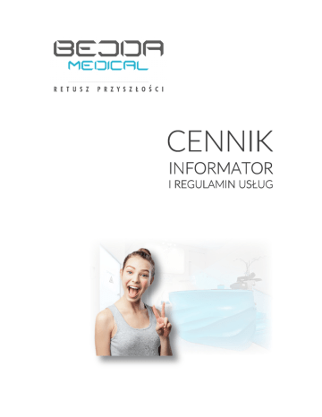 CENNIK INFORMATOR I REGULAMIN USŁUG 23.09.2015 FILOZOFIA I INFORMACJE OGÓLNE BEJDA MEDICAL jest polską firmą medyczną ze 100% polskim kapitałem, której główną misją i celem jest opracowywanie oraz wdrażanie innowacyjnych terapii, integrujących najnowsze technologie i odkrycia medyczne we współpracy z polskimi oraz światowymi placówkami naukowymi. Centrum Dermatologii, Laseroterapii i Medycyny Estetycznej powstało w 2014 roku, jako flagowy projekt BEJDA MEDICAL. MEDICAL Centrum oferuje najwyższy poziom usług medycznych z zakresu szeroko pojętej dermatologii, ambulatoryjnej chirurgii plastycznej, laseroterapii, medycyny estetycznej i kosmetologii w oparciu o najlepsze technologie laserowe i inteligentne kosmoceutyki. Naszym priorytetem jest kompleksowa diagnoza i terapia pacjentów z zastosowaniem przełomowych procedur oraz innowacyjnych urządzeń medycznych. W zakresie działań medycznych współpracujemy z Wydziałem Fizyki Fizyki Politechniki Łódzkiej oraz Oddziałem Klinicznym Chirurgii Plastycznej, Rekonstrukcyjnej i Estetycznej z Odcinkiem dla Dzieci Uniwersyteckiego Szpitala Klinicznego im. Norberta Barlickiego Uniwersytetu Medycznego w Łodzi. Łodzi 1. Stawiając na pierwszym miejscu zdrowie i dobro pacjenta, wykwalifikowana kadra lekarzy i kosmetologów BEJDA MEDICAL przedstawi wszystkie możliwe warianty terapii. W zależności od problemu i potrzeb dobierzemy najefektywniejszy program z uwzględnieniem terapii łączących różne rodzaje zabiegów. 2. Pacjent w celu finansowania usługi może skorzystać z systemu ratalnego MediRaty. MediRaty Szczegółowe informacje na Recepcji Centrum. 2|S trona UL. SOKOŁOWSKA 9 LOK. U28, 01-142 WARSZAWA +48 22 370 29 60 / BEJDA.PL / [email protected] NR KSIĘGI REJ. PODMIOTU LECZNICZEGO: 000000165700 23.09.2015 3. Wszystkie podane ceny są maksymalnymi cenami brutto za jeden zabieg (w przypadku widełek cenowych maksymalną ceną jest wyższa z kwot). Ilość zabiegów oraz ostateczna cena ustalana jest na podstawie takich czynników jak: 3.1. dokładna powierzchnia obszaru, 3.2. ilość i zaawansowanie zmian poddawanych zabiegowi, 3.3. ilość zużytych materiałów (w przypadku zabiegów estetycznych – kwas hialuronowy, toksyna botulinowa itp.). 4. Jeśli wymagane, znieczulenie maściami, kremami bądź iniekcyjnymi środkami do znieczulenia miejscowego jest wliczone w cenę zabiegu. 5. Jeśli podczas wizyty u lekarza wykonywany jest zabieg, pacjent nie płaci za konsultację – jedynie za zabieg. Jeśli zabieg został umówiony na inny termin (z dowolnej przyczyny), pacjent płaci za konsultację, a cena zabiegu podczas kolejnej wizyty zostanie pomniejszona o kwotę w wysokości 50% wartości konsultacji. 6. W przypadku części ciała występujących w parach (np. policzki, dłonie, uda itd.), podana cena dotyczy pary. 7. Cennik nie stanowi oferty w rozumieniu przepisów Kodeksu Cywilnego. 8. Cennik w wersji papierowej jest dostępny na recepcji w Centrum BEJDA MEDICAL. MEDICAL DEFINICJE I REGULACJE 1. Konsultacja to zastosowanie wiedzy i doświadczenia specjalisty z danej dziedziny w indywidualnym i konkretnym przypadku danego pacjenta. 2. Konsultacje dzielą się na konsultacje lekarskie oraz konsultacje kosmetologiczne. 3. Konsultacje lekarskie dzielą się według specjalizacji. 4. Pierwsza wizyta pacjenta w Centrum jest zawsze konsultacją. 5. Konsultacja lekarska jest płatna według ustalonych stawek; konsultacja związana bezpośrednio z zabiegiem i udzielana bezpośrednio przed lub po zabiegu jest wliczona w cenę zabiegu. 6. Konsultacja kosmetologiczna jest bezpłatna. 7. Zabiegi lekarskie oraz kosmetologiczne, którym pacjent ma być poddany w Centrum po raz pierwszy, zawsze są poprzedzone konsultacją. 3|S trona UL. SOKOŁOWSKA 9 LOK. U28, 01-142 WARSZAWA +48 22 370 29 60 / BEJDA.PL / [email protected] NR KSIĘGI REJ. PODMIOTU LECZNICZEGO: 000000165700 23.09.2015 8. Kolejne zabiegi tego samego typu, jeśli nie pojawiły się nowe przeciwwskazania, mogą być wykonywane bez konsultacji. 9. Konsultacje według specjalizacji, badania specjalistyczne oraz zabiegi są rozliczane niezależnie od siebie; wyjątek stanowi sytuacja z punktu 5. 10. W gabinecie mogą naraz przebywać maksymalnie dwie osoby - pacjent i jego opiekun. 11. Prosimy o zachowanie względnej ciszy w Centrum. 12. Prosimy o niespożywanie posiłków. 13. Prosimy o zachowanie czystości. 14. Kompleksowe informacje o zabiegach są dostępne na stronie internetowej BEJDA MEDICAL oraz są udzielane osobiście, telefonicznie oraz drogą e-mail’ową przez kadrę na recepcji. Zalecamy zapoznanie się ze wskazaniami oraz przeciwskazaniami do wykonania konkretnych zabiegów przed umówieniem wizyty. CENNIK KONSULTACJI I ZABIEGÓW KONSULTACJE LEKARSKIE Konsultacja Cena Konsultacja lekarska - dermatologia 200 zł Konsultacja lekarska – chirurgia plastyczna 200 zł Konsultacja profesorska – chirurgia plastyczna 280 zł 4|S trona UL. SOKOŁOWSKA 9 LOK. U28, 01-142 WARSZAWA +48 22 370 29 60 / BEJDA.PL / [email protected] NR KSIĘGI REJ. PODMIOTU LECZNICZEGO: 000000165700 23.09.2015 BADANIA LEKARSKIE Dermatoskopia Cena* 1-3 1-5 zmian 200 zł Każda kolejna zmiana do 10 zmian 50 zł 30 zł Każda kolejna zmiana powyżej 10 zmian 30 zł BADANIA DIAGNOSTYCZNE PATRZ ZAŁĄCZNIK NR 1 DERMATOCHIRURGIA ELEKTROCHIRURGIA, KRIOCHIRURGIA I CHIRURGIA LASEROWA BECHTOLD ELTRON 120 / BRYMILL CRY-AC®-3 B-800 / ASCLEPION MULTIPULSE CO2 / ASCLEPION QUADROSTAR PRO YELLOW PRZECIWWSKAZANIA ASCLEPION MULTIPULSE CO2 / ASCLEPION QUADROSTARPRO YELLOW (chirurgia laserowa) • ciąża, karmienie piersią, • zmiany nowotworowe, • zaburzenia krzepnięcia (względne), • zaburzenia czucia (względne), • zaburzenia krążenia (względne), 5|S trona UL. SOKOŁOWSKA 9 LOK. U28, 01-142 WARSZAWA +48 22 370 29 60 / BEJDA.PL / [email protected] NR KSIĘGI REJ. PODMIOTU LECZNICZEGO: 000000165700 23.09.2015 • wrażliwość na światło, • świeża opalenizna / korzys
