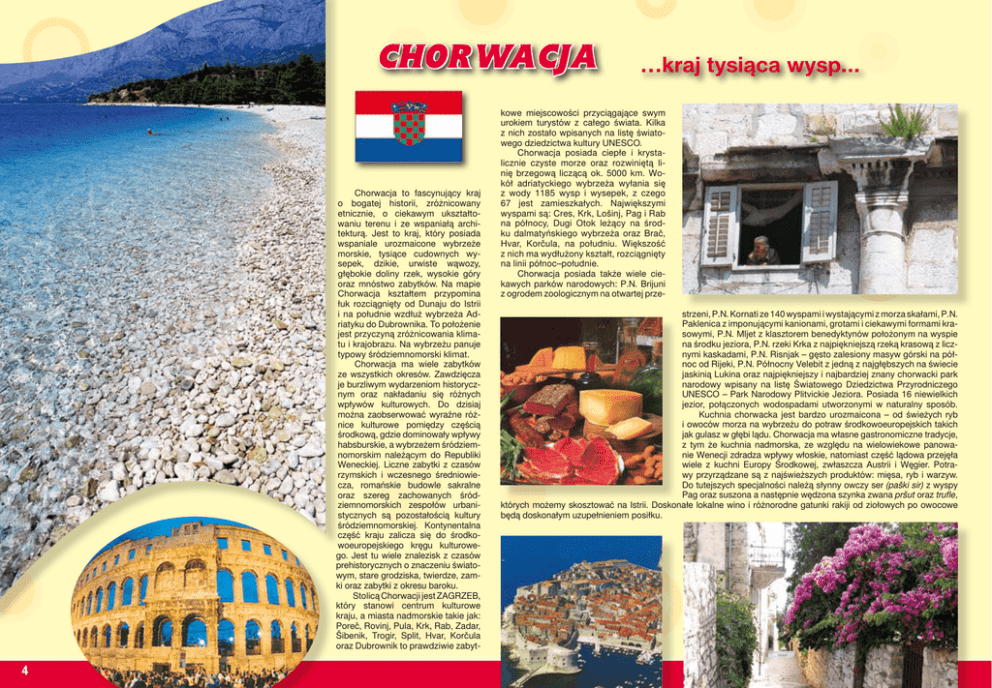 CHORWACJA Chorwacja to fascynujący kraj o bogatej historii, zróżnicowany etnicznie, o ciekawym ukształtowaniu terenu i ze wspaniałą architekturą. Jest to kraj, który posiada wspaniale urozmaicone wybrzeże morskie, tysiące cudownych wysepek, dzikie, urwiste wąwozy, głębokie doliny rzek, wysokie góry oraz mnóstwo zabytków. Na mapie Chorwacja kształtem przypomina łuk rozciągnięty od Dunaju do Istrii i na południe wzdłuż wybrzeża Adriatyku do Dubrownika. To położenie jest przyczyną zróżnicowania klimatu i krajobrazu. Na wybrzeżu panuje typowy śródziemnomorski klimat. Chorwacja ma wiele zabytków ze wszystkich okresów. Zawdzięcza je burzliwym wydarzeniom historycznym oraz nakładaniu się różnych wpływów kulturowych. Do dzisiaj można zaobserwować wyraźne różnice kulturowe pomiędzy częścią środkową, gdzie dominowały wpływy habsburskie, a wybrzeżem śródziemnomorskim należącym do Republiki Weneckiej. Liczne zabytki z czasów rzymskich i wczesnego średniowiecza, romańskie budowle sakralne oraz szereg zachowanych śródziemnomorskich zespołów urbanistycznych są pozostałością kultury śródziemnomorskiej. Kontynentalna część kraju zalicza się do środkowoeuropejskiego kręgu kulturowego. Jest tu wiele znalezisk z czasów prehistorycznych o znaczeniu światowym, stare grodziska, twierdze, zamki oraz zabytki z okresu baroku. Stolicą Chorwacji jest ZAGRZEB, który stanowi centrum kulturowe kraju, a miasta nadmorskie takie jak: Poreč, Rovinj, Pula, Krk, Rab, Zadar, Šibenik, Trogir, Split, Hvar, Korčula oraz Dubrownik to prawdziwie zabyt- 4 …kraj tysiąca wysp... kowe miejscowości przyciągające swym urokiem turystów z całego świata. Kilka z nich zostało wpisanych na listę światowego dziedzictwa kultury UNESCO. Chorwacja posiada ciepłe i krystalicznie czyste morze oraz rozwiniętą linię brzegową liczącą ok. 5000 km. Wokół adriatyckiego wybrzeża wyłania się z wody 1185 wysp i wysepek, z czego 67 jest zamieszkałych. Największymi wyspami są: Cres, Krk, Lošinj, Pag i Rab na północy, Dugi Otok leżący na środku dalmatyńskiego wybrzeża oraz Brač, Hvar, Korčula, na południu. Większość z nich ma wydłużony kształt, rozciągnięty na linii północ–południe. Chorwacja posiada także wiele ciekawych parków narodowych: P.N. Brijuni z ogrodem zoologicznym na otwartej przestrzeni, P.N. Kornati ze 140 wyspami i wystającymi z morza skałami, P.N. Paklenica z imponującymi kanionami, grotami i ciekawymi formami krasowymi, P.N. Mljet z klasztorem benedyktynów położonym na wyspie na środku jeziora, P.N. rzeki Krka z najpiękniejszą rzeką krasową z licznymi kaskadami, P.N. Risnjak – gęsto zalesiony masyw górski na północ od Rijeki, P.N. Północny Velebit z jedną z najgłębszych na świecie jaskinią Lukina oraz najpiękniejszy i najbardziej znany chorwacki park narodowy wpisany na listę światowego dziedzictwa przyrodniczego UNESCO – Park Narodowy Plitvickie Jeziora. Posiada 16 niewielkich jezior, połączonych wodospadami utworzonymi w naturalny sposób. Kuchnia chorwacka jest bardzo urozmaicona – od świeżych ryb i owoców morza na wybrzeżu do potraw środkowoeuropejskich takich jak gulasz w głębi lądu. Chorwacja ma własne gastronomiczne tradycje, z tym że kuchnia nadmorska, ze względu na wielowiekowe panowanie Wenecji zdradza wpływy włoskie, natomiast część lądowa przejęła wiele z kuchni Europy Środkowej, zwłaszcza Austrii i Węgier. Potrawy przyrządzane są z najświeższych produktów: mięsa, ryb i warzyw. Do tutejszych specjalności należą słynny owczy ser (paški sir) z wyspy Pag oraz suszona a następnie wędzona szynka zwana pršut oraz trufle, których możemy skosztować na Istrii. Doskonałe lokalne wino i różnorodne gatunki rakiji od ziołowych po owocowe będą doskonałym uzupełnieniem posiłku. ISTRIA Istria to największy chorwacki półwysep w kształcie serca, a zarazem część wybrzeża najbliższa mieszkańcom Europy Środkowej. Stolicą półwyspu jest Pazin ale rolę głównego miasta pełni Pula. Do lat 50-tych Istria była częścią Włoch, więc do dziś wielu mieszkańców posługuje się na co dzień językiem włoskim. Także w dużej części półwyspu nazwy miejscowości podawane są w dwóch językach. Zachodnie wybrzeże Istrii jest praktycznie jedynym tak dużym obszarem w Chorwacji, gdzie wysokie góry nie schodzą bezpośrednio do morza. Dlatego niedaleko plaż można natknąć się na przykład na pola kukurydzy. Na wybrzeżu przeplatają się renomowane kurorty turystyczne: elitarny i sportowy Umag, wczesnoromański i wczesnochrześcijański Poreč, antyczna Pula, śródziemnomorska perła Rovinj z przepiękną architekturą i parkami, śliczny i idylliczny Novigrad, Medulin i Rabac oraz znane na całym świecie centrum naturystyczne Vrsar. Na wybrzeżu jest wiele przepięknych i malowniczych miasteczek. Dodatkowo bardzo rozwinięta linia brzegowa z wieloma zielonymi wyspami i zatokami sprawia, że Istria jest wyjątkowo piękna. UMAG – pierwsza turystyczna miejscowość po przekroczeniu słoweńsko-chorwackiej granicy, położona 50 km od Włoch, 16 km od Słowenii i 80 km od głównych lotnisk: Ronchi, Trst, Italija. Miasto zachowało szereg wąskich uliczek, średniowieczną urbanizację, renesansowe i barokowe budowle. Raz w roku odbywa się tutaj Międzynarodowy Turniej Tenisa Ziemnego – ATP – TOUR. POREČ – dawne rzymskie miasto Parentium, leżące w zachodniej części półwyspu Istria. Od tysiącleci zachęca turystów łagodnym śródziemnomorskim klimatem oraz różnorodną fauną i florą. W starej części miasta został zachowany rzymski układ urbanistyczny oraz wiele zabytków stylu gotyckiego i romańskiego. Główną atrakcją starówki jest Bazylika Eufrazjana z VI wieku, gdzie można podziwiać wspaniale zachowane złote bizantyjskie mozaiki. ROVINJ – malownicze rybackie miasteczko położone