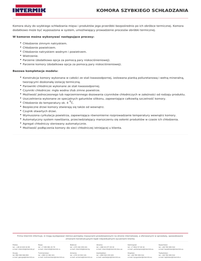 KOMORA SZYBKIEGO SCHŁADZANIA Komora służy do szybkiego schładzania mięsa i produktów jego przeróbki bezpośrednio po ich obróbce termicznej. Komora dodatkowo może być wyposażona w system, umożliwiający prowadzenie procesów obróbki termicznej. W komorze można wykonywać następujące procesy: Chłodzenie zimnym natryskiem. Chłodzenie powietrzem. Chłodzenie natryskiem wodnym i powietrzem. Wietrzenie. Parzenie (dodatkowa opcja za pomocą pary niskociśnieniowej). Parzenie komory (dodatkowa opcja za pomocą pary niskociśnieniowej). Bazowa kompletacja modelu: Konstrukcja komory wykonana w całości ze stali kwasoodpornej, izolowana pianką poliuretanową i wełną mineralną, tworzącymi doskonałą izolację termiczną. Parowniki chłodnicze wykonane ze stali kwasoodpornej. Czynniki chłodnicze: mgła wodna i/lub zimne powietrze. Możliwość jednoczesnego lub naprzemiennego dozowania czynników chłodniczych w zależności od rodzaju produktu. Uszczelnienia wykonane ze specjalnych gatunków silikonu, zapewniające całkowitą szczelność komory. 0 Chłodzenie do temperatury ok. 4 C. Bezpieczne drzwi komory otwierają się także od wewnątrz. Czujnik otwartych drzwi. Wymuszona cyrkulacja powietrza, zapewniająca równomierne rozprowadzanie temperatury wewnątrz komory. Automatyczny system nawilżania, przeciwdziałający marszczeniu się osłonki produktów w czasie ich chłodzenia. Agregat chłodniczy sterowany automatycznie. Możliwość podłączenia komory do sieci chłodniczej istniejącej u klienta. Firma Intermik informuje, iż mogą występować różnice pomiędzy maszynami przedstawionymi na stronie internetowej, a oferowanymi w sprzedaży, spowodowane zmianami konstrukcyjnymi bądź indywidualnymi życzeniami klienta. Polska: Rosja: Białoruś: Ukraina: Kaliningrad: Kazachstan: tel.: +48 22 633 42 85 tel. +7 495 981 25 70 tel. +375 162 259 221 tel. +380 44 277 29 34 tel. +7 4012 57 40 16 tel. +48 795 509 314 e-mail: [email protected] e-mail: [email protected] e-mail: [email protected] e-mail: [email protected] e-mail: [email protected] e-mail: [email protected] Gruzja: Turkmenistan: Armenia: Azerbejdżan: Kirgistan: Tadżykistan: tel. 995 599 566 850 tel. +993 12 362 421 tel. +374 10 550 141 tel. +994 502 235 025 tel. +48 795 509 314 tel. +48 795 509 314 e-mail: [email protected] e-mail: [email protected] e-mail: [email protected] e-mail: [email protected] e-mail: [email protected] e-mail: [email protected]