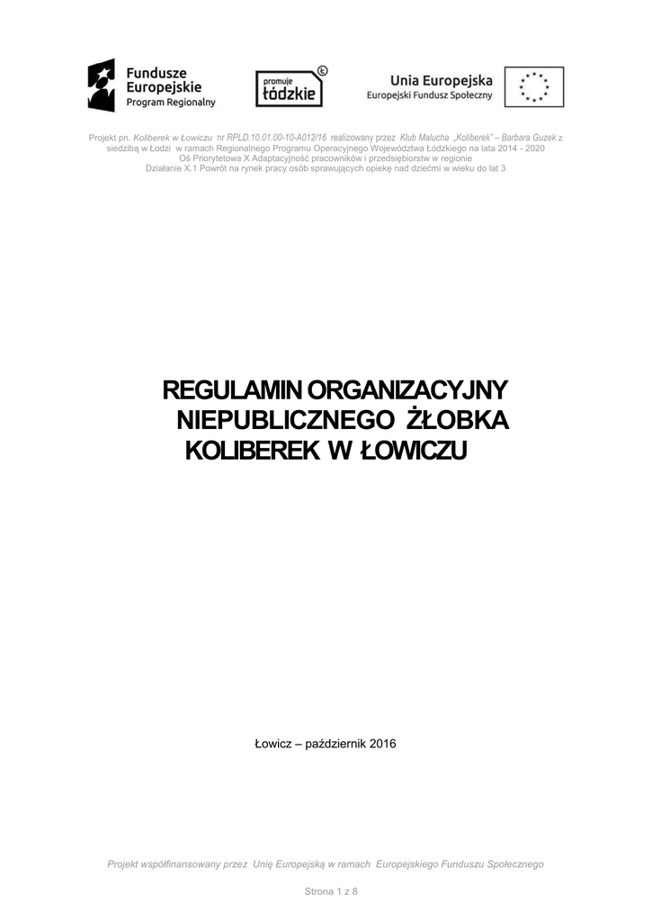 Projekt pn. Koliberek w Łowiczu nr RPLD.10.01.00-10-A012/16 realizowany przez Klub Malucha „Koliberek” – Barbara Guzek z siedzibą w Łodzi w ramach Regionalnego Programu Operacyjnego Województwa Łódzkiego na lata 2014 - 2020 Oś Priorytetowa X Adaptacyjność pracowników i przedsiębiorstw w regionie Działanie X.1 Powrót na rynek pracy osób sprawujących opiekę nad dziećmi w wieku do lat 3 REGULAMIN ORGANIZACYJNY NIEPUBLICZNEGO ŻŁOBKA KOLIBEREK W ŁOWICZU Łowicz – październik 2016 Projekt współfinansowany przez Unię Europejską w ramach Europejskiego Funduszu Społecznego Strona 1 z 8 Projekt pn. Koliberek w Łowiczu nr RPLD.10.01.00-10-A012/16 realizowany przez Klub Malucha „Koliberek” – Barbara Guzek z siedzibą w Łodzi w ramach Regionalnego Programu Operacyjnego Województwa Łódzkiego na lata 2014 - 2020 Oś Priorytetowa X Adaptacyjność pracowników i przedsiębiorstw w regionie Działanie X.1 Powrót na rynek pracy osób sprawujących opiekę nad dziećmi w wieku do lat 3 Żłobek Koliberek w Łowiczu przy ul. Braterskiej 1 99-400 Łowicz działa na podstawie: 1. Ustawy z dnia 4 lutego 2011 r. o opiece nad dziećmi w wieku do lat 3 (Dz. U. Nr 45, poz. 235 ) 2. Statutu Niepublicznego Żłobka Koliberek 3. Niniejszego Regulaminu organizacyjnego I. Postanowienia ogólne §1 1. Regulamin organizacyjny Żłobka określa organizację pracy placówki. 2. Postanowienia Regulaminu organizacyjnego określają w szczególności: a) organizację pracy Żłobka b) ramowy rozkład dnia pobytu dziecka w Żłobku c) obsadę osobową Żłobka; d) zasady funkcjonowania Żłobka; e) zakres współpracy ze Żłobkiem oraz dostęp do informacji o rozwoju dziecka, warunkach i sposobie udzielania świadczeń przez Żłobek 3. Organizację opieki nad dziećmi w Żłobku, w tym: a) prawa i obowiązki rodziców; b) prawa dzieci §2 1. Ze świadczeń Żłobka mogą korzystać dzieci w wieku do 3 lat 2. Żłobek organizuje opiekę nad dziećmi: • od poniedziałku do piątku w godzinach 7.00 – 17.00, • pięć dni w tygodniu, • 12 miesięcy w roku, 3. Dziecko w Żłobku może przebywać maksymalnie do 10 godzin dziennie. 4. Żłobek jest nieczynny we wszystkie dni świąteczne §3 1. Ramowy rozkład dnia pobytu dziecka w Żłobku Koliberek: Projekt współfinansowany przez Unię Europejską w ramach Europejskiego Funduszu Społecznego Strona 2 z 8 Projekt pn. Koliberek w Łowiczu nr RPLD.10.01.00-10-A012/16 realizowany przez Klub Malucha „Koliberek” – Barbara Guzek z siedzibą w Łodzi w ramach Regionalnego Programu Operacyjnego Województwa Łódzkiego na lata 2014 - 2020 Oś Priorytetowa X Adaptacyjność pracowników i przedsiębiorstw w regionie Działanie X.1 Powrót na rynek pracy osób sprawujących opiekę nad dziećmi w wieku do lat 3 GRUPY MALUSZKÓW I i II GODZINY PN WT ŚR CZW PT 7.00-8.20 Schodzenia się dzieci / zabawy wynikające z własnej aktywności i potrzeb dziecka inspirowane przez opiekuna. Kontakty indywidualne – rozmowy, obserwacja (diagnozowanie) zachowań i działań dzieci. 8.20-8.30 Przygotowanie do śniadania (czynności higieniczne) 8.30-9.00 ŚNIADANIE 9.00-9.30 9.30-10.00 KOLIBEREK ANGIELSKI SPACEREK KOLIBEREK DESIGNEREK KOLIBEREK RUCHOWY POMAGIEREK KOLIBEREK DESIGNEREK KOLIBEREK BAJKOLANSEREK KOLIBEREK EMOCJE BEZ ROZTEREK KOLIBEREK ANGIELSKI SPACEREK KOLIBEREK DESIGNEREK KOLIBEREK RUCHOWY POMAGIEREK KOLIBEREK DESIGNEREK 10.00-10.20 Gry i zabawy ruchowe rozwijające procesy poznawcze. 10.20-10.30 Przygotowanie do II śniadania (czynności higieniczne) 10.30-11.00 II ŚNIADANIE 11.00.12.20 Propozycje zadań otwartych sprzyjających twórczej aktywności ruchowej i artystycznej: sportowej, plastycznej, muzycznej, werbalnej. Praca terapeutyczno kompensacyjna z dziećmi o specjalnych potrzebach edukacyjnych oraz z dziećmi uzdolnionymi. Kontynuacja rozpoczętych wcześniej zadań zgodnie z potrzebami i indywidualnym tempem pracy dzieci. 12.20-12.30 Przygotowanie do obiadu (czynności higieniczne) 12.30-13.00 OBIAD 13.00-14.30 Przygotowanie do leżakowania / LEŻAKOWANIE 14.30-15.30 Samodzielnie planowane i organizowane przez dzieci zabawy dowolne: zespołowe i indywidualne. Wspieranie przez opiekuna twórczych inicjatyw dzieci. Czytanie literatury dziecięcej. Dla dzieci chętnych odpoczynek z muzykoterapią. Praca indywidualna kompensacyjno-terapeutyczna. 14.30-15.00 KOLIBEREK BAJEREK KOLIBEREK EUROWOJAŻEREK 14.30-15.30 SESJE IND. Z PSYCHOLOGIEM SESJE IND. Z PSYCHOLOGIEM KOLIBEREK BAJEREK KOLIBEREK EUROWOJAŻEREK SESJE IND. Z PSYCHOLOGIEM 15.30-15.40 Przygotowanie do podwieczorku (czynności higieniczne) 15.40-16.00 PODWIECZOREK 16.00-17.00 Zabawy swobodne/ kierowane /ruchowe/rozchodzenie się dzieci Projekt współfinansowany przez Unię Europejską w ramach Europejskiego Funduszu Społecznego Strona 3 z 8 Projekt pn. Koliberek w Łowiczu nr RPLD.10.01.00-10-A012/16 realizowany przez Klub Malucha „Koliberek” – Barbara Guzek z siedzibą w Łodzi w ramach Regionalnego Programu Operacyjnego Województwa Łódzkiego na lata 2014 - 2020 Oś Priorytetowa X Adaptacyjność pracowników i przedsiębiorstw w regionie Działanie X.1 Powrót na rynek pracy osób sprawujących opiekę nad dziećmi w wieku do lat 3 GRUPY STARSZAKÓW – III i IV GODZINY PN WT ŚR CZW PT 7.00-8.20 Schodzenia się dzieci / zabawy wynikające z własnej aktywności i potrzeb dziecka inspirowane przez opiekuna. Kontakty indywidualne – rozmowy, obserwacja (diagnozowanie) zachowań i działań dzieci. 8.20-8.30 Przygotowanie do śniadania (czynności higieniczne) 8.30-9.00 I ŚNIADANIE 9.00-9.30 9.30-10.00 KOLIBEREK DESIGNEREK KOLIBEREK ANGIELSKI SPACEREK KOLIBEREK DESIGNEREK KOLIBEREK RUCHOWY POMAGIEREK KOLIBEREK EMOCJE BEZ ROZTEREK KOLIBEREK DESIGNEREK KOLIBEREK DESIGNEREK KOLIBEREK BAJKOLANSEREK KOLIBEREK ANGIELSKI SPACEREK KOLIBEREK RUCHOWY POMAGIEREK 10.00-10.20 Gry i zabawy ruchowe rozwijające procesy poznawcze. 10.20-10.30 Przygotowanie do II śniada
