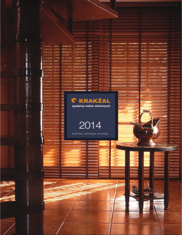 2014 katalog catalogue katalog OKIENNYCH KRAKŻAL SYSTEMY OSŁON OSŁONY MONTOWANE WEWNĄTRZ ŻALUZJE... Żaluzje poziome Hit Isolite Drewniane 50 mm Drewniane 25 mm Żaluzje pionowe ROLETY... Rolety tekstylne łańcuszkowe Rolety tekstylne sprężynowe Roleta tekstylna Stilo Roleta tekstylna Stilo Mini Roleta Fantazja do okien dachowych Roleta tekstylna Rolette ZASŁONY... Zasłony plisowane .04 .05 .06 .07 .08 .09 .10 .11 .12 .13 .14 .15 .16 OSŁONY MONTOWANE NA ZEWNĄTRZ SIATKI... Siatki przeciw owadom ROLETY... Rolety aluminiowe zewnętrzne BRAMY I KRATY ROLOWANE... Bramy rolowane Kraty rolowane MARKIZY... Markizy ŻALUZJE... Żaluzje fasadowe REFLEKSOLE... Refleksole MATY DREWNIANE Maty drewniane bambusowe .17 .18 .19 .20 .21 .22 .23 .24 .03 Dla tych, co cenią funkcjonalność i płynną regulację natężenia światła For those who appreciate functionality and step-less shading control Für Liebhaber von Funktionalität und stufenloser Regelung des Lichteinfalls montowane na lub wewnątrz okna lamele wykonane z aluminium lakierowanego o szerokośi taśmy 25 mm górna i dolna rynna lakierowana w kolorze lameli W wersji do okien dachowych Roof-light version In der Version für Dachfenster sterowanie i podnoszenie żaluzji za pomocą pokrętła i sznurka lub elektrycznie dodatkowo wyposażone w uchyty dolne zapobiegające odchylaniu się żaluzji mounted on or inside the window slats of painted aluminium, 25 mm wide upper and lower gutter painted the colour of slats blind controlled and lifted using a rotary handle and rope arrangement or electrically additional lower clips preventing the blind from swinging down Maskownica rynny górnej Strip hiding upper gutterj Verkleidung der Oberschienej anbringung am oder im Fenster lamellen aus lackiertem Aluminium, Rippenbreite 25 mm ober- und Unterschiene in der Farbe der Lamellen lackiert aufziehen/Herunterlassen per Schnur, Lamelleneinstellung mit Drehgriff, wahlweise elektrisch zusätzlich mit unteren Halterungen ausgestattet, welche ein Flattern der Jalousie verhindern Końcówka sznurka i pokrętła Rope end and handles Schnurende und Drehgriff .04 ŻALUZJE POZIOME NAWIERZCHNIOWE SURFACE-MOUNT HORIZONTAL VENETIAN BLINDS HORIZONTAL-DECKJALOUSIE Nowoczesność i prostota obsługi Modern, easy to use Modernität und Einfachheit in der Bedienung przeznaczone do okien z szybą zespoloną montowane na zewnątrz do listwy przyszybowej lamele wykonane z aluminium lakierowanego o szerokości taśmy 25 mm górny panel maskujący mechanizm wykonany ze stali - w kolorze białym lub brązowym Mechanizm Mechanism Mechanismus sterowanie i podnoszenie za pomocą jednego mechanizmu łańcuszkowego dodatkowe prowadzenie boczne za pomocą żyłki designed for double-glazed windows assembled externally to the pane holding bar slats of painted aluminium, 25 mm wide upper mechanism-hiding panel of steel, white or brown controlled and lifted using one chain mechanism additional side guiding by lines Wpięcie dolne Lower clip Untere Einführung für Fenster mit Kompaktscheiben anbringung außen an der Fensterleiste lamellen aus lackiertem Aluminium, 25 mm breit ummantelung des Mechanismus (oben) aus Stahl, Farbe weiß oder braun aufziehen/Herunterlassen und Lamelleneinstellung mit einem einzigen Kettenmechanismus zusätzliche seitliche Leistenführung Wpięcie łańcuszka Chain clip Ketteneinführung ŻALUZJE POZIOME 25 MM HIT 25 MM HIT HORIZONTAL VENETIAN BLINDS 25-MM-HORIZONTALALOUSIE HIT .05 Stworzone do okien z szybą zespoloną Designed for double-glazed windows Speziell für Fenster mit Kompaktscheiben entwickelt przeznaczone do okien z szybą zespoloną montowane na zewnątrz do listwy przyszybowej Mechanizm Mechanism Mechanismus lamele wykonane z aluminium lakierowanego szerokość taśmy 16 mm - pozwala na umieszczenie całej żaluzji w świetle szyby górny panel maskujący mechanizm wykonany z aluminium - w kolorze białym lub brązowym sterowanie i podnoszenie za pomocą jednego mechanizmu łańcuszkowego lub elektrycznie dodatkowe prowadzenie boczne za pomocą żyłki designed for double-glazed windows assembled externally to the pane holding bar slats of painted aluminium 16 mm wide slats allow the whole blind to fit into the pane space Wpięcie dolne Lower clip Untere Einführung upper mechanism-hiding panel of steel, white or brown controlled and lifted using one chain mechanism or electrically additional side guiding by lines für Fenster mit Kompaktscheiben anbringung außen an der Fensterleiste lamellen aus lackiertem Aluminium die Rippenbreite von 16 mm gestattet die Unterbringung der gesamten Jalousie innerhalb des Fensterrahmens oberes Paneel zur Ummantelung des Mechanismus aus Aluminium, Farbe weiß oder braun aufziehen/Herunterlassen und Lamelleneinstellung mit einem einzigen Kettenmechanismus oder elektrisch zusätzliche seitliche Leistenführung .06 Wpięcie łańcuszka Chain clip Ketteneinführung ŻALUZJE POZIOME 16 MM ISOLITE ISOLITE 16 MM VERTICAL BLINDS 16-MM-HORIZONTALJALOUSIE ISOLITE Podkreślają charakter stylowych, eleganckich wnętrz i gabinetów Stylish for elegant interiors and studies Unterstreichen den Charakter stilvoller, eleganter Inneneinrichtungen montowane we wnęce lub na ścianie lamele wykonane z sezonowanego drewna egzotycznego szerokość lameli 50 mm Listwa maskująca rynnę Gutter-hiding board Leiste zur Verkleidung der Schiene sterowanie i podnoszenie żaluzji za pomocą pokrętła i sznurka możliwość sterowania elektrycznego installed in the recess or on the wall slats of seasoned tropical wood 50 mm wide slats blind control and lifting with a handle/line arrangement electrical control as an option Mechanizm operacyjny Mechanism Betriebsmechanismus anbringung an Fensternische oder Wand lamellen aus abgelagertem exotischem Holz rippenbreite 50 mm aufziehen/Herunterlassen per Schnur, Lamelleneinstellung mit Drehgriff wahlweise elektrisch bedienbar Końcówki sznurków Line ends Schnurenden ŻALUZJE DREW