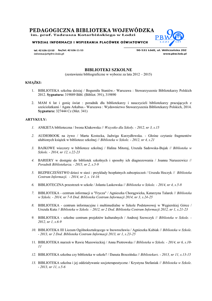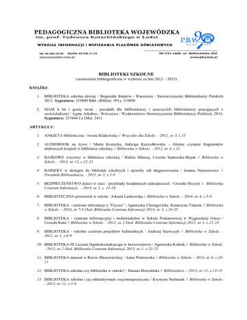 BIBLIOTEKI SZKOLNE (zestawienie bibliograficzne w wyborze za lata 2012 – 2015) KSIĄŻKI: 1. BIBLIOTEKA szkolna dzisiaj / Bogumiła Staniów.- Warszawa : Stowarzyszenie Bibliotekarzy Polskich 2012. Sygnatura: 319889 Bibl. (Bibliot. 391), 319890 2. MAM 6 lat i gonię świat : poradnik dla bibliotekarzy i nauczycieli bibliotekarzy pracujących z sześciolatkami / Agata Arkabus.- Warszawa : Wydawnictwo Stowarzyszenia Bibliotekarzy Polskich, 2014. Sygnatura: 327444 Cz (Met. 341) ARTYKUŁY: 1. ANKIETA biblioteczna / Iwona Klukowska // Wszystko dla Szkoły. - 2012, nr 3, s.15 2. AUDIOBOOK na żywo / Marta Kostecka, Jadwiga Kurzydłowska. - Głośne czytanie fragmentów ulubionych książek w bibliotece szkolnej // Biblioteka w Szkole. - 2012, nr 4, s.21 3. BAJKOWE wieczory w bibliotece szkolnej / Halina Mitoraj, Urszula Sadowska-Bujak // Biblioteka w Szkole. - 2014, nr 12, s.22-23 4. BARIERY w dostępie do bibliotek szkolnych i sposoby ich diagnozowania / Joanna Naruszewicz // Poradnik Bibliotekarza. - 2015, nr 2, s.5-9 5. BEZPIECZEŃSTWO dzieci w sieci : przykłady bezpłatnych zabezpieczeń / Urszula Hoczyk // Biblioteka Centrum Informacji. - 2014, nr 2, s. 14-16 6. BIBLIOTECZNA przestrzeń w szkole / Jolanta Laskowska // Biblioteka w Szkole. - 2014, nr 4, s.5-8 7. BIBLIOTEKA - centrum informacji u "Frycza" / Agnieszka Chorągwicka, Katarzyna Talarek // Biblioteka w Szkole. - 2014, nr 7-8 Dod. Biblioteka Centrum Informacji 2014, nr 3, s.24-25 8. BIBLIOTEKA - centrum informacyjne i multimedialne w Szkole Podstawowej w Węgierskiej Górce / Urszula Kuta // Biblioteka w Szkole. - 2012, nr 2 Dod. Biblioteka Centrum Informacji 2012, nr 1, s.21-23 9. BIBLIOTEKA - szkolne centrum projektów kulturalnych / Andrzej Szewczyk // Biblioteka w Szkole. 2012, nr 1, s.6-9 10. BIBLIOTEKA III Liceum Ogólnokształcącego w Inowrocławiu / Agnieszka Kubiak // Biblioteka w Szkole. - 2013, nr 2 Dod. Biblioteka Centrum Informacji 2013, nr 1, s.23-25 11. BIBLIOTEKA marzeń w Rawie Mazowieckiej / Anna Piotrowska // Biblioteka w Szkole. - 2014, nr 6, s.1011 12. BIBLIOTEKA szkolna czy biblioteka w szkole? / Danuta Brzezińska // Bibliotekarz. - 2013, nr 11, s.13-15 13. BIBLIOTEKA szkolna i jej oddziaływanie socjoterapeutyczne / Krystyna Stefaniak // Biblioteka w Szkole. - 2013, nr 11, s.5-6 14. BIBLIOTEKA szkolna w opinii uczniów / Katarzyna Chojnacka-Musiał // Biblioteka w Szkole. - 2014, nr 5 Dod. Biblioteka Centrum Informacji 2014, nr 2, s.17-18 15. BIBLIOTEKA szkolna wsparciem doradztwa zawodowego / Małgorzata Solecka-Koplin // Biblioteka w Szkole. - 2012, nr 11, s.5-8 16. BIBLIOTEKA Szkoły Podstawowej im. Franciszka Karpińskiego w Zabłudowie / Anna Zdanowicz // Biblioteka w Szkole. - 2012, nr 5 Dod. Biblioteka Centrum Informacji 2012, nr 2, s.25-27 17. BIBLIOTEKA w szkole muzycznej a reforma szkolnictwa artystycznego / Kamil Kościelniak // Biblioteka w Szkole. - 2013, nr 6, s.7 18. BIBLIOTEKA wiślańskiego Koła Macierzy Szkolnej Księstwa Cieszyńskiego / Renata Czyż // Rocznik Wiślański.. – T . 6 (2014), s. 21-29 19. BIBLIOTEKA XXI w. Rozmowy z bibliotekarzami szkolnymi z Otter (Dania) / Elżbieta Rafińska // Biblioteka w Szkole. - 2014, nr 5 Dod. Biblioteka Centrum Informacji 2014, nr 2, s.25-27 20. BIBLIOTEKI publiczne i szkolne - źródłami lektur szkolnych / Zofia Zasacka // Poradnik Bibliotekarza. 2013, nr 5, s.11-15 21. BIBLIOTEKI szkolne - fiasko chmielnickiego eksperymentu / Jolanta Sobielga. - Próby łączenia biblioteka szkolnych z publicznymi // Bibliotekarz. - 2013, nr 4, s.22-23 22. BIBLIOTEKI szkolne umierają... / Dorota Guba // Biblioteka w Szkole. - 2012, nr 11, s.26-27 23. BIBLIOTEKI szkolne w Austrii / Anna Szeląg // Biblioteka w Szkole. - 2012, nr 7-8 Dod. Biblioteka Centrum Informacji 2012, nr 3, s.24-25 24. BIBLIOTEKI szkolne w ustawie o bibliotekach / Jan Ciechorski // Bibliotekarz. - 2012, nr 2, s.26-28 25. BLOG jako narzędzie dydaktyczne w bibliotece szkolnej / Teresa Prokowska // Biblioteka w Szkole. 2014, nr 7-8 Dod. Biblioteka Centrum Informacji 2014, nr 3, s.13-15 26. BOŻONARODZENIOWY festyn misyjny / Izabela Bajak. - Szkolne działania na rzecz dzieci z Afryki. // Biblioteka w Szkole. - 2012, nr 9, s.21 27. BYĆ nauczycielem bibliotekarzem w Portugalii / Jo_U00E3_o Paulo Proença ; tekst w języku polskim przygotowała Jolanta Pytel // Biblioteka w Szkole. - 2013, nr 7-8, Dodatek Biblioteka Centrum Informacji nr 3, s.24-26 28. CAŁY Wrocław czyta dzieciom, a my... przedstawiamy / Izabela Dmowska-Głowacka // Biblioteka w Szkole. -2014, nr 9, s. 28-29 29. CENTRUL de Documentare si Informare Publica, czyli rumuńskie CDI / Bożena Boryczka // Biblioteka w Szkole. - 2015, nr 2 Dod. Biblioteka Centrum Informacji 2015, nr 1, s.24-26 30. CENTRUM edukacyjno-informacyjne "Interdwójka" / Michał Klain // Biblioteka w Szkole. - 2013, nr 7-8, Dodatek Biblioteka Centrum Informacji nr 3, s.22-23 31. CHŁOPACKIE i dziewczyńskie czytanie / Katarzyna John // Biblioteka w Szkole. - 2014, nr 9, s. 10-11 32. CLOUD computing w bibliotece / Agata Arkabus // Biblioteka w Szkole. - 2014, nr 2, Dodatek Biblioteka Centrum Informacji nr 1, s.9-12 33. CO JEST potrzebne bibliotece szkolnej? / Anna Rzędowska // Biblioteka w Szkole. - 2012, nr 7-8, s.38-39 34. CO POLECAM po warsztatach ALICE / Anna Puścińska // Biblioteka w Szkole. - 2014, nr 5 Dod. Biblioteka Centrum Informacji 2014, nr 2, s.9-10 35. CYFROWE kompetencje w cyfrowej bibliotece szkolnej / Wiesława Papierska, Barbara Tomkiewicz // Biblioteka w Szkole. - 2014, nr 3, s.5-6 36. CZY cały ten ambaras z ICIM był nam w ogóle potrzebny? Biblioteka Zespołu Szkół w Wiśniewie / Katarzyna Dyrowska // Biblioteka w Szkole. - 2012, nr 11 Dod. Biblioteka Centrum Informacji 2012, nr 4, s.23-24 37. CZY reformy systemu edukacji w Polsce zmieniły oblicze współczesnej biblioteki szkolnej? / Mirosława Grabowska // Biblioteka - Szkolne Centrum Informacji. - 2012, nr 6, s.23-25 38. CZY twoja biblioteka szkolna działa na rzecz śr
