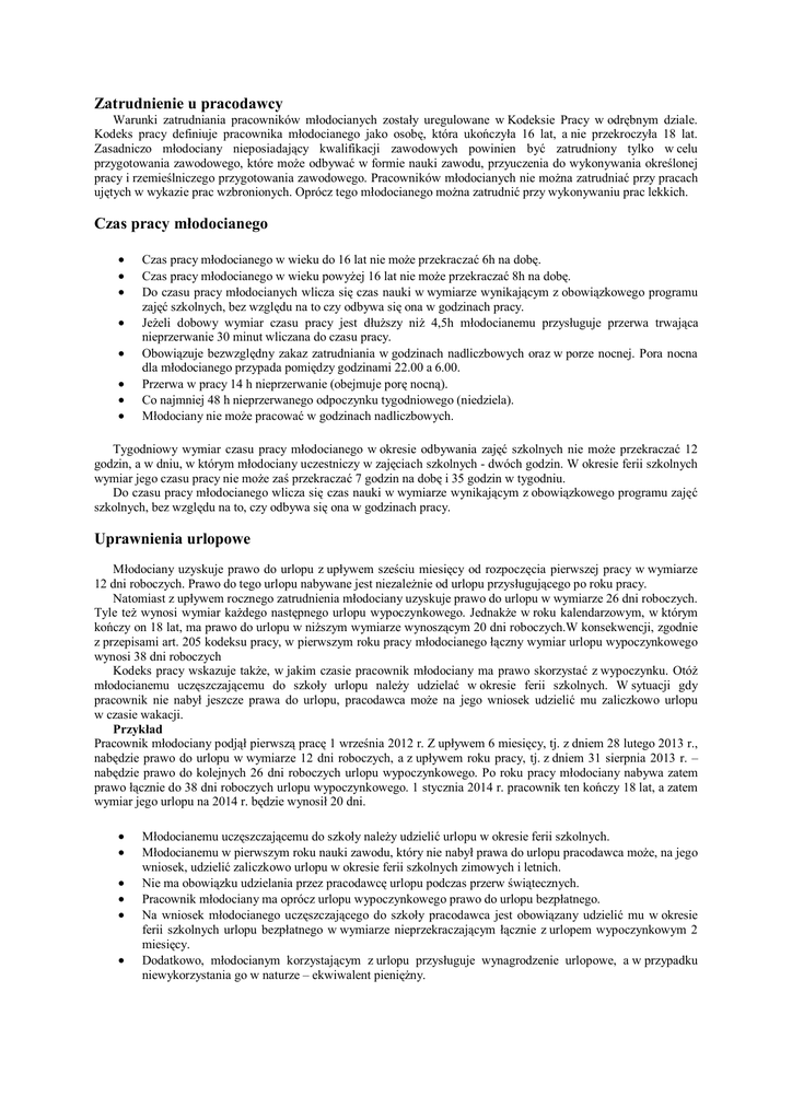 Zatrudnienie u pracodawcy Warunki zatrudniania pracowników młodocianych zostały uregulowane w Kodeksie Pracy w odrębnym dziale. Kodeks pracy definiuje pracownika młodocianego jako osobę, która ukończyła 16 lat, a nie przekroczyła 18 lat. Zasadniczo młodociany nieposiadający kwalifikacji zawodowych powinien być zatrudniony tylko w celu przygotowania zawodowego, które może odbywać w formie nauki zawodu, przyuczenia do wykonywania określonej pracy i rzemieślniczego przygotowania zawodowego. Pracowników młodocianych nie można zatrudniać przy pracach ujętych w wykazie prac wzbronionych. Oprócz tego młodocianego można zatrudnić przy wykonywaniu prac lekkich. Czas pracy młodocianego Czas pracy młodocianego w wieku do 16 lat nie może przekraczać 6h na dobę. Czas pracy młodocianego w wieku powyżej 16 lat nie może przekraczać 8h na dobę. Do czasu pracy młodocianych wlicza się czas nauki w wymiarze wynikającym z obowiązkowego programu zajęć szkolnych, bez względu na to czy odbywa się ona w godzinach pracy. Jeżeli dobowy wymiar czasu pracy jest dłuższy niż 4,5h młodocianemu przysługuje przerwa trwająca nieprzerwanie 30 minut wliczana do czasu pracy. Obowiązuje bezwzględny zakaz zatrudniania w godzinach nadliczbowych oraz w porze nocnej. Pora nocna dla młodocianego przypada pomiędzy godzinami 22.00 a 6.00. Przerwa w pracy 14 h nieprzerwanie (obejmuje porę nocną). Co najmniej 48 h nieprzerwanego odpoczynku tygodniowego (niedziela). Młodociany nie może pracować w godzinach nadliczbowych. Tygodniowy wymiar czasu pracy młodocianego w okresie odbywania zajęć szkolnych nie może przekraczać 12 godzin, a w dniu, w którym młodociany uczestniczy w zajęciach szkolnych - dwóch godzin. W okresie ferii szkolnych wymiar jego czasu pracy nie może zaś przekraczać 7 godzin na dobę i 35 godzin w tygodniu. Do czasu pracy młodocianego wlicza się czas nauki w wymiarze wynikającym z obowiązkowego programu zajęć szkolnych, bez względu na to, czy odbywa się ona w godzinach pracy. Uprawnienia urlopowe Młodociany uzyskuje prawo do urlopu z upływem sześciu miesięcy od rozpoczęcia pierwszej pracy w wymiarze 12 dni roboczych. Prawo do tego urlopu nabywane jest niezależnie od urlopu przysługującego po roku pracy. Natomiast z upływem rocznego zatrudnienia młodociany uzyskuje prawo do urlopu w wymiarze 26 dni roboczych. Tyle też wynosi wymiar każdego następnego urlopu wypoczynkowego. Jednakże w roku kalendarzowym, w którym kończy on 18 lat, ma prawo do urlopu w niższym wymiarze wynoszącym 20 dni roboczych.W konsekwencji, zgodnie z przepisami art. 205 kodeksu pracy, w pierwszym roku pracy młodocianego łączny wymiar urlopu wypoczynkowego wynosi 38 dni roboczych Kodeks pracy wskazuje także, w jakim czasie pracownik młodociany ma prawo skorzystać z wypoczynku. Otóż młodocianemu uczęszczającemu do szkoły urlopu należy udzielać w okresie ferii szkolnych. W sytuacji gdy pracownik nie nabył jeszcze prawa do urlopu, pracodawca może na jego wniosek udzielić mu zaliczkowo urlopu w czasie wakacji. Przykład Pracownik młodociany podjął pierwszą pracę 1 września 2012 r. Z upływem 6 miesięcy, tj. z dniem 28 lutego 2013 r., nabędzie prawo do urlopu w wymiarze 12 dni roboczych, a z upływem roku pracy, tj. z dniem 31 sierpnia 2013 r. – nabędzie prawo do kolejnych 26 dni roboczych urlopu wypoczynkowego. Po roku pracy młodociany nabywa zatem prawo łącznie do 38 dni roboczych urlopu wypoczynkowego. 1 stycznia 2014 r. pracownik ten kończy 18 lat, a zatem wymiar jego urlopu na 2014 r. będzie wynosił 20 dni. Młodocianemu uczęszczającemu do szkoły należy udzielić urlopu w okresie ferii szkolnych. Młodocianemu w pierwszym roku nauki zawodu, który nie nabył prawa do urlopu pracodawca może, na jego wniosek, udzielić zaliczkowo urlopu w okresie ferii szkolnych zimowych i letnich. Nie ma obowiązku udzielania przez pracodawcę urlopu podczas przerw świątecznych. Pracownik młodociany ma oprócz urlopu wypoczynkowego prawo do urlopu bezpłatnego. Na wniosek młodocianego uczęszczającego do szkoły pracodawca jest obowiązany udzielić mu w okresie ferii szkolnych urlopu bezpłatnego w wymiarze nieprzekraczającym łącznie z urlopem wypoczynkowym 2 miesięcy. Dodatkowo, młodocianym korzystającym z urlopu przysługuje wynagrodzenie urlopowe, a w przypadku niewykorzystania go w naturze – ekwiwalent pieniężny. ,Wynagrodzenia młodocianego Zaniżanie wynagrodzenia na rzecz młodocianych, jak również nieterminowe i nieprawidłowe jego wypłacanie jest wykroczeniem przeciwko prawom pracownika. Młodociany ma także prawo – na zasadach ogólnych – do wynagrodzenia za czas niezdolności do pracy na skutek choroby lub wypadku przy pracy, a następnie do zasiłku chorobowego. Młodocianemu w okresie nauki zawodu przysługuje wynagrodzenie obliczane w stosunku procentowym do przeciętnego miesięcznego wynagrodzenia w gospodarce narodowej w poprzednim kwartale, obowiązującego od pierwszego dnia następnego miesiąca po ogłoszeniu przez Prezesa Głównego Urzędu Statystycznego w Dzienniku Urzędowym Rzeczypospolitej Polskiej Monitor Polski. Stosunek procentowy tego wynagrodzenia wynosi: w pierwszym roku nauki - nie mniej niż 4 proc., w drugim roku - nie mniej niż 5 proc., a w trzecim roku nauki - nie mniej niż 6 proc. Rozwiązanie umowy Rozwiązanie umowy o pracę zawartej w celu przygotowania zawodowego może nastąpić za wypowiedzeniem jedynie w przypadkach: niewypełniania przez młodocianego pracownika obowiązkow wynikających z umowy o pracę lub obowiązku dokształcania, pomimo stosowania wobec niego środków wychowawczych, ogłoszenia likwidacji lub upadłości zakładu, reorganizacji zakładu w taki sposób, że w jej wyniku niemożliwe jest zrealizowanie programu praktycznej nauki zawodu, stwierdzenia nieprzydatności młodocianego do pracy w danym zawodzie (np. ze względów zdrowotnych). Wykaz