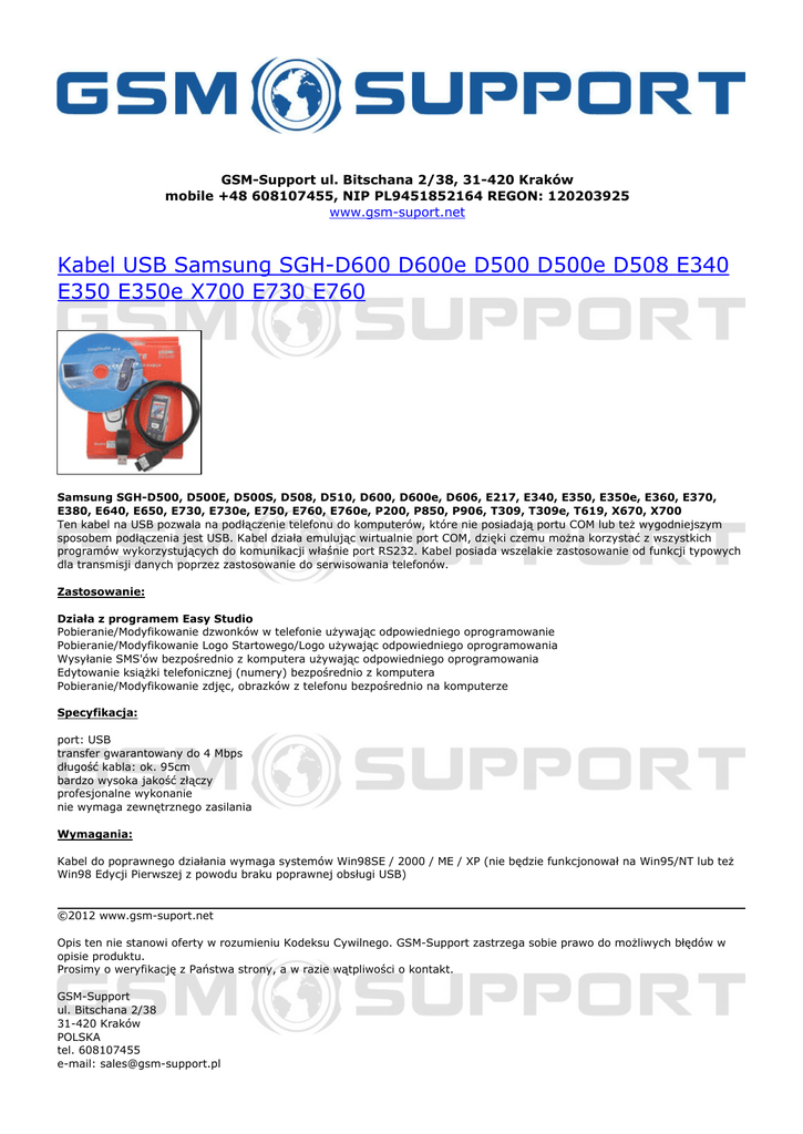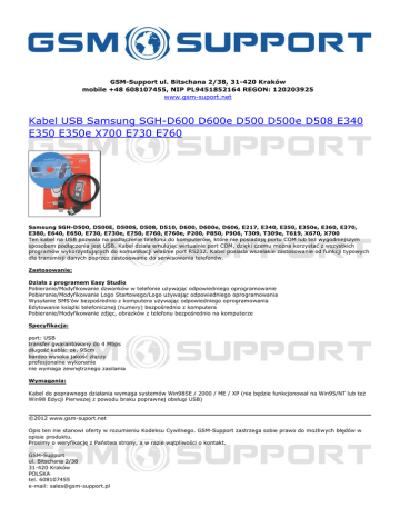 GSM-Support ul. Bitschana 2/38, 31-420 Kraków mobile +48 608107455, NIP PL9451852164 REGON: 120203925 www.gsm-suport.net Kabel USB Samsung SGH-D600 D600e D500 D500e D508 E340 E350 E350e X700 E730 E760 Samsung SGH-D500, D500E, D500S, D508, D510, D600, D600e, D606, E217, E340, E350, E350e, E360, E370, E380, E640, E650, E730, E730e, E750, E760, E760e, P200, P850, P906, T309, T309e, T619, X670, X700 Ten kabel na USB pozwala na podłączenie telefonu do komputerów, które nie posiadają portu COM lub też wygodniejszym sposobem podłączenia jest USB. Kabel działa emulując wirtualnie port COM, dzięki czemu można korzystać z wszystkich programów wykorzystujących do komunikacji właśnie port RS232. Kabel posiada wszelakie zastosowanie od funkcji typowych dla transmisji danych poprzez zastosowanie do serwisowania telefonów. Zastosowanie: Działa z programem Easy Studio Pobieranie/Modyfikowanie dzwonków w telefonie używając odpowiedniego oprogramowanie Pobieranie/Modyfikowanie Logo Startowego/Logo używając odpowiedniego oprogramowania Wysyłanie SMS'ów bezpośrednio z komputera używając odpowiedniego oprogramowania Edytowanie książki telefonicznej (numery) bezpośrednio z komputera Pobieranie/Modyfikowanie zdjęc, obrazków z telefonu bezpośrednio na komputerze Specyfikacja: port: USB transfer gwarantowany do 4 Mbps długość kabla: ok. 95cm bardzo wysoka jakość złączy profesjonalne wykonanie nie wymaga zewnętrznego zasilania Wymagania: Kabel do poprawnego działania wymaga systemów Win98SE / 2000 / ME / XP (nie będzie funkcjonował na Win95/NT lub też Win98 Edycji Pierwszej z powodu braku poprawnej obsługi USB) ©2012 www.gsm-suport.net Opis ten nie stanowi oferty w rozumieniu Kodeksu Cywilnego. GSM-Support zastrzega sobie prawo do możliwych błędów w opisie produktu. Prosimy o weryfikację z Państwa strony, a w razie wątpliwości o kontakt. GSM-Support ul. Bitschana 2/38 31-420 Kraków POLSKA tel. 608107455 e-mail: [email protected] Powered by TCPDF (www.tcpdf.org)