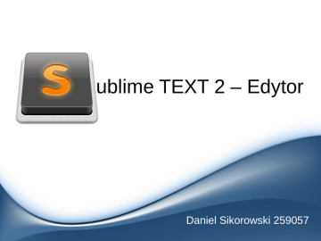ublime TEXT 2 – Edytor Daniel Sikorowski 259057 Plan prezentacji Czym jest i jak wygląda Sublime Text 2 Co wyróżnia Sublime? Jak korzysta się z Sublime? Wtyczki, snippets oraz macro Prezentacja edytora w praktyce Podsumowanie Czym jest i jak wygląda Sublime Text 2 Sublime Text wieloplatformowy i oferujący szereg funkcjonalności edytor tekstu, który kierowany jest w głównej mierze do programistów. Aplikacja stworzona została od podstaw w języku C++ i Python z dużym naciskiem na szybkość działania oraz wygodę pracy. Skupia ona w sobie wszystkie niezbędne funkcje, pozwalające programiście sprawnie pisać i edytować pliki z kodem źródłowym. Istotną zaletą Sublime Text są rozbudowane możliwości konfiguracji i dostosowywania poszczególnych elementów edytora do indywidualnych preferencji użytkownika, a także usprawnią wykonywanie określonych zadań. Co wyróżnia Sublime bogatą funkcjonalność wieloplatformowość prostota oraz wygoda szybkość działania możliwości konfiguracji edytora dostosowanie elementów edytora do preferencji użytkownika własne pluginy, snippety oraz makra ogromna baza dodatków stworzonych przez użytkowników Jak korzystać z Sublime ? Wejść na stronę główną http://www.sublimetext.com/2 Pobrać, a następnie zainstalować Aby w prosty sposób ściągać snippety, macra itp. należy skorzystać z package control, ale aby go zainstalować należy wejść na https://packagecontrol.io/installation#st2 i wykonać wszystkie polecenia. Teraz można korzystać z udogodnień i na stronie https://packagecontrol.io wyszukać interesujące nas dodatki i zgodnie z poleceniami wykonać instalację poszczególnych komponentów wewnątrz otwartego programu Sublime. Wtyczki, snippets oraz macro Prawdziwą zaletą i ogromnym plusem sublime jest duża baza dodatków stworzonych przez innych użytkowników, ale także możliwość własnoręcznego stworzenia swojego własnego snippeta, macro lub dla bardziej zaawansowanych wtyczki do Sublime. Przykład dla SNIPPET: Emmet Przykład jak stworzyć MACRO Przykład WTYCZKI: CODE-PRETTIFY Podsumowanie