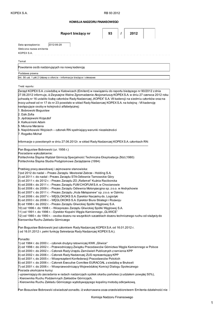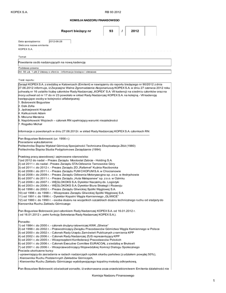 KOPEX S.A. RB 93 2012 KOMISJA NADZORU FINANSOWEGO Raport bieżący nr Data sporządzenia: 93 / 2012 2012-06-28 Skróc ona nazwa emitenta KOPEX S.A. Temat Powołanie osób nadzorujących na nową kadencję Podstawa prawna Art. 56 ust. 1 pkt 2 Ustawy o oferc ie - informac je bieżąc e i okresowe Treść raportu: Zarząd KOPEX S.A. z siedzibą w Katowicach (Emitent) w nawiązaniu do raportu bieżącego nr 90/2012 z dnia 27.06.2012 informuje, iż Zwyczajne Walne Zgromadzenie Akcjonariuszy KOPEX S.A. w dniu 27 czerwca 2012 roku uchwałą nr 16 ustaliło liczbę członków Rady Nadzorczej „KOPEX” S.A. VII kadencji na siedmiu członków oraz na mocy uchwał od nr 17 do nr 23 powołało w skład Rady Nadzorczej KOPEX S.A. na kolejną - VII kadencję następujące osoby w kolejności alfabetycznej: 1. Bobrowski Bogusław 2. Dzik Zofia 3. Jędrzejewski Krzysztof 4. Kalkusinski Adam 5. Misiuna Marzena 6. Napiórkowski Wojciech – członek RN spełniający warunki niezależności 7. Rogatko Michał Informacje o powołanych w dniu 27.06.2012r. w skład Rady Nadzorczej KOPEX S.A. członkach RN: ------------------------------------------------------------------------------------------------------------------------------------Pan Bogusław Bobrowski (ur. 1956 r.) Posiadane wykształcenie: Politechnika Śląska Wydział Górniczy Specjalność Techniczna Eksploatacja Złóż (1980) Politechnika Śląska Studia Podyplomowe Zarządzanie (1994) Przebieg pracy zawodowej i zajmowane stanowiska: 1)od 2012 do nadal – Prezes Zarządu Mostostal Zabrze - Holding S.A. 2) od 2011 r. do nadal - Prezes Zarządu STA-Odlewnie Tarnowskie Góry 3) od 2011 r. do 2012 r. - Prezes Zarządu ZO „Rafamet“ Kuźnia Raciborska 4) od 2008 r. do 2011 r. - Prezes Zarządu FUM CHOFUM S.A. w Chocianowie 5) od 2008 r. do 2009 r. - Prezes Zarządu Odlewnia Motoryzacyjna sp. z o.o. w Andrychowie 6) od 2007 r. do 2011 r. - Prezes Zarządu „Huta Małapanew“ sp. z o.o. w Ozimku 7) od 2006 r. do 2007 r. - WĘGLOKOKS S.A. Dyrektor Naczelny ds. Logistyki 8) od 2003 r. do 2006 r. - WĘGLOKOKS S.A. Dyrektor Biura Strategii i Rozwoju 9) od 1998 r. do 2002 r. - Prezes Zarządu Gliwickiej Spółki Węglowej S.A. 10) od 1996 r. do 1998 r. - Wiceprezes Zarządu Gliwickiej Spółki Węglowej S.A. 11) od 1991 r. do 1996 r. - Dyrektor Kopalni Węgla Kamiennego „GLIWICE” 12) od 1980 r. do 1990 r. - osoba dozoru na wszystkich szczeblach dozoru technicznego ruchu od stażysty do Kierownika Ruchu Zakładu Górniczego Pan Bogusław Bobrowski jest członkiem Rady Nadzorczej KOPEX S.A. od 16.01.2012 r. ( od 16.01.2012 r. pełni funkcję Sekretarza Rady Nadzorczej KOPEX S.A.). Ponadto: 1) od 1984 r. do 2000 r. - członek drużyny ratowniczej KWK „Gliwice“ 2) od 1998 r. do 2002 r. - Przewodniczący Związku Pracodawców Górnictwa Węgla Kamiennego w Polsce 3) od 2000 r. do 2002 r. - Członek Rady Urzędu Zamówień Publicznych z ramienia KPP 4) od 2002 r. do 2006 r. - Członek Rady Nadzorczej ZUS reprezentujący KPP 5) od 2001 r, do 2005 r. - Wiceprezydent Konfederacji Pracodawców Polskich 6) od 2001 r. do 2006 r. - Członek Executive Comittee EURACOAL z siedzibą w Brukseli 7) od 2001 r. do 2006 r. - Wiceprzewodniczący Wojewódzkiej Komisji Dialogu Społecznego Posiada ukończone kursy: - uprawniający do zasiadania w radach nadzorczych spółek skarbu państwa (z udziałem powyżej 50%), - Kierownika Ruchu Podziemnych Zakładów Górniczych, - Kierownika Ruchu Zakładu Górniczego wydobywającego kopaliny metodą odkrywkową. Pan Bogusław Bobrowski oświadczył ponadto, iż wykonywana poza przedsiębiorstwem Emitenta działalność nie Komisja Nadzoru Finansowego 1 KOPEX S.A. RB 93 2012 Pan Bogusław Bobrowski oświadczył ponadto, iż wykonywana poza przedsiębiorstwem Emitenta działalność nie jest konkurencyjna wobec działalności Emitenta, oraz nie uczestniczy w spółce konkurencyjnej jako wspólnik spółki cywilnej, spółki osobowej lub jako członek organu spółki kapitałowej, a także nie uczestniczy w innej konkurencyjnej osobie prawnej jako członek jej organu; Zgodnie ze złożonym oświadczeniem Pan Bogusław Bobrowski nie figuruje w Rejestrze Dłużników Niewypłacalnych, prowadzonym na podstawie ustawy o KRS. ------------------------------------------------------------------------------------------------------------------------------------Pani Zofia Dzik (ur. 1970 r.) Posiadane wykształcenie: Jest absolwentką Akademii Ekonomicznej w Krakowie, University of Illinois w Chicago, Szkoły Wyższej Psychologii Społecznej w Warszawie oraz Executive Programs na INSEAD Business School, posiada także tytuł MBA Manchester Business School oraz jest certyfikowanym członkiem Association for Project Management (APMP). Przebieg pracy zawodowej i zajmowane stanowiska: W latach 1995-2003 pracowała jako doradca w firmie Andersen Business Consulting. Od 2003 roku związana z Grupą Intouch Insurance (obecnie RSA), gdzie w latach 2004-2007 sprawowała funkcję Prezesa Zarządu TU Link4 S.A., natomiast w latach 2007-2009 funkcję członka Zarządu Intouch Insurance B.V. w Holandii oraz CEO na Europę Centralną i Wschodnią grupy Intouch Insurance. W ramach tej funkcji była odpowiedzialna za rozwój nowych rynków, była przewodniczącą rad nadzorczych spółek: TU Link4 S.A. i Direct Insurance Shared Services Center w Polsce, Intouch Strachowanie w Rosji oraz Direct Pojistovna w Czechach oraz wiceprzewodniczącą rady nadzorczej TU na Życie Link4 Life S.A. Obecnie jest Prezesem Zarządu Fundacji Humanites – Sztuka Wychowania oraz członkiem rady nadzorczej TU Link4 S.A. i ERBUD S.A. Pani Zofia Dzik jest członkiem Rady Nadzorczej KOPEX S.A. od 06.02.2012 r. Ponadto: W latach 2006-2008 członek Zarządu Polskiej Izby Ubezpieczeń. W latach 2007-2010 członek rady nadzorczej Ubezpieczeniowego Funduszu Gwarancyjnego. Pani Zofia Dzik oświadczyła ponadto, iż wykonywana poza przedsiębiorstwem Emitenta działalność nie je