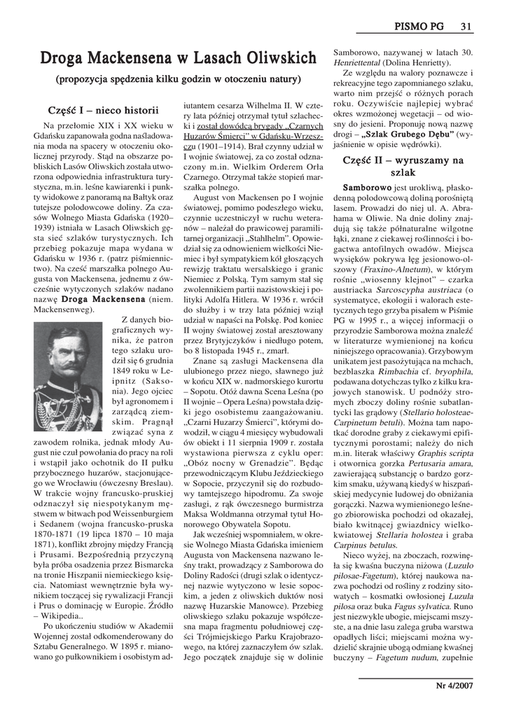 PISMO PG Droga Mackensena w Lasach Oliwskich (propozycja spędzenia kilku godzin w otoczeniu natury) Część I – nieco historii Na przełomie XIX i XX wieku w Gdańsku zapanowała godna naśladowa− nia moda na spacery w otoczeniu oko− licznej przyrody. Stąd na obszarze po− bliskich Lasów Oliwskich została utwo− rzona odpowiednia infrastruktura tury− styczna, m.in. leśne kawiarenki i punk− ty widokowe z panoramą na Bałtyk oraz tutejsze polodowcowe doliny. Za cza− sów Wolnego Miasta Gdańska (1920– 1939) istniała w Lasach Oliwskich gę− sta sieć szlaków turystycznych. Ich przebieg pokazuje mapa wydana w Gdańsku w 1936 r. (patrz piśmiennic− two). Na cześć marszałka polnego Au− gusta von Mackensena, jednemu z ów− cześnie wytyczonych szlaków nadano nazwę D r o g a M a c k e n s e n a (niem. Mackensenweg). Z danych bio− graficznych wy− nika, że patron tego szlaku uro− dził się 6 grudnia 1849 roku w Le− ipnitz (Sakso− nia). Jego ojciec był agronomem i zarządcą ziem− skim. Pragnął związać syna z zawodem rolnika, jednak młody Au− gust nie czuł powołania do pracy na roli i wstąpił jako ochotnik do II pułku przybocznego huzarów, stacjonujące− go we Wrocławiu (ówczesny Breslau). W trakcie wojny francusko−pruskiej odznaczył się niespotykanym mę− stwem w bitwach pod Weissenburgiem i Sedanem (wojna francusko−pruska 1870−1871 (19 lipca 1870 – 10 maja 1871), konflikt zbrojny między Francją i Prusami. Bezpośrednią przyczyną była próba osadzenia przez Bismarcka na tronie Hiszpanii niemieckiego księ− cia. Natomiast wewnętrznie była wy− nikiem toczącej się rywalizacji Francji i Prus o dominację w Europie. Źródło – Wikipedia.. Po ukończeniu studiów w Akademii Wojennej został odkomenderowany do Sztabu Generalnego. W 1895 r. miano− wano go pułkownikiem i osobistym ad− iutantem cesarza Wilhelma II. W czte− ry lata później otrzymał tytuł szlachec− ki i został dowódcą brygady „Czarnych Huzarów Śmierci” w Gdańsku−Wrzesz− czu (1901–1914). Brał czynny udział w I wojnie światowej, za co został odzna− czony m.in. Wielkim Orderem Orła Czarnego. Otrzymał także stopień mar− szałka polnego. August von Mackensen po I wojnie światowej, pomimo podeszłego wieku, czynnie uczestniczył w ruchu wetera− nów – należał do prawicowej paramili− tarnej organizacji „Stahlhelm”. Opowie− dział się za odnowieniem wielkości Nie− miec i był sympatykiem kół głoszących rewizję traktatu wersalskiego i granic Niemiec z Polską. Tym samym stał się zwolennikiem partii nazistowskiej i po− lityki Adolfa Hitlera. W 1936 r. wrócił do służby i w trzy lata później wziął udział w napaści na Polskę. Pod koniec II wojny światowej został aresztowany przez Brytyjczyków i niedługo potem, bo 8 listopada 1945 r., zmarł. Znane są zasługi Mackensena dla ulubionego przez niego, sławnego już w końcu XIX w. nadmorskiego kurortu – Sopotu. Otóż dawna Scena Leśna (po II wojnie – Opera Leśna) powstała dzię− ki jego osobistemu zaangażowaniu. „Czarni Huzarzy Śmierci”, którymi do− wodził, w ciągu 4 miesięcy wybudowali ów obiekt i 11 sierpnia 1909 r. została wystawiona pierwsza z cyklu oper: „Obóz nocny w Grenadzie”. Będąc przewodniczącym Klubu Jeździeckiego w Sopocie, przyczynił się do rozbudo− wy tamtejszego hipodromu. Za swoje zasługi, z rąk ówczesnego burmistrza Maksa Woldmanna otrzymał tytuł Ho− norowego Obywatela Sopotu. Jak wcześniej wspomniałem, w okre− sie Wolnego Miasta Gdańska imieniem Augusta von Mackensena nazwano le− śny trakt, prowadzący z Samborowa do Doliny Radości (drugi szlak o identycz− nej nazwie wytyczono w lesie sopoc− kim, a jeden z oliwskich duktów nosi nazwę Huzarskie Manowce). Przebieg oliwskiego szlaku pokazuje współcze− sna mapa fragmentu południowej czę− ści Trójmiejskiego Parku Krajobrazo− wego, na której zaznaczyłem ów szlak. Jego początek znajduje się w dolinie 31 Samborowo, nazywanej w latach 30. Henriettental (Dolina Henrietty). Ze względu na walory poznawcze i rekreacyjne tego zapomnianego szlaku, warto nim przejść o różnych porach roku. Oczywiście najlepiej wybrać okres wzmożonej wegetacji – od wio− sny do jesieni. Proponuję nową nazwę drogi – „Szlak Grubego Dębu” (wy− jaśnienie w opisie wędrówki). Część II – wyruszamy na szlak Samborowo jest urokliwą, płasko− denną polodowcową doliną porośniętą lasem. Prowadzi do niej ul. A. Abra− hama w Oliwie. Na dnie doliny znaj− dują się także półnaturalne wilgotne łąki, znane z ciekawej roślinności i bo− gactwa antofilnych owadów. Miejsca wysięków pokrywa łęg jesionowo−ol− szowy (Fraxino−Alnetum), w którym rośnie „wiosenny klejnot” – czarka austriacka Sarcoscypha austriaca (o systematyce, ekologii i walorach este− tycznych tego grzyba pisałem w Piśmie PG w 1995 r., a więcej informacji o przyrodzie Samborowa można znaleźć w literaturze wymienionej na końcu niniejszego opracowania). Grzybowym unikatem jest pasożytująca na mchach, bezblaszka Rimbachia cf. bryophila, podawana dotychczas tylko z kilku kra− jowych stanowisk. U podnóży stro− mych zboczy doliny rośnie subatlan− tycki las grądowy (Stellario holosteae− Carpinetum betuli). Można tam napo− tkać dorodne graby z ciekawymi epifi− tycznymi porostami; należy do nich m.in. literak właściwy Graphis scripta i otwornica gorzka Pertusaria amara, zawierającą substancję o bardzo gorz− kim smaku, używaną kiedyś w hiszpań− skiej medycynie ludowej do obniżania gorączki. Nazwa wymienionego leśne− go zbiorowiska pochodzi od okazałej, biało kwitnącej gwiazdnicy wielko− kwiatowej Stellaria holostea i graba Carpinus betulus. Nieco wyżej, na zboczach, rozwinę− ła się kwaśna buczyna niżowa (Luzulo pilosae−Fagetum), której naukowa na− zwa