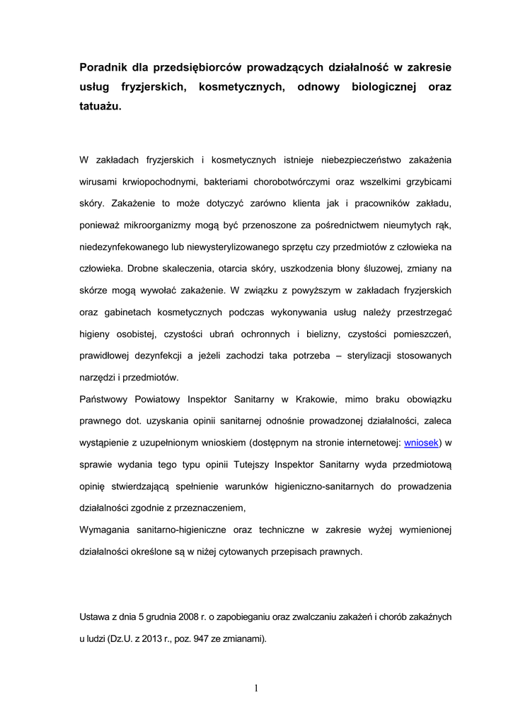 Poradnik dla przedsiębiorców prowadzących działalność w zakresie usług fryzjerskich, kosmetycznych, odnowy biologicznej oraz tatuażu. W zakładach fryzjerskich i kosmetycznych istnieje niebezpieczeństwo zakażenia wirusami krwiopochodnymi, bakteriami chorobotwórczymi oraz wszelkimi grzybicami skóry. Zakażenie to może dotyczyć zarówno klienta jak i pracowników zakładu, ponieważ mikroorganizmy mogą być przenoszone za pośrednictwem nieumytych rąk, niedezynfekowanego lub niewysterylizowanego sprzętu czy przedmiotów z człowieka na człowieka. Drobne skaleczenia, otarcia skóry, uszkodzenia błony śluzowej, zmiany na skórze mogą wywołać zakażenie. W związku z powyższym w zakładach fryzjerskich oraz gabinetach kosmetycznych podczas wykonywania usług należy przestrzegać higieny osobistej, czystości ubrań ochronnych i bielizny, czystości pomieszczeń, prawidłowej dezynfekcji a jeżeli zachodzi taka potrzeba – sterylizacji stosowanych narzędzi i przedmiotów. Państwowy Powiatowy Inspektor Sanitarny w Krakowie, mimo braku obowiązku prawnego dot. uzyskania opinii sanitarnej odnośnie prowadzonej działalności, zaleca wystąpienie z uzupełnionym wnioskiem (dostępnym na stronie internetowej: wniosek) w sprawie wydania tego typu opinii Tutejszy Inspektor Sanitarny wyda przedmiotową opinię stwierdzającą spełnienie warunków higieniczno-sanitarnych do prowadzenia działalności zgodnie z przeznaczeniem, Wymagania sanitarno-higieniczne oraz techniczne w zakresie wyżej wymienionej działalności określone są w niżej cytowanych przepisach prawnych. Ustawa z dnia 5 grudnia 2008 r. o zapobieganiu oraz zwalczaniu zakażeń i chorób zakaźnych u ludzi (Dz.U. z 2013 r., poz. 947 ze zmianami). 1 Ustawy z dnia 7 lipca 1994 r. Prawo budowlane (Dz. U. z 2013 r. poz. 1409 z późn. zm.). Rozporządzenia Ministra Infrastruktury z dnia 12 kwietnia 2002 r. w sprawie warunków technicznych, jakim powinny odpowiadać budynki i ich usytuowanie (Dz.U. z 2015 r. poz. 1422). I. Stan sanitarno-porządkowy i techniczny pomieszczeń ogólnodostępnych 1. Dotyczy sal i gabinetów w których świadczone są usługi z zakresu fryzjerstwa, kosmetyki, tatuażu i odnowy biologicznej, Kontrolowane pomieszczenia powinny być utrzymane w dobrym stanie porządkowym tj: czyste powierzchnie ścian, sufitów, podłóg, wykładzin, bez plam, zawilgoceń, odprysków farby. W pomieszczeniach przeznaczonych na pobyt ludzi, w pomieszczeniach bez otwieranych okien, a także w innych pomieszczeniach, w których ze względów zdrowotnych, technologicznych lub bezpieczeństwa konieczne jest zapewnienie wymiany powietrza powinna być zgodnie z § 147 ust.2 Rozporządzenia Ministra Infrastruktury z dnia 12 kwietnia 2002 r. w sprawie warunków technicznych, jakim powinny odpowiadać budynki i ich usytuowanie (Dz.U. z 2015 r. poz. 1422) zapewniona wentylacja mechaniczna lub grawitacyjna W obiektach gdzie brak jest poczekalni dla klientów na terenie zakładu winno być wydzielone miejsce odpowiednio wyposażone w krzesełka, sofy, czyste w dobrym stanie technicznym o powierzchni gładkiej ułatwiającej utrzymanie w czystości oraz wieszaki na odzież wierzchnią klientów. Na terenie obiektu powinna być umieszczona informacja w formie graficznej oraz pisemnej odnośnie zakazu palenia tytoniu. 2 Wyposażenie pomieszczeń w zależności od charakteru prowadzonej działalności tj: fotele przy stanowiskach pracy w salach usług fryzjerskich, fotele kosmetyczne, łóżka zabiegowe, brodziki, kabiny do odnowy biologicznej kompletne w dobrym stanie technicznym, czyste bez uszkodzeń o powierzchniach łatwych do utrzymania w czystości odpornych na działanie środków dezynfekcyjnych. Sprzęt sprawny w dobrym stanie technicznym. Narzędzia stosowane przy świadczeniu usług przygotowane do pracy przechowywane w higienicznych warunkach tj: zamykanych pojemnikach, jednostkowych opakowaniach papierowo – foliowych, wydzielonych szufladach, szafkach – utrzymanych czysto, dezynfekowanych na bieżąco. Stanowisko mycia, czyszczenia i dezynfekcji narzędzi W przypadku używania narzędzi wielokrotnego użytku wymagających mycia, czyszczenia i dezynfekcji, w obiekcie wydziela się stanowisko wyposażone w umywalkę lub zlew z bieżącą zimną i ciepłą wodą oraz pojemniki, wanienki, myjki ultradźwiękowe do przeprowadzenia procesów dezynfekcyjnych. Do dezynfekcji narzędzi powinien być zapewniony zapas środków dezynfekcyjnych przeznaczony odpowiednio do: - narządzi ostrych o szerokim spektrum działania - do powierzchni - do rąk, stóp i skóry - do urządzeń sanitarnych Wyżej wymienione środki o aktualnych terminach ważności przechowywane w oryginalnych opakowaniach. W przypadku przygotowywania roztworów roboczych w opakowaniach zastępczych, powinna być umieszczona na opakowaniu zastępczym odpowiednia informacja zawierająca nazwę środka, datę sporządzenia oraz nazwisko osoby przygotowującej roztwór. W części gabinetów prowadzona jest sterylizacja narzędzi. Sterylizację narzędzi można wykonać we własnym zakresie przy użyciu autoklawu w którym czynnikiem 3 sterylizującym jest nasycona para wodna w nadciśnieniu lub zlecić przeprowadzenie procesu sterylizacji placówce zewnętrznej. Wykonanie sterylizacji poza gabinetem wymaga zawarcia umowy z podmiotem mającym możliwość zapewnienia właściwego rodzaju sterylizacji. Przed przekazaniem narzędzi do placówki wykonującej sterylizację należy je opakować w specjalistyczne opakowanie sterylizacyjne. Również autoklawowane na miejscu narzędzia powinny być pakowane. Tylko przeznaczony do natychmiastowego użycia sprzęt po procesie sterylizacji może być nieopakowany. Sprzęt przeznaczony do sterylizacji po dezynfekcji, umyciu, wysuszeniu należy we właściwy sposób opakować. Opakowanie powinno zabezpieczać sterylizowane narzędzia przed zakażeniem drobnoustrojami po procesie sterylizacji, w czasie wyładow