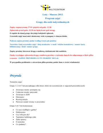 Luty - Marzec 2012 Program zajęć Grupy dla osób indywidualnych Zapisy rozpoczynamy 27.01 (piątek) od godz. 12.30 Zgłoszenia przed godz. 12.30 nie będą brane pod uwagę. O zapisie do danej grupy decyduje kolejność zgłoszeń. Uczestnik zajęć musi mieć ukończony wiek wymagany w danym dziale. Podczas zapisu prosimy podać według wzoru jak poniżej: Nazwisko i imię uczestnika zajęć / datę urodzenia / e-mail / telefon kontaktowy / numer karty bibliotecznej / dział / numer grupy Zapisy prosimy kierować drogą e-mailową, telefonicznie lub osobiście. Osoby wysyłające zgłoszenia drogą e-mailową prosimy o wpisanie danych do załączonego w liście pliku o nazwie: ZAPISY PRZYRODA LUTY-MARZEC 2012.xls W przypadku problemów z otwarciem pliku prosimy podać dane w treści wiadomości. Przyroda Tematyka zajęć: Grupa 1 i 2 (4-7 lat) początkujący (dla dzieci, które nie uczestniczyły w zajęciach przyrodniczych) Zwierzęce memo- poznajmy się Cudaczne owady- patyczaki Zwierzęta w ZOO Dinozaury Rozwój motyla Pierwsze oznaki wiosny w przyrodzie Grupa 3 (4-7 lat) kontynuacja Co nosi wielbłąd w garbie? Dżdżownice Czy wilk jest zły? Tajemnice ludzkiego ciała Żabie sprawy O stonodze Co zjadamy? Grupa 4 (od 8 lat) grupa początkująca (dla dzieci, które nie uczestniczyły w zajęciach przyrodniczych) Pierwsza obserwacja mikroskopowa EKG i praca serca Dlaczego warto segregować śmieci? Nie wszystkie grzyby mają kapelusze Owocowe enzymy Warstwowa struktura lasu Skąd się bierze czysta woda w kranie? Pierwsze zajęcia dla grupy 1 i 2 rozpoczną się 20.02 a zakończą 26.03 (6 spotkań) Zajęcia dla grupy 3 i 4 rozpoczną się 14.02 a zakończą 27.03 (7 spotkań) Grupy 10 osobowe Dzień Poniedziałek (początkujący) Poniedziałek (początkujący) Wtorek (kontynuacja) Wtorek (początkujący) Numer grupy 1 Godzina 16.00-17.00 Wiek uczestników 4-7 lat 2 17.30-18.30 4-7 lat 3 16.00-17.00 4-7 lat 4 17.30-18.30 od 8 lat Zapraszamy Oddział Biblioteki Publicznej w Dzielnicy Białołęka m.st. Warszawy ul. Porajów 14 03-188 Warszawa tel.: 22 614 60 70 e-mail: [email protected] www.multicentrum.warszawa.pl
