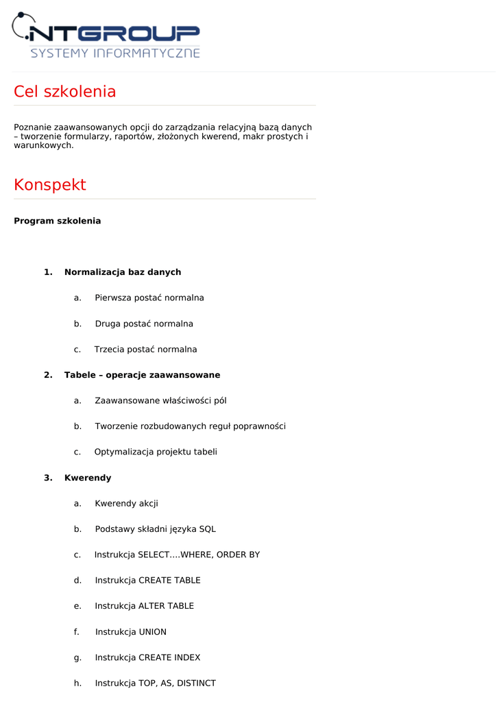 Cel szkolenia Poznanie zaawansowanych opcji do zarządzania relacyjną bazą danych – tworzenie formularzy, raportów, złożonych kwerend, makr prostych i warunkowych. Konspekt Program szkolenia 1. Normalizacja baz danych a. Pierwsza postać normalna b. Druga postać normalna c. Trzecia postać normalna 2. Tabele – operacje zaawansowane a. Zaawansowane właściwości pól b. Tworzenie rozbudowanych reguł poprawności c. Optymalizacja projektu tabeli 3. Kwerendy a. Kwerendy akcji b. Podstawy składni języka SQL c. Instrukcja SELECT….WHERE, ORDER BY d. Instrukcja CREATE TABLE e. Instrukcja ALTER TABLE f. Instrukcja UNION g. Instrukcja CREATE INDEX h. Instrukcja TOP, AS, DISTINCT i. Instrukcja TRANSFORM, PIVOT j. Kwerendy dołączające rekordy k. Kwerendy przekazujące i składające dane 4. Formularze - operacje zaawansowane a. Formularze budowane na podstawie kwerend b. Zaawansowane właściwości kontrolek formularza c. Tworzenie zaawansowanych podformularzy d. Zdarzenia formularza 5. Import i eksport danych MS EXCEL / MS ACCESS 6. Wykorzystanie w MS QUERY komend SQL 7. Bezpieczeństwo baz danych a. Bezpieczeństwo danych b. Szyfrowanie bazy c. Udostępnianie bazy danych d. Administracja bazą 8. Język VBA w Accessie a. Visual Basic for Aplication b. Deklaracja zmiennych c. Instrukcje INPUTBOX i MSGBOX d. Tworzenie własnych pasków narzędzi Po skończonych zajęciach kursant ma do dyspozycji w pełni funkcjonalną bazę danych, która może posłużyć jako wzór podczas samodzielnej pracy w Access. Dodatkowe informacje W cenę szkolenia wliczony jest: Certyfikat ukończenia szkolenia NT Group Sp. z o.o. Materiały szkoleniowe, notatnik, długopis Kontakt z trenerem po szkoleniu Kawa, herbata, słodki poczęstunek Obiad Firma posiada wpis w Urzędzie Miasta Łodzi jako placówka kształcenia ustawicznego. Nazwa: Szkolenie MS Access 2010/2013/2016 – operacje zaawansowane -CENA PROMOCYJNA Czas trwania: 2 dni Ilość godzin: 16 Język: Prowadzący: Wieloletni trener Microsoft Lokalizacja: NT Group Łódź, siedziba klienta, lub dowolne miasto w Polsce Cena szkolenia: 590 PLN Dostępne terminy NT GROUP Sp. z o.o. 90-418 Łódź, Al. T. Kościuszki 39 III piętro infolina 801 011 684 Tel.: +48 42 655-33-77; Fax: +48 42 630-15-63 e-mail: [email protected] NT Group Systemy Informatyczne Sp. z o.o. Krajowy Rejestr Sądowy Konto Bankowe 90-418 Łódź, Al. T. Kościuszki 39 III piętro KRS 0000214993 Kredyt Bank S.A. tel.: +42 6553377 Sąd Rejonowy dla Łodzi-Śródmieścia Rozliczenie Krajowe: tel. / fax. +42 6301563 w Łodzi, XX Wydział KRS 71 1500 1246 1215 4005 5991 0000 e-mail: [email protected] www.ntgroup.pl Rozliczenie Zagraniczne: Regon: 470557218 PL 71 1500 1246 1215 4005 5991 0000 NIP: 7251888624 KRDBPLPW