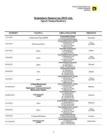Polski Związek Motorowy Zarząd Okręgowy Katowice Kalendarz Imprez na 2015 rok. Sport Samochodowy TERMIN NAZWA 11.01.2015 13 Sosnowiecki Sprint WOŚP 18.01.2015 Noworoczny Sprint 25.01.2015 Sprint 15.03.2015 Sprint 22.03.2015 Sprint 28.03.2015 KJS 12.04.2015 Sprint 18-19.04.2015 4 Rajd Mikołowski I runda Rajdowych Samochodowych Mistrzostw Śląska 24-26.04.2015 Rajd Świdnicki 1 RSMP 01.05.2015 Sprint 03.05.2015 Sprint 10.05.2015 3 Targowy Rally Sprint 15-17.05.2015 ORGANIZATOR Automobilklub Silesia ul. Świerczewskiego 85 41-100 Siemianowice Śląskie Automobilklub Ziemi Tyskiej ul. Budowlanych 90 43-100 Tychy tel. (032) 327-15-90 0/605-202-657 Auto Moto Klub Gliwice ul. Jasnogórska 11 44-100 Gliwice tel. (032) 231-31-41 Automobilklub Ziemi Tyskiej ul. Budowlanych 90 43-100 Tychy tel. (032) 327-15-90 0/605-202-657 Automobilklub Cieszyński ul. Wolności 3 43-400 Cieszyn tel./fax. 033/852-02-39 Automobilklub Śląski ul. Stanisława 4 40-014 Katowice tel. 032/253-88-74 fax. 032/253-99-43 Automobilklub Ziemi Tyskiej ul. Budowlanych 90 43-100 Tychy tel. (032) 327-15-90 0/605-202-657 Automobilklub Ziemi Tyskiej ul. Budowlanych 90 43-100 Tychy tel. (032) 327-15-90 0/605-202-657 Automobilklub Sudecki ul. Kliczkowska 2 58-100 Świdnica tel. 074/853-69-98 fax. 074/852-21-00 [email protected] Automobilklub Częstochowski ul. Krakowska 31 42-200 Częstochowa tel. 0/513-027-816 Automobilklub Ziemi Tyskiej ul. Budowlanych 90 43-100 Tychy tel. (032) 327-15-90 0/605-202-657 Automobilklub Silesia ul. Świerczewskiego 85 41-100 Siemianowice Śląskie Automobilklub Karkonoski ul. Kolejowa 5 58-570 Jelenia Góra tel./fax. 075/755-45-59 Rajd Karkonoski 2 RSMP 1 MIEJSCE Sosnowiec Tychy (Tor FAP) Gliwice Tychy (Tor FAP) Kaczyce Kraków Tychy (Tor FAP) Mikołów Świdnica Wyrazów Tychy (Tor FAP) Chorzów Jelenia Góra Polski Związek Motorowy Zarząd Okręgowy Katowice 17.05.2015 KJS 23.05.2015 KJS 24.05.2015 KJS 31.05.2015 5. Rajd Zamkowy II runda Rajdowych Samochodowych Mistrzostw Śląska 06.06.2015 KJS 07.06.2015 Sprint 12-13.06.2015 14.06.2015 19-21.06.2015 Rajd Gdańsk Baltic Cup 3 RSMP 21.06.2015 Sprint 24-25.07.2015 Automobilklub Śląski ul. Stanisława 4 40-014 Katowice tel. 032/253-88-74 fax. 032/253-99-43 Automobilklub Ziemi Tyskiej ul. Budowlanych 90 43-100 Tychy tel. (032) 327-15-90 0/605-202-657 Automobilklub Śląski ul. Stanisława 4 40-014 Katowice tel. 032/253-88-74 fax. 032/253-99-43 Automobilklub Częstochowski ul. Krakowska 31 42-200 Częstochowa tel. 0/513-027-816 Automobilklub Orski Al. Niepodległości 931 81-861 Sopot tel./fax. 058/551-69-75 Automobilklub Silesia ul. Świerczewskiego 85 41-100 Siemianowice Śląskie Auto Moto Klub Gliwice ul. Jasnogórska 11 44-100 Gliwice tel. (032) 231-31-41 Polski Związek Motorowy Zarząd Główny ul. Kazimierzowska 66 02/518 Warszawa Automobilklub Cieszyński ul. Wolności 3 43-400 Cieszyn tel./fax. 033/852-02-39 Automobilklub Śląski ul. Stanisława 4 40-014 Katowice tel. 032/253-88-74 fax. 032/253-99-43 Automobilklub Częstochowski ul. Krakowska 31 42-200 Częstochowa tel. 0/513-027-816 Automobilklub Śląski ul. Stanisława 4 40-014 Katowice tel. 032/253-88-74 fax. 032/253-99-43 Sprint Nocne Kryterium 12.07.2015 Automobilklub Zamkowy ul. Sportowa 6 42-500 Będzin tel. (032) 797 66 19 52 3. Rajd Ziemi Bocheńskiej III runda Rajdowych Samochodowych Mistrzostw Śląska 20.06.2015 02-05.07.2015 Automobilklub Cieszyński ul. Wolności 3 43-400 Cieszyn tel./fax. 033/852-02-39 Automobilklub Śląski ul. Stanisława 4 40-014 Katowice tel. 032/253-88-74 fax. 032/253-99-43 Automobilklub Śląski ul. Stanisława 4 40-014 Katowice tel. 032/253-88-74 fax. 032/253-99-43 71 Rajd Polski RSMŚ Sprint Rajd Czechowicki IV runda Rajdowych Samochodowych Mistrzostw Śląska 26.07.2015 Sprint 01.08.2015 KJS 2 Ustroń Kraków Katowice Będzin Tarnowskie Góry Tychy (Tor FAP) Bochnia Wyrazów Gdańsk Dąbrowa Górnicza Gliwice Mikołajki Zamarski Czechowice-Dziedzice Wyrazów Kraków Polski Związek Motorowy Zarząd Okręgowy Katowice 06-08.08.2015 15.08.2015 KJS 16.08.2015 Sprint Cieszyńskie Święto Motoryzacji 21-22.08.2015 30.08.2015 04-06.09.2015 2 Rajd Oświęcimski V runda Rajdowych Samochodowych Mistrzostw Śląska 13.09.2015 KJS 20.09.2015 KJS 02-03.10.2015 Automobilklub Zamkowy ul. Sportowa 6 42-500 Będzin tel. (032) 797 66 19 52 Automobilklub Śląski ul. Stanisława 4 40-014 Katowice tel. 032/253-88-74 fax. 032/253-99-43 Automobilklub Śląski ul. Stanisława 4 40-014 Katowice tel. 032/253-88-74 fax. 032/253-99-43 Automobilklub Ziemi Tyskiej ul. Budowlanych 90 43-100 Tychy tel. (032) 327-15-90 0/605-202-657 Automobilklub Częstochowski ul. Krakowska 31 42-200 Częstochowa tel. 0/513-027-816 Automobilklub Polski ul. Pańska 85 00-834 Warszawa tel. 022/652-81-20 fax. 022/652-81-10 Automobilklub Śląski ul. Stanisława 4 40-014 Katowice tel. 032/253-88-74 fax. 032/253-99-43 Automobilklub Śląski ul. Stanisława 4 40-014 Katowice tel. 032/253-88-74 fax. 032/253-99-43 Automobilklub Cieszyński ul. Wolności 3 43-400 Cieszyn tel./fax. 033/852-02-39 Automobilklub Śląski ul. Stanisława 4 40-014 Katowice tel. 032/253-88-74 fax. 032/253-99-43 Automobilklub Silesia ul. Świerczewskiego 85 41-100 Siemianowice Śląskie 61 Rajd Wisły 5 RSMP Sprint 26.09.2015 Automobilklub Rallymania Sprint 12.09.2015 18-20.09.2015 Automobilklub Rzeszowski Al. Wyspiańskiego 2 35-111 Rzeszów tel. 017/853-31-60 fax. 017/853-31-39 Automobilklub Ziemi Tyskiej ul. Budowlanych 90 43-100 Tychy tel. (032) 327-15-90 0/605-202-657 Automobilklub Cieszyński ul. Wolności 3 43-400 Cieszyn tel./fax. 033/852-02-39 Rajd Rzeszowski 4 RSMP Rajd Nadwiślański 6 RSMP KJS 3. Rajd Jastrzębski VI runda Rajdowych Samochodowych Mistrzostw Śląska 04.10.2015 KJS 10.10.2015 KJS 11.10.2015 4 Siemianowicki Rally Sprint 3 Rzeszów Tychy Cieszyn Oświęcim Będzin Istebna Czechowice-Dziedzice Pszczyna Wyrazów Puławy Kraków Jastrzębie-Zdrój Zebrzydowice Kraków Siemianowice Śląskie Polski 