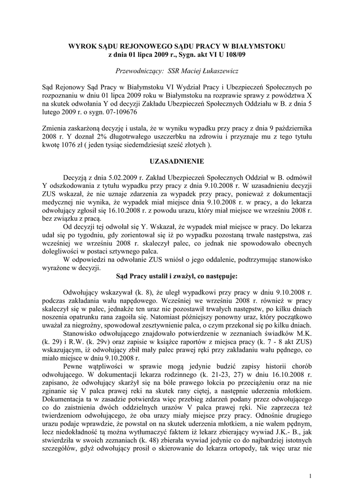 WYROK SĄDU REJONOWEGO SĄDU PRACY W BIAŁYMSTOKU z dnia 01 lipca 2009 r., Sygn. akt VI U 108/09 Przewodniczący: SSR Maciej Łukaszewicz Sąd Rejonowy Sąd Pracy w Białymstoku VI Wydział Pracy i Ubezpieczeń Społecznych po rozpoznaniu w dniu 01 lipca 2009 roku w Białymstoku na rozprawie sprawy z powództwa X na skutek odwołania Y od decyzji Zakładu Ubezpieczeń Społecznych Oddziału w B. z dnia 5 lutego 2009 r. o sygn. 07-109676 Zmienia zaskarżoną decyzję i ustala, że w wyniku wypadku przy pracy z dnia 9 października 2008 r. Y doznał 2% długotrwałego uszczerbku na zdrowiu i przyznaje mu z tego tytułu kwotę 1076 zł ( jeden tysiąc siedemdziesiąt sześć złotych ). UZASADNIENIE Decyzją z dnia 5.02.2009 r. Zakład Ubezpieczeń Społecznych Oddział w B. odmówił Y odszkodowania z tytułu wypadku przy pracy z dnia 9.10.2008 r. W uzasadnieniu decyzji ZUS wskazał, że nie uznaje zdarzenia za wypadek przy pracy, ponieważ z dokumentacji medycznej nie wynika, że wypadek miał miejsce dnia 9.10.2008 r. w pracy, a do lekarza odwołujący zgłosił się 16.10.2008 r. z powodu urazu, który miał miejsce we wrześniu 2008 r. bez związku z pracą. Od decyzji tej odwołał się Y. Wskazał, że wypadek miał miejsce w pracy. Do lekarza udał się po tygodniu, gdy zorientował się iż po wypadku pozostaną trwałe następstwa, zaś wcześniej we wrześniu 2008 r. skaleczył palec, co jednak nie spowodowało obecnych dolegliwości w postaci sztywnego palca. W odpowiedzi na odwołanie ZUS wniósł o jego oddalenie, podtrzymując stanowisko wyrażone w decyzji. Sąd Pracy ustalił i zważył, co następuje: Odwołujący wskazywał (k. 8), że uległ wypadkowi przy pracy w dniu 9.10.2008 r. podczas zakładania wału napędowego. Wcześniej we wrześniu 2008 r. również w pracy skaleczył się w palec, jednakże ten uraz nie pozostawił trwałych następstw, po kilku dniach noszenia opatrunku rana zagoiła się. Natomiast późniejszy ponowny uraz, który początkowo uważał za niegroźny, spowodował zesztywnienie palca, o czym przekonał się po kilku dniach. Stanowisko odwołującego znajdowało potwierdzenie w zeznaniach świadków M.K. (k. 29) i R.W. (k. 29v) oraz zapisie w książce raportów z miejsca pracy (k. 7 - 8 akt ZUS) wskazującym, iż odwołujący zbił mały palec prawej ręki przy zakładaniu wału pędnego, co miało miejsce w dniu 9.10.2008 r. Pewne wątpliwości w sprawie mogą jedynie budzić zapisy historii chorób odwołującego. W dokumentacji lekarza rodzinnego (k. 21-23, 27) w dniu 16.10.2008 r. zapisano, że odwołujący skarżył się na bóle prawego łokcia po przeciążeniu oraz na nie zginanie się V palca prawej reki na skutek rany ciętej, a następnie uderzenia młotkiem. Dokumentacja ta w zasadzie potwierdza więc przebieg zdarzeń podany przez odwołującego co do zaistnienia dwóch oddzielnych urazów V palca prawej ręki. Nie zaprzecza też twierdzeniom odwołującego, że oba urazy miały miejsce przy pracy. Odnośnie drugiego urazu podaje wprawdzie, że powstał on na skutek uderzenia młotkiem, a nie wałem pędnym, lecz niedokładność tą można wytłumaczyć faktem iż lekarz zbierający wywiad J.K.- B., jak stwierdziła w swoich zeznaniach (k. 48) zbierała wywiad jedynie co do najbardziej istotnych szczegółów, gdyż odwołujący prosił o skierowanie do lekarza ortopedy, tak więc uraz nie 1 miał być i tak leczony u lekarza sporządzającego wywiad. W takich okolicznościach łatwo o zebranie wywiadu niedokładnego lub przeinaczonego, tym bardziej iż odwołujący już wcześniej w dnu 29.04.2008 r. uderzył się młotkiem w II palec prawej ręki, co mogło się lekarzowi błędnie skojarzyć (k. 22). Zapis z poradni ortopedycznej (k. 16) wskazuje, że na początku września 2008 r. odwołujący doznał rany ciętej V palca prawej ręki. Stwierdzono objawy uszkodzenia zginaczy i skierowano na leczenie operacyjne. Zapis ten jest co do wywiadu sprzeczny z zapisem od lekarza rodzinnego, wskazuje bowiem tylko na jeden uraz palca V. Zdaniem Sądu świadczy to o niestaranności zapisu z wywiadu. Trudno bowiem w inny sposób wytłumaczyć fakt, że zapisy wywiadów u dwóch różnych lekarzy z tego samego dnia tak bardzo się ze sobą różnią. Oceniając zgromadzone w sprawie dowody Sąd uznał za bardziej wiarygodne zeznania współpracowników powoda oraz zapisy z dokumentacji w miejscu pracy niż zapisy dokumentacji medycznej. Ta ostatnia bowiem sporządzana jest głównie celem leczenia pacjenta i okoliczności powstania urazów mają w niej drugorzędne znaczenie, zazwyczaj są też bardzo skrótowo opisywane (jak w niniejszej sprawie ). Stąd rozbieżności w zapisach historii chorób z 16.10.2008 r. Tymczasem dokumentacja w miejscu pracy służy m.in. celom bhp, stąd zapisy w niej odnośnie zdarzeń w pracy mają podstawowe znaczenie, co wpływa na ich szczegółowość i wiarygodność. Dokumentacja medyczna jest też ze sobą sprzeczna. Dokumentacja od lekarza rodzinnego wskazuje, że odwołujący do urazu palca faktycznie nie przywiązywał dużej wagi, skoro jako dolegliwość w pierwszej kolejności podawał bóle łokcia. Zapis z poradni ortopedycznej nie obejmuje również kwestii dolegliwości łokcia, a trudno przypuszczać by odwołujący tej kwestii nie poruszał, skoro z tego również powodu brał skierowanie do specjalisty ortopedy. Potwierdza to dodatkowo zasadność podejrzeń o niestaranny zapis wywiadu od pacjenta sporządzony w poradni ortopedycznej. W tej sytuacji, wypadek należało uznać za mający miejsce w pracy. W postępowaniu sądowym odwołanie od decyzji ZUS zastępuje pozew. Tak więc zadaniem Sądu jest merytoryczne rozpoznanie sporu o świadczenie będące przedmiotem odwołania. Sąd obowiązany jest orzec o przedmiocie sporu (w niniejszej sprawie odszkodowaniu) choćby organ rentowy odmówił prawa do odszkodowania jedynie z uwagi na odmowę uznania zdarzenia za wypadek przy pracy i nie z