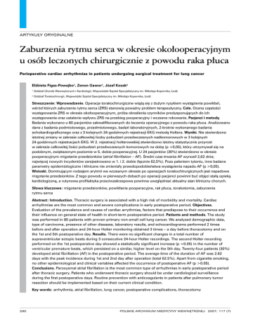 ARTYKUŁY ORYGINALNE Zaburzenia rytmu serca w okresie okołooperacyjnym u osób leczonych chirurgicznie z powodu raka płuca Perioperative cardiac arrhythmias in patients undergoing surgical treatment for lung cancer Elżbieta Figas-Powajbo1, Zenon Gawor1, Józef Kozak2 1 Oddział Chorób Wewnętrznych i Kardiologii, Wojewódzki Szpital Specjalistyczny im. Mikołaja Kopernika, Łodź 2 Oddział Torakochirurgii, Wojewódzki Szpital Specjalistyczny im. Mikołaja Kopernika, Łodź Streszczenie: Wprowadzenie. Operacje torakochirurgiczne wiążą się z dużym ryzykiem wystąpienia powikłań, wśród których zaburzenia rytmu serca (ZRS) stanowią poważny problem terapeutyczny. Cele. Ocena częstości występowania ZRS w okresie okołooperacyjnym, próba określenia czynników predysponujących do ich występowania oraz ustalenie wpływu ZRS na przebieg pooperacyjny i wczesne rokowanie. Pacjenci i metody. Badania wykonano u 80 pacjentów zakwalifikowanych do leczenia operacyjnego z powodu raka płuca. Analizowano dane z badania podmiotowego, przedmiotowego, badań laboratoryjnych, 2-krotnie wykonanego badania echokardiograficznego oraz z 3 kolejnych 24-godzinnych rejestracji EKG metodą Holtera. Wyniki. Nie stwierdzono istotnej zmiany w zakresie całkowitej liczby pobudzeń przedwczesnych nadkomorowych w 3 kolejnych 24-godzinnych rejestracjach EKG. W 2. rejestracji holterowskiej stwierdzono istotny statystycznie przyrost w zakresie całkowitej ilości pobudzeń przedwczesnych komorowych na dobę (p <0,05), który utrzymywał się na podobnym, zwiększonym poziomie w 5. dobie pooperacyjnej. U 24 pacjentów (30%) stwierdzono w okresie pooperacyjnym migotanie przedsionków (atrial fibrillation – AF). Średni czas trwania AF wynosił 2,62 dnia; najwięcej nowych incydentów zarejestrowano w 1. i 2. dobie (łącznie 62,5%). Poza paleniem tytoniu, inne badane parametry epidemiologiczne i kliniczne nie zmieniały prawdopodobieństwa wystąpienia napadu AF (p >0,05). Wnioski. Dominującym rodzajem arytmii we wczesnym okresie po operacjach torakochirurgicznych jest napadowe migotanie przedsionków. Z tego powodu w pierwszych dobach po operacji pacjenci powinni być objęci stałą opieką kardiologiczną, a rutynowa profilaktyka przeciwzakrzepowa powinna uwzględniać aktualny stan kliniczny chorych. Słowa kluczowe: migotanie przedsionków, powikłania pooperacyjne, rak płuca, torakotomia, zaburzenia rytmu serca Abstract: Introduction. Thoracic surgery is associated with a high risk of morbidity and mortality. Cardiac arrhythmias are the most common and severe complications in early postoperative period. Objectives. Evaluation of the prevalence and causes of cardiac arrythmias, factors that predispose to their occurrence and their influence on general state of health in short-term postoperative period. Patients and methods. The study was performed in 80 patients with proven primary non-small cell lung cancer. We analyzed demographic data, type of carcinoma, presence of other diseases, laboratory results, and echocardiograms performed 2 times before and after operation and 24-hour Holter monitoring obtained 3 times – a day before thoracotomy and on the 1st and 5th postoperative day. Results. There were no significant changes in a total number of supraventricular ectopic beats during 3 consecutive 24-hour Holter recordings. The second Holter recording performed on the 1st postoperative day showed a statistically significant increase (p <0.05) in the number of ventricular premature beats, which persisted on a similar, higher level on the 5th day. Twenty-four patients (30%) developed atrial fibrillation (AF) in the postoperative period. The average time of the duration of AF was 2.62 days with the peak incidence during 1st and 2nd day after operation (total 62.5%). Apart from cigarette smoking, no other epidemiological and clinical variables affected the occurrence of postoperative AF (p >0.05). Conclusions. Paroxysmal atrial fibrillation is the most common type of arrhythmias in early postoperative period after thoracic surgery. Patients who underwent thoracic surgery should be under cardiological surveillance during the first postoperative days. Routine prevention with anticoagulants in patients after pulmonary tumor resection should be implemented based on their current clinical condition. Key words: arrhythmia, atrial fibrillation, lung cancer, postoperative complications, thoracotomy 290 POLSKIE ARCHIWUM MEDYCYNY WEWNĘTRZNEJ 2007; 117 (7) ARTYKUŁY ORYGINALNE WPROWADZENIE Rak płuca od kilkudziesięciu lat stanowi ważny i stale narastający problem medyczny i społeczny. Corocznie w Polsce odnotowuje się ponad 20 tys. nowych zachorowań [1]. W przypadku niedrobnokomórkowego raka płuca, stanowiącego 75– 80% wszystkich przypadków, leczeniem z wyboru jest resekcja tkanki płucnej objętej procesem nowotworowym. Zależnie od stopnia zaawansowania nowotworu, pacjentów kwalifikuje się do wykonania lobektomii, bilobektomii lub pulmonektomii. Operacje torakochirurgiczne zaliczane są do zabiegów o dużym ryzyku wystąpienia powikłań. Wśród nich zaburzenia rytmu serca (ZRS) stanowią jeden z istotniejszych problemów. Wśród napadowych tachyarytmii nadkomorowych występujących po operacjach torakochirurgicznych najczęstsze jest migotanie/trzepotanie przedsionków (atrial fibrillation – AF), napadowy częstoskurcz nadkomorowy (supraventricular tachycardia – SVT) i liczne pobudzenia przedwczesne przedsionkowe (supraventricular beat – SVB) [2-5]. Według niektórych autorów liczne pobudzenia przedwczesne nadkomorowe w EKG przedoperacyjnym mogą zwiastować napady AF po operacji [6]. Rzadziej występują komorowe zaburzenia rytmu pod postacią licznych pobudzeń przedwczesnych (ventricular ectopic beat – VEB) lub nieutrwalonego częstoskurczu komorowego (non-sustained ventricular tachycardia – nVT) [7]. Prezentowane w piśmiennictwie poglądy na znaczenie arytmii po operacjac