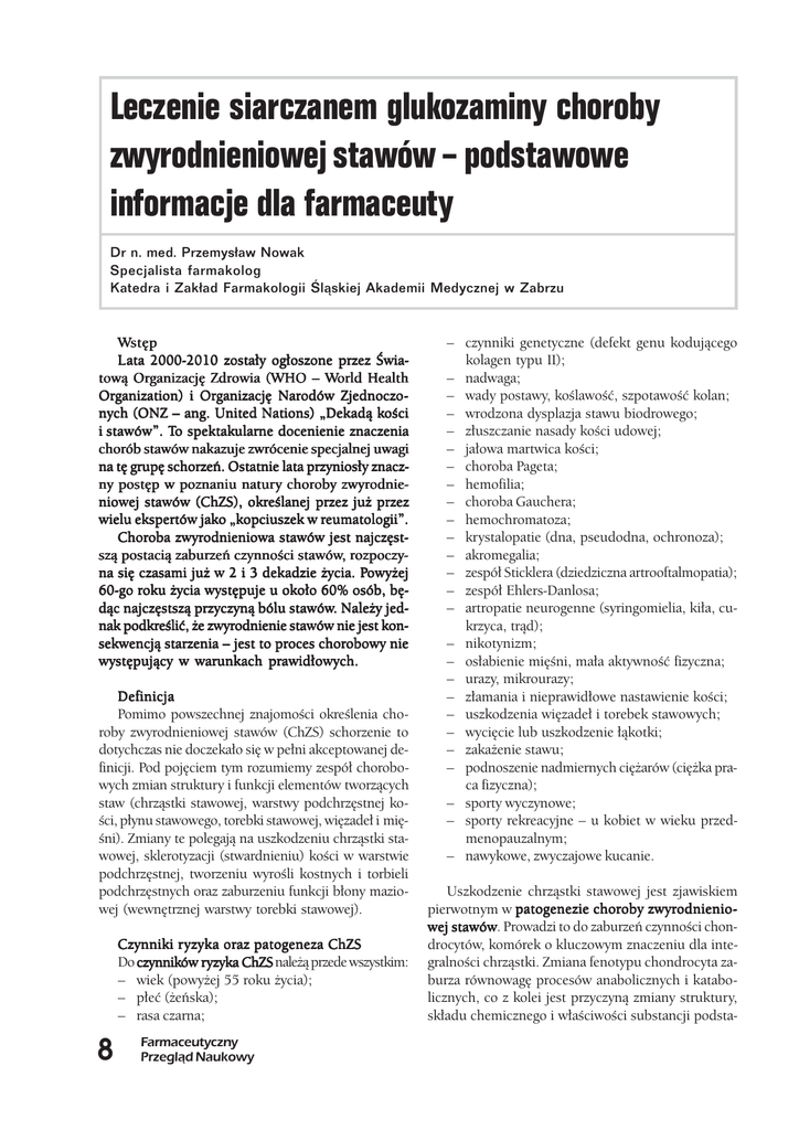 Leczenie siarczanem glukozaminy choroby zwyrodnieniowej stawów podstawowe informacje dla farmaceuty Nr 4/2007 Wysi³ek fizyczny lek bez recepty Dr n. med. Przemys³aw Nowak Specjalista farmakolog Katedra i Zak³ad Farmakologii l¹skiej Akademii Medycznej w Zabrzu Wstęp L ata 2000-2010 zostały ogłoszone przez Światową Organizację Zdrowia (WHO – W orld Health World Organization) i Organizację Narodów Zjednoczo Zjednoczo-adą kkości ości nych (ONZ – ang. United Nations) „Dek „Dekadą i stawów ”. T o spektak ularne docenienie znaczenia spektakularne stawów”. To chorób stawów nak azuje zwrócenie specjalnej uwagi nakazuje na tę grupę schorzeń. Ostatnie lata przyniosły znaczny postęp w poznaniu natur naturyy choroby zwyrodnieniowej stawów (ChZS), określanej przez już przez wielu ekspertów jako „kopciuszek w reumatologii”. Choroba zwyrodnieniowa stawów jest najczęstszą postacią zaburzeń czynności stawów stawów,, rozpoczy rozpoczy-na się czasami już w 2 i 3 dek adzie życia. P owyżej dekadzie Powyżej 60-go roku życia występuje u około 60% osób, będąc najczęstszą przyczyną bólu stawów stawów.. Należy jednak podkreślić, że zwyrodnienie stawów nie jest konsekwencją starzenia – jest to proces chorobowy nie występujący w warunk ach prawidłowych. warunkach Definicja Pomimo powszechnej znajomości określenia choroby zwyrodnieniowej stawów (ChZS) schorzenie to dotychczas nie doczekało się w pełni akceptowanej definicji. Pod pojęciem tym rozumiemy zespół chorobowych zmian struktury i funkcji elementów tworzących staw (chrząstki stawowej, warstwy podchrzęstnej kości, płynu stawowego, torebki stawowej, więzadeł i mięśni). Zmiany te polegają na uszkodzeniu chrząstki stawowej, sklerotyzacji (stwardnieniu) kości w warstwie podchrzęstnej, tworzeniu wyrośli kostnych i torbieli podchrzęstnych oraz zaburzeniu funkcji błony maziowej (wewnętrznej warstwy torebki stawowej). yzykaa oraz patogeneza ChZS Czynniki r yzyk ów rryzyk yzyk Do czynnik czynników yzykaa ChZS należą przede wszystkim: – wiek (powyżej 55 roku życia); – płeć (żeńska); – rasa czarna; & Farmaceutyczny Przegl¹d Naukowy – czynniki genetyczne (defekt genu kodującego kolagen typu II); – nadwaga; – wady postawy, koślawość, szpotawość kolan; – wrodzona dysplazja stawu biodrowego; – złuszczanie nasady kości udowej; – jałowa martwica kości; – choroba Pageta; – hemofilia; – choroba Gauchera; – hemochromatoza; – krystalopatie (dna, pseudodna, ochronoza); – akromegalia; – zespół Sticklera (dziedziczna artrooftalmopatia); – zespół Ehlers-Danlosa; – artropatie neurogenne (syringomielia, kiła, cukrzyca, trąd); – nikotynizm; – osłabienie mięśni, mała aktywność fizyczna; – urazy, mikrourazy; – złamania i nieprawidłowe nastawienie kości; – uszkodzenia więzadeł i torebek stawowych; – wycięcie lub uszkodzenie łąkotki; – zakażenie stawu; – podnoszenie nadmiernych ciężarów (ciężka praca fizyczna); – sporty wyczynowe; – sporty rekreacyjne – u kobiet w wieku przedmenopauzalnym; – nawykowe, zwyczajowe kucanie. Uszkodzenie chrząstki stawowej jest zjawiskiem pierwotnym w patogenezie choroby zwyrodnienio zwyrodnienio-wej stawów stawów. Prowadzi to do zaburzeń czynności chondrocytów, komórek o kluczowym znaczeniu dla integralności chrząstki. Zmiana fenotypu chondrocyta zaburza równowagę procesów anabolicznych i katabolicznych, co z kolei jest przyczyną zmiany struktury, składu chemicznego i właściwości substancji podsta- Leczenie siarczanem glukozaminy choroby zwyrodnieniowej stawów wowej chrząstki. Wzmożony katabolizm tkanek sprzyja zwiększonej ekspresji antygenów wewnątrzkomórkowych, niedostępnych uprzednio dla komórek układu immunologicznego. Otyłość powoduje przeciążenie stawów kończyn dolnych i przyspiesza rozwój zmian zwyrodnieniowych stawów kolanowych. Osłabienie siły mięśniowej i zaburzenia kontroli ruchowej stanowią dodatkowe czynniki ryzyka. Przeciążenie i urazy związane z wykonywanym zawodem lub aktywnością sportową mogą być przyczyną uszkodzenia chrząstki stawowej i rozwoju zmian zwyrodnieniowych. Zmiany w chrząstce związane z procesem starzenia mogą odgrywać znaczną rolę w rozwoju zmian zwyrodnieniowych i dotyczą wszystkich struktur stawu. Wrodzone anomalie układu ruchu o nieznanym podłożu (np. wrodzona dysplazja panewki stawu biodrowego, wrodzona szpotawość lub koślawość stawów) często prowadzą do rozwoju choroby zwyrodnieniowej. Choroba zwyrodnieniowa może rozwijać się w wyniku wrodzonych defektów struktury kolagenu, np. w zespole EhlersaDanlosa, a także w wyniku uwarunkowanych genetycznie defektów metabolicznych. Zmian stwierdzanych lokalnie w obrębie stawów objętych procesem chorobowym nie można jednak rozpatrywać w oderwaniu od układu immunologicznego całego ustroju. Należy podkreślić, że jest to układ immunologiczny, w którym również zachodzą zmiany związane z procesem starzenia się ustroju. Wraz z wiekiem zmieniają się proporcje subpopulacji limfocytów krążących we krwi obwodowej. Obniża się liczba limfocytów CD4+ (pomocniczych), a narasta liczba CD8+ (supresorowych/cytotoksycznych). Obniża się także liczba i aktywność limfocytów B. W hodowlach komórek jednojądrowych krwi obwodowej stwierdzono obniżenie produkcji IL-2 i wynikającą z tego obniżoną zdolność tych komórek do proliferacji, a także zmniejszoną ekspresję cząsteczki CD28, warunkującą aktywację limfocytów T podczas prezentacji antygenu. W wyniku tych przemian odpowiedź układu immunologicznego osób, u których rozwija się choroba zwyrodnieniowa, może być osłabiona. Podkreślić też trzeba, że w chorobie zwyrodnieniowej stawów proces immunologiczno-zapalny toczy się w szczególnym rodzaju tkanki, bowiem chrząstka pobawiona jest naczyń krwionośnych i naczyń li