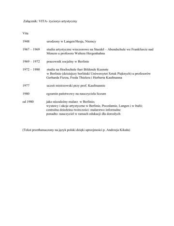 Załącznik: VITA- życiorys artystyczny Vita 1948 urodzony w Langen/Hesja, Niemcy 1967 – 1969 studia artystyczne wieczorowe na Staedel – Abendschule we Frankfurcie nad Menem u profesora Waltera Hergenhahna 1969 – 1972 pracownik socjalny w Berlinie 1972 – 1980 studia na Hochschule fuer Bildende Kuenste w Berlinie (dzisiejszy berliński Uniwersytet Sztuk Pięknych) u profesorów Gerharda Fietza, Freda Thielera i Herberta Kaufmanna 1977 uczeń mistrzowski przy prof. Kaufmannie 1980 egzamin państwowy na nauczyciela liceum od 1980 jako niezależny malarz w Berlinie; wystawy i akcje artystyczne w Berlinie, Poczdamie, Langen i w Italii; centralna dziedzina twórczości: malarstwo informalne ponadto: nauczyciel w ramach edukacji dla dorosłych (Tekst przetłumaczony na język polski dzięki uprzejmości p. Andrzeja Kikała)