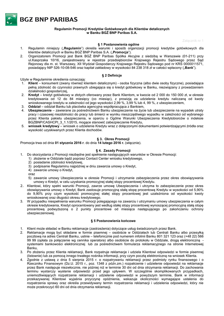 Regulamin Promocji Kredytów Gotówkowych dla Klientów detalicznych w Banku BGŻ BNP Paribas S.A. 1. 2. Załącznik nr 1 § 1 Postanowienia ogólne Regulamin niniejszy („Regulamin”) określa warunki i sposób organizacji promocji kredytów gotówkowych dla klientów detalicznych w Banku BGŻ BNP Paribas S.A. („Promocja”). Organizatorem Promocji jest Bank BGŻ BNP Paribas Spółka Akcyjne z siedzibą w Warszawie (01-211) przy ul.Kasprzaka 10/16, zarejestrowany w rejestrze przedsiębiorców Krajowego Rejestru Sądowego przez Sąd Rejonowy dla m. st. Warszawy, XII Wydział Gospodarczy Krajowego Rejestru Sądowego pod nr KRS 0000011571, posiadający NIP 526-10-08-546 oraz kapitał zakładowy w wysokości 84 238 318 zł w całości wpłacony („Bank”). § 2 Definicje Użyte w Regulaminie określenia oznaczają: 1. Klient – konsument (zwany również klientem detalicznym) - osoba fizyczna (albo dwie osoby fizyczne), posiadająca pełną zdolność do czynności prawnych ubiegająca się o kredyt gotówkowy w Banku, niezwiązany z prowadzeniem działalności gospodarczej, 2. Kredyt – kredyt gotówkowy w złotych oferowany przez Bank Klientom, w kwocie od 2 000 do 150 000 zł, w okresie kredytowania od 12 do 84 miesięcy (co miesiąc), z prowizją za udzielenie kredytu naliczaną od kwoty wnioskowanego kredytu w zależności od jego wysokości 2,99 %, 3,99 % lub 4, 99 %, z ubezpieczeniem, 3. Oddział – oddział Banku lub placówka agencyjna współpracująca z Bankiem, 4. Ubezpieczenie – zawierane za pośrednictwem Banku ubezpieczenie na życie lub ubezpieczenie na wypadek utraty pracy i czasowej niezdolności do pracy lub śmierci w wyniku nieszczęśliwego wypadku w zależności od wybranego przez Klienta pakietu ubezpieczenia, w oparciu o Ogólne Warunki Ubezpieczenia Kredytobiorców o indeksie BGZBNP/CASHCPI_3_1.1/2015, mogące stanowić zabezpieczenie Kredytu, 5. wniosek kredytowy – wniosek o udzielenie Kredytu wraz z dołączonymi dokumentami potwierdzającymi źródła oraz wysokość uzyskiwanych przez Klienta dochodów. § 3. Okres Promocji Promocja trwa od dnia 01 stycznia 2016 r. do dnia 14 lutego 2016 r. (włącznie). § 4. Zasady Promocji Do skorzystania z Promocji niezbędne jest spełnienie następujących warunków w Okresie Promocji: 1) złożenie w Oddziale bądź poprzez Contact Center wniosku kredytowego, 2) posiadanie zdolności kredytowej, 3) podpisanie Regulaminu najpóźniej w dniu zawarcia umowy o Kredyt, 4) zawarcie umowy o Kredyt, oraz 5) zawarcie umowy Ubezpieczenia w okresie Promocji i utrzymanie zabezpieczenia przez okres obowiązywania umowy o Kredyt, w celu uzyskania promocyjnej stałej stopy procentowej Kredytu. 2. Klientowi, który spełni warunki Promocji, zawrze umowę Ubezpieczenia i utrzyma to zabezpieczenie przez okres obowiązywania umowy o Kredyt, Bank zastosuje promocyjną stałą stopę procentową Kredytu w wysokości od 5,90% do 9,90% przy czym wysokość promocyjnej stałej stopy procentowej jest uzależniona od wysokości kwoty wnioskowanej oraz długości okresu kredytowego. 3. W przypadku niespełnienia warunku Promocji polegającego na zawarciu i utrzymaniu umowy ubezpieczenia w całym okresie kredytowania, Kredyt oprocentowany jest według stałej stopy procentowej wynoszącej promocyjną stałą stopę procentową podwyższoną o 2 punkty procentowe od miesiąca następującego po zakończeniu ochrony ubezpieczeniowej. 1. § 5 Postanowienia końcowe 1. 2. 3. 4. Klient może składać w Banku reklamacje (zastrzeżenia) dotyczące usług świadczonych przez Bank. Reklamacje mogą być składane w formie pisemnej – osobiście w Oddziałach lub Centrali Banku albo przesyłką pocztową na adres Centrali Banku, ustnie – telefonicznie pod numerem infolinii Banku 801 321 123 oraz (+48 22) 566 99 99 (opłata za połączenie wg cennika operatora) albo osobiście do protokołu w Oddziale, drogą elektroniczną systemami bankowości elektronicznej lub za pośrednictwem formularza reklamacyjnego na stronie Internetowej Banku, Po złożeniu przez Klienta reklamacji, Bank rozpatruje reklamacje i udziela Klientowi odpowiedzi w formie pisemnej (listownie) lub za pomocą innego trwałego nośnika informacji, przy czym pocztą elektroniczną na wniosek Klienta. Zgodnie z ustawą z dnia 5 sierpnia 2015 r. o rozpatrywaniu reklamacji przez podmioty rynku finansowego i o Rzeczniku Finansowym (Dz.U. 2015 r., poz. 1348 z późn.zm.) rozpatrzenie i udzielenie odpowiedzi na reklamacje przez Bank następuje niezwłocznie, nie później niż w terminie 30 dni od dnia otrzymania reklamacji. Do zachowania terminu wystarczy wysłanie odpowiedzi przed jego upływem. W szczególnie skomplikowanych przypadkach, uniemożliwiających rozpatrzenie reklamacji i udzielenie odpowiedzi w powyższym terminie, Bank w informacji przekazywanej Klientowi wyjaśnia przyczynę opóźnienia, wskazuje okoliczności wymagające ustalenia do rozpatrzenia sprawy oraz określa przewidywany termin rozpatrzenia reklamacji i udzielenia odpowiedzi, który nie może przekroczyć 60 dni od dnia otrzymania reklamacji. 5. 6. 7. Postępowanie reklamacyjne Banku nie wyłącza roszczeń Klienta wynikających z przepisów prawa właściwego dla Regulaminu. Administratorem danych osobowych Klienta w rozumieniu ustawy z dnia 29 sierpnia 1997 r. o ochronie danych osobowych (tj. Dz.U. z 2014 r. , poz. 1182, z późn. zm.) jest Bank. Podanie danych osobowych jest dobrowolne. Dane osobowe Klienta będą przetwarzane przez Bank w celu przeprowadzenia Promocji. Klientowi przysługuje prawo dostępu do treści swoich danych osobowych, ich poprawiania oraz żądania usunięcia. Akceptuje Regulamin …….……………………….……………… Data i podpis Klienta/Klientów …....…..……………………… Data i podpis za Bank