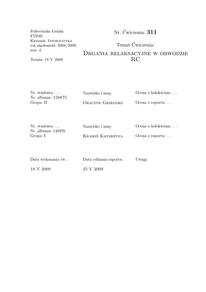 Politechnika Łódzka FTIMS Kierunek: Informatyka rok akademicki: 2008/2009 sem. 2. Termin: 18 V 2009 Nr. Ćwiczenia: 311 Temat Ćwiczenia: Drgania relaksacyjne w obwodzie RC Nr. studenta: . . . Nr. albumu: 150875 Grupa: II Nazwisko i imię: Ocena z kolokwium: . . . Graczyk Grzegorz Ocena z raportu: . . . Nr. studenta: . . . Nr. albumu: 148976 Grupa: I Nazwisko i imię: Ocena z kolokwium: . . . Krasoń Katarzyna Ocena z raportu: . . . Data wykonania ćw.: Data oddania raportu: Uwagi: 18 V 2009 25 V 2009 Wstęp Celem ćwiczenia było wyznaczenie okresu drgań T obwodu RC, dla różnych znanych wartości R i C. A także wyznaczenie nieznanych wartości Rx i Cx oraz szacowanie napięcia zapłonu Uz i napięcia gaśnięcia Ug neonówki. Opis metody i przebieg pomiarów W obwodzie RC, podczas powtarzającego się procesu ładowania i rozładowywania kondensatora C przez opornik R, powstają drgania relaksacyjne. Obwód przy pomocy, którego badamy drgania relaksacyjne musi zatem zawierać elementem, który reguluje samoczynnie czas ładowania i rozładowywania. W układzie znajdującym się w pracowni (Rysunek 1) elementem tym jest neonówka - lampa elektronowa wypełniona neonem pod małym ciśnieniem (ok. 60hPa). Neonówka posiada dwie charakterystyczne dla niej wielkości napięcia, napięcie zapłonu Uz , powyżej którego zaczyna gwałtownie płynąć prąd, co spowodowane jest tzw. lawinową jonizacją gazu oraz napięcie gaśnięcia Ug , poniżej którego przepływ prądu ustaje. Wielkości te spełniają zależność Uz > Ug . Rysunek 1: Schemat układu do badania drgań relaksacyjnych w obwodzie RC. Z chwilą włączenia włącznika W rozpoczyna się proces ładowania kondensatora C przez znajdujący się w układzie opornik o dużej wartości R oraz wzrasta napięcie na okładkach kondensatora. Gdy wzrastające napięcie osiągnie wartość Uz , lampa N przewodzi prąd i następuje szybkie rozładowanie kondensatora przez mały opór wewnętrzny świecącej neonówki. Natomiast gdy napięcie na kondensatorze spada do napięcia Ug , to następuje przerwanie przewodzenia prądu przez neonówkę i rozpoczyna się proces ponownego ładowania kondensatora. Opisany w ten sposób proces powtarza się cyklicznie, a jego rezultatem są drania relaksacyjne (Rysunek 2). Okres drgań T równy jest sumie czasu t1 - w jakim następuje wzrost napięcia na kondensatorze od wartości Ug do Uz oraz czasu t2 - w jakim następuje rozładowanie kondensatora przez neonówkę. Opór R, przez który ładowany jest kondensator jest znacznie większy od oporu świecącej neonówki, a zatem możemy przyjąć z dostateczną dokładnością, że T = t1 (ponieważ t1 t2 ). W takim przypadku, okres drgań relaksacyjnych badanego obwodu równy jest T = RCln U − Ug U − Uz , (1) gdzie przez U oznaczone zostało napięcie zasilania. Grzegorz Graczyk i Katarzyna Krasoń, Ćw. 311 2/6 Rysunek 2: Przebieg zmian napięcia na neonówce w trakcie drgań relaksacyjnych. Dla oszacowania wartości napięcia zapłonu i gaśnięcia wzór (1) musi zostać odpowiednio przekształcony, a zatem dla danej neonówki oraz ustalonego napięcia zasilania możemy zapisać T = KRC, (2) gdzie K oznacza stałą układu równą wartości logarytmu występującego we wzorze (1). Dla napięcia zasilania o wartości U1 mamy zatem T1 = K1 RC, (3) T2 = K2 RC. (4) a dla wartości napięcia zasilania U2 Napięcie zapłonu i gaśnięcia neonówki liczymy odpowiednio ze wzorów: U2 (exp K2 − 1) − U1 (exp K1 − 1) , exp K2 − exp K1 (5) U2 (exp K2 − 1) exp K1 − U1 (exp K1 − 1) exp K2 . exp K2 − exp K1 (6) Uz = Uz = Natomiast dla nieznanej wartości oporu Rx wzory (3) i (4) możemy zapisać T1 = K1 RC (7) T2 = K2 RC, (7’) lub skąd Rx = T1 K1 C (8) Rx = T2 . K2 C (8’) lub Analogicznie dla szukanej pojemności Cx mamy Cx = T1 K1 R Grzegorz Graczyk i Katarzyna Krasoń, Ćw. 311 (9) 3/6 lub Cx = T2 . K2 R (9’) W celu wyznaczenia okresu drgań lampy T wybieramy pożądane napięcie U1 lub U2 , włączamy wyłącznik W , a następnie po wybraniu określonych (znanych) wartości R oraz C rozpoczynamy ładowanie kondensatora poprzez włączenie klucza K. Wyznaczamy czas kilkudziesięciu następujących po sobie błyśnięć lampy. Analogicznie przeprowadzamy doświadczenie dla nieznanych wartości oporu Rx oraz pojemności Cx . Wyniki pomiarów Pomiary wykonano dla dwóch napięć: U1 = 200V i U2 = 170V . R[M Ω] 1.8 3 3.9 5.1 10 R1 R2 R3 1.8 3 3.9 5.1 10 R1 R2 R3 1.8 3 3.9 5.1 10 R1 R2 R3 1.8 3 3.9 5.1 10 R1 R2 R3 C[µF ] 0.47 0.47 0.47 0.47 0.47 0.47 0.47 0.47 1 1 1 1 1 1 1 1 C1 C1 C1 C1 C1 C1 C1 C1 C2 C2 C2 C2 C2 C2 C2 C2 t1 [s] 6.08 7.56 8.01 8.73 14.62 4.32 5.98 8.27 7.96 9.90 12.73 17.37 33.15 7.06 8.01 15.07 2.83 5.94 6.30 7.24 10.71 2.38 3.82 6.42 6.30 7.02 7.29 9.04 17.46 5.26 6.30 8.37 Grzegorz Graczyk i Katarzyna Krasoń, Ćw. 311 t2 [s] 7.11 7.96 10.48 14.71 28.66 6.03 6.39 12.46 12.15 17.75 23.26 32.66 62.02 9.09 13.14 28.71 5.22 6.34 7.11 10.93 21.10 4.00 5.80 9.54 7.33 9.49 12.51 17.10 33.66 5.80 7.87 14.80 T1 [s] 0.3040 0.3780 0.4005 0.4365 0.7310 0.2160 0.2990 0.4135 0.3980 0.4950 0.6365 0.8685 1.6575 0.3530 0.4005 0.7535 0.1415 0.2970 0.3150 0.3620 0.5355 0.1190 0.1910 0.3210 0.3150 0.3510 0.3645 0.4520 0.8730 0.2630 0.3150 0.4185 T2 [s] 0.3555 0.3980 0.5240 0.7355 1.4330 0.3015 0.3195 0.6230 0.6075 0.8875 1.1630 1.6330 3.1010 0.4545 0.6570 1.4355 0.2610 0.3170 0.3555 0.5465 1.0550 0.2000 0.2900 0.4770 0.3665 0.4745 0.6255 0.8550 1.6830 0.2900 0.3935 0.7400 4/6 R[M Ω] 1.8 3 3.9 5.1 10 R1 R2 R3 R3 C[µF ] C3 C3 C3 C3 C3 C3 C3 C3 C3 t1 [s] 9.45 13.77 17.64 23.98 46.12 7.92 10.35 20.65 20.65 t2 [s] 16.60 24.56 32.22 44.64 88.36 12.69 18.22 38.96 38.96 T1 [s] 0.4725 0.6885 0.8820 1.1990 2.3060 0.3960 0.5175 1.0325 1.0325 T2 [s] 0.8300 1.2280 1.6110 2.2320 4.4180 0.6345 0.9110 1.9480 1.9480 Obliczenia Korzystając z metody najmniejszych kwadratów: K1 = 0.169 ± 0.007 K2 = 0.308 ± 0.006 Rysunek 3: Wykres zależności K o