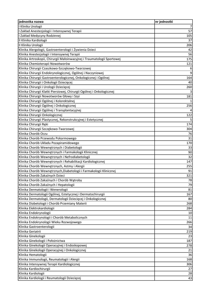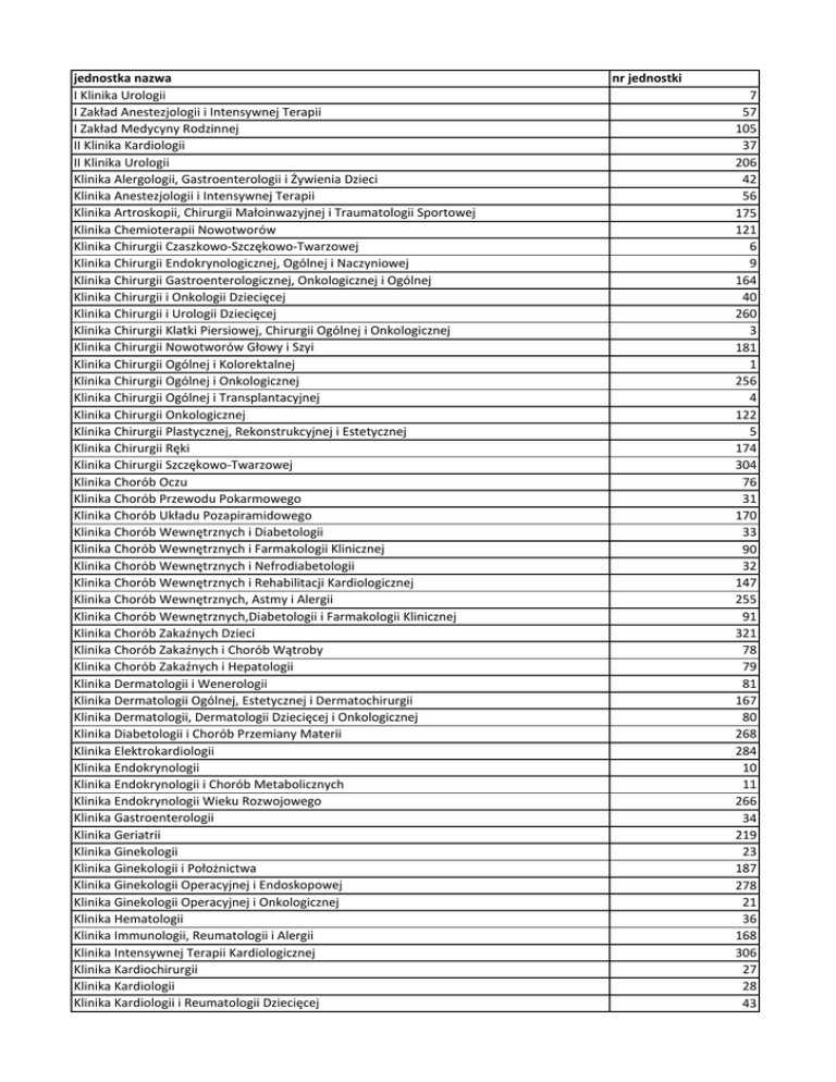 jednostka nazwa I Klinika Urologii I Zakład Anestezjologii i Intensywnej Terapii I Zakład Medycyny Rodzinnej II Klinika Kardiologii II Klinika Urologii Klinika Alergologii, Gastroenterologii i Żywienia Dzieci Klinika Anestezjologii i Intensywnej Terapii Klinika Artroskopii, Chirurgii Małoinwazyjnej i Traumatologii Sportowej Klinika Chemioterapii Nowotworów Klinika Chirurgii Czaszkowo-Szczękowo-Twarzowej Klinika Chirurgii Endokrynologicznej, Ogólnej i Naczyniowej Klinika Chirurgii Gastroenterologicznej, Onkologicznej i Ogólnej Klinika Chirurgii i Onkologii Dziecięcej Klinika Chirurgii i Urologii Dziecięcej Klinika Chirurgii Klatki Piersiowej, Chirurgii Ogólnej i Onkologicznej Klinika Chirurgii Nowotworów Głowy i Szyi Klinika Chirurgii Ogólnej i Kolorektalnej Klinika Chirurgii Ogólnej i Onkologicznej Klinika Chirurgii Ogólnej i Transplantacyjnej Klinika Chirurgii Onkologicznej Klinika Chirurgii Plastycznej, Rekonstrukcyjnej i Estetycznej Klinika Chirurgii Ręki Klinika Chirurgii Szczękowo-Twarzowej Klinika Chorób Oczu Klinika Chorób Przewodu Pokarmowego Klinika Chorób Układu Pozapiramidowego Klinika Chorób Wewnętrznych i Diabetologii Klinika Chorób Wewnętrznych i Farmakologii Klinicznej Klinika Chorób Wewnętrznych i Nefrodiabetologii Klinika Chorób Wewnętrznych i Rehabilitacji Kardiologicznej Klinika Chorób Wewnętrznych, Astmy i Alergii Klinika Chorób Wewnętrznych,Diabetologii i Farmakologii Klinicznej Klinika Chorób Zakaźnych Dzieci Klinika Chorób Zakaźnych i Chorób Wątroby Klinika Chorób Zakaźnych i Hepatologii Klinika Dermatologii i Wenerologii Klinika Dermatologii Ogólnej, Estetycznej i Dermatochirurgii Klinika Dermatologii, Dermatologii Dziecięcej i Onkologicznej Klinika Diabetologii i Chorób Przemiany Materii Klinika Elektrokardiologii Klinika Endokrynologii Klinika Endokrynologii i Chorób Metabolicznych Klinika Endokrynologii Wieku Rozwojowego Klinika Gastroenterologii Klinika Geriatrii Klinika Ginekologii Klinika Ginekologii i Położnictwa Klinika Ginekologii Operacyjnej i Endoskopowej Klinika Ginekologii Operacyjnej i Onkologicznej Klinika Hematologii Klinika Immunologii, Reumatologii i Alergii Klinika Intensywnej Terapii Kardiologicznej Klinika Kardiochirurgii Klinika Kardiologii Klinika Kardiologii i Reumatologii Dziecięcej nr jednostki 7 57 105 37 206 42 56 175 121 6 9 164 40 260 3 181 1 256 4 122 5 174 304 76 31 170 33 90 32 147 255 91 321 78 79 81 167 80 268 284 10 11 266 34 219 23 187 278 21 36 168 306 27 28 43 Klinika Kardiologii Interwencyjnej i Zaburzeń Rytmu Serca Klinika Medycyny Matczyno-Płodowej i Ginekologii Klinika Medycyny Płodu i Ginekologii Klinika Nefrologii, Hipertensjologii i Transplantologii Nerek (Oddział Dializ) Klinika Nefrologii, Nadciśnienia Tętniczego i Medycyny Rodzinnej Klinika Neonatologii Klinika Neurochirurgii i Chirurgii Nerwów Obwodowych Klinika Neurochirurgii i Onkologii Układu Nerwowego Klinika Neurologii Klinika Neurologii i Epileptologii z Oddziałem Udarowym Klinika Okulistyki i Rehabilitacji Wzrokowej Klinika Onkologii i Hematologii Dziecięcej Klinika Ortopedii i Ortopedii Dziecięcej Klinika Ortopedii i Traumatologii Klinika Otolaryngologii i Laryngologii Onkologicznej Klinika Otolaryngologii i Onkologii Laryngologicznej Klinika Otolaryngologii, Audiologii i Foniatrii Dzieci Klinika Patologii Ciąży Klinika Pediatrii, Kardiologii Prewencyjnej i Immunologii Wieku Rozwojowego Klinika Pediatrii, Onkologii, Hematologii i Diabetologii Klinika Perinatologii Klinika Pneumonologii i Alergologii Klinika Propedeutyki Pediatrii i Chorób Metabolicznych Kości Klinika Psychiatrii Dorosłych Klinika Psychiatrii Młodzieżowej Klinika Psychiatrii Wieku Podeszłego i Zaburzeń Psychotycznych Klinika Pulmonologii Ogólnej i Onkologicznej Klinika Rehabilitacji i Medycyny Fizykalnej Klinika Rehabilitacji Medycznej Klinika Zaburzeń Afektywnych i Psychotycznych Oddział Kliniczny Chirurgii Klatki Piersiowej i Rehabilitacji Oddechowej Oddział Kliniczny Chirurgii Rekonstrukcyjnej i Artroskopowej Stawu Kolanowego Oddział Kliniczny Ginekologii Onkologicznej Oddział Kliniczny Intensywnej Terapii i Anestezjologii Oddział Kliniczny Interny Dziecięcej i Alergologii Oddział Kliniczny Medycyny Ratunkowej dla Dzieci Oddział Kliniczny Pneumonologii Oddział Kliniczny Rehabilitacji Pourazowej Oddział Zdrowia Publicznego Pracownia Genetyki Molekularnej Pracownia Medycyny Paliatywnej Zakład Alergologii i Rehabilitacji Oddechowej Zakład Anatomii Prawidłowej Zakład Anatomii Prawidłowej i Klinicznej Zakład Angiologii Zakład Audiologii i Foniatrii Zakład Audiologii, Foniatrii i Otolaryngologii Dziecięcej Zakład Badań Neuropeptydów Zakład Biochemii Farmaceutycznej Zakład Biochemii Hormonów Zakład Biochemii Kwasów Nukleinowych Zakład Biochemii Medycznej Zakład Bioetyki Zakład Biofarmacji Zakład Biofizyki Zakład Biofizyki Molekularnej i Medycznej 30 262 22 38 204 259 118 117 119 120 77 297 126 127 130 131 45 24 46 41 25 39 47 143 269 144 320 148 128 145 222 224 172 179 48 247 184 294 163 248 123 98 115 112 113 132 177 243 71 227 217 198 103 60 264 16 Zakład Biologii i Botaniki Farmaceutycznej Zakład Biologii i Genetyki Medycznej Zakład Biologii i Parazytologii Lekarskiej Zakład Biologii Molekularnej Zakład Biologii Molekularnej Nowotworów Zakład Biologii Nowotworów Zakład Biologii Strukturalnej Zakład Biologii Środowiskowej Zakład Biomechaniki i Zaopatrzenia Protetyczno-Ortopedycznego Zakład Biotechnologii Farmaceutycznej Zakład Biotechnologii Medycznej Zakład Bromatologii Zakład Chemii Analitycznej Zakład Chemii Biomedycznej Zakład Chemii Biomolekularnej Zakład Chemii Bionieorganicznej Zakład Chemii Bioorganicznej Zakład Chemii Farmaceutycznej i Analizy Leków Zakład Chemii Fizycznej i Biokoordynacyjnej Zakład Chemii i Biochemii Klinicznej Zakład Chemii Surowców Kosmetycznych Zakład Chirurgii Doświadczalnej Zakład Chirurgii Stomatologicznej Zakład Cytofizjologii, H