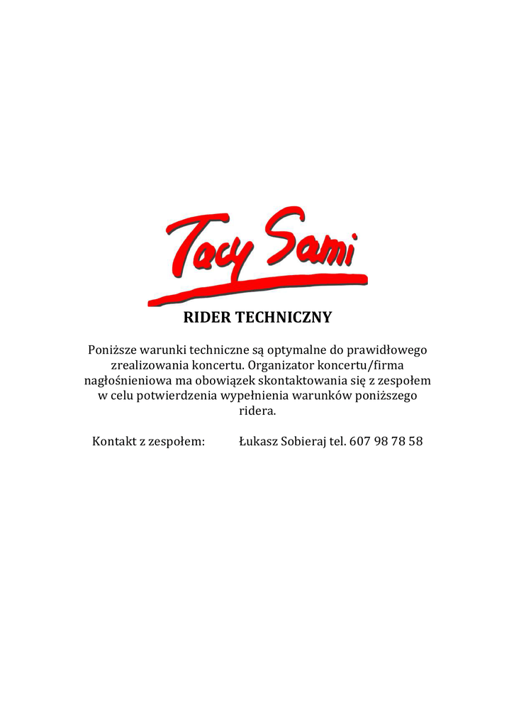 ! ! ! ! ! ! ! RIDER%TECHNICZNY% ! ! Poniższe!warunki!techniczne!są!optymalne!do!prawidłowego! zrealizowania!koncertu.!Organizator!koncertu/firma! nagłośnieniowa!ma!obowiązek!skontaktowania!się!z!zespołem! w!celu!potwierdzenia!wypełnienia!warunków!poniższego! ridera.! ! Kontakt!z!zespołem:! ! Łukasz!Sobieraj!tel.!607!98!78!58! NAGŁOŚNIENIE) ! Solidny! zestaw! trójdrożny! o! mocy! nie! mniejszej,! niż! 3! kW! na! stronę.! Głośniki! niskotonowe! ! (subwoofer! /! subbass)! powinny! być! postawione! jak! najniżej,!najlepiej!na!ziemi.!! Zestaw!musi!umożliwić!natężenie!dźwięku!na!poziomie!100!dB!! w!centralnym!punkcie!widowni!/sali.!! ! W! przypadku! małych! eventów! jesteśmy! bardzo! elastyczni! i! zazwyczaj! akceptujemy! nagłośnienie! o! mniejszej! mocy.! Prosimy! jednak! o! każdorazowy! kontakt!w!tej!sprawie!w!celu!akceptacji.! ! Stół! mikserski! powinien! mieć! na! każdym! kanale! tzw.! 2! środki! parametryczne.! Potrzebujemy! minimum! 13! torów! +! 2! tory! CD! player! (intro,! efekty,!etc).!Patrz&Input&List.& ! Peryferia! –! potrzebujemy! podstawowe! elementy:! kompresory,! bramki,! reverb,!delay.! Preferujemy!sprzęt!FIRMOWY.!Unikamy!sprzętu!marki!BEHRINGER!(chyba,!że! np.!X32!!)! !! Sprzęt! nie! firmowy! (np.! kolumny! głośnikowe)! jest! ewentualnie! do! zaakceptowania! przez! zespół,! ale! musi! to! być! solidnie! wykonany! sprzęt! spełniający! profesjonalne! standardy.! Nie! firmowy! sprzęt! musi! być! zaakceptowany!uprzednio!przez!zespół.! ! ! Wokalista! musi! mieć! głośny! odsłuch.! Konieczne! są! 2! głośne! kolumny! odsłuchowe! (wedge)! w! torze! głównego! wokalu.! Tor! głównego! wokalu! powinien!mieć!możliwość!equalizacji.!! ! Prosimy! o! 5! niezależnych! torów! odsłuchowych.! Mniejsza! liczba! torów! ewentualnie!możliwa!po!uprzednim!zaakceptowaniu!przez!zespół.! ! SCENA) ) W! przypadku! koncertów! plenerowych! minimalne! wymiary! sceny! to! 6x6m,! wysokość! min.! 0,6! m.! Przód! sceny! (podesty)! powinien! być! osłonięty! ciemnym!materiałem!lub!banerami.! Scena!koniecznie!musi!być!zadaszona.! W!przypadku!eventów!jesteśmy!elestyczni!i!na!pewno!porozumiemy!się!co!do! wymiarów!sceny.!Prosimy!jednak!o!kontakt!w!tej!sprawie.! ! OŚWIETLENIE) ! Minimalne!oświetlenie!sceniczne!to!np.!zestaw:! g!8!szt.!kolorowych!świateł!Par!64!(najlepiej!led),! g!2!szt.!świateł!bałych!moc!min.!1000!Watt,! g!kilka!elementów!led,!np.!Led!Bar! g!2!głowy!ruchome!spot/wash! Oczywiscie!konfiguracja!może!być!inna,!ale!daje!to!pogląd!na!ogólne!minimalne! wymagania!zespołu.! W!razie!problemów!prosimy!o!kontakt,!na!pewno!jakos!się!porozumiemy!i!w!tej! kwestii.!:))! ! GARDEROBA) ! ! g 10!butelek!(0,5)!niegazowanej!wody!mineralnej!(temperatura!pokojowa)! g kawa! g herbata!! BACKLINE)(Przywozi)zespół)) Drums:) ) Mapex!ProM!! 10x8“!Rack!Tom! 12“x9“!Rack!Tom! 14“x11“!Rack!Tom! 16“x14“!Rack!Tom! 14“x5,5“!Snare!Drum! 22“x18“!Kick!Drum! ! Cymbals:) 14“!Sabian!Regular!HigHat! 17“!Paiste!Dimensions!Medium!Thin!Crash! 18“!Paiste!2000!Color!Sound! 20“!Paiste!Dimensions!Power!Crash! ! Bass:) Thunderfunk!TFB750gA! EBS!Evolution!Pro!Line!2000!Cabinet!2x10“! Aguilar!GS!112NT!1x12“! ! Guitars:! Marshall!JCM800!Amplifier! Marshall!1936!Cabinet!2x12“! Custom!Audio!Amplifier! Noisy!Box!!2x12“! Fractal!Axe!FX!II! ! W"przypadku"gdy"zespół"po"przybyciu"na"koncert"napotka"warunki"techniczne"niespełniające"poniższego"ridera,!organizator) musi%liczyć%się%z%wykonaniem%koncertu%artysty%z%playbacku.& ! ! ! ! ! ! Lp% 1.! 2.! 3.! 4.! 5.! 6.! 7.! 8.! 9.! ! 10.! 11! 13.! ! 14.! 15.! 16.! 17# 18.# ! Instrument% Bass!Drum! Snare!Top! Snare!Bottom! Hi?Hat! Rack!Tom!1! Rack!Tom!2! Rack!Tom!3! Overhead!L! Overhead!R! Drums!Group! Bass! Lead!Guitar!L! Lead!Guitar!R! Lead!Guitar!Group! Backing!Vox!! Lead!Vox! Talk!Back! Audio#Track#L# Audio#Track#R# Source% Shure!Beta52A! Shure!SM57! Shure!SM57! Shure!SM81! Sennheiser!e904! Sennheiser!e904! Sennheiser!e904! Shure!SM81! Shure!SM81! ! XLR/!Shure!SM57! Shure!SM57! Shure!SM57! ! Shure!SM58! Sennheiser!e945!! SM58! CD/MiniDisk# CD/MiniDisk# INPUT%LIST% ! Tel.!Łukasz!Sobieraj!607!98!78!58! FOH% Gate! !Compressor! Gate,!Compressor! ! Gate! Gate! Gate! ! ! Compressor! Compressor! ! ! ! Compressor! Compressor,!Reverb!(Small!Room)! ! ! ! TACY%SAMI% 14" 15" 16# 13" " X" X" " " " " " " " " X" X" " " X" X" X# Gate" Gate" " " " " " " " " " " " " " " # Monitor%Insert% Drum%Fill% S1/S2"–"Lead"Vox"Wireless"System" S3"–"Bass/Backing"Vox"2"Monitor" S4"–"Lead"Guitar"L/Backing"Vox"1"Monitor" S5%–"Lead"Guitar"R"Monitor"" " " Bass"Drum" Snare"Drum"Top" Snare"Drum"Bottom" Hi8Hat" Rack"Tom"1" Rack"Tom"2" Rack"Tom"3" Overhead"L" Overhead"R" Drums"Group" Bass" Lead"Guitar L Lead"Guitar R Lead"Guitars"Group" Backing"Vox" Backing"Vox"Group" Lead"Vox" Spare" Audio#Track## 1" 2" 3" 4" 5" 6" 7" 8" 9" 10" 11" 12" Instrument% Lp% MONITOR%LIST% TACY%SAMI " % X X" " X" X" X# Wireless% System% " " " " " " " " " X" X" X" " X" X" /# X" X" " X" " " " " " " X" X X " X" X" X# X" " " X" " " " " " " X" X X S4% S5% " " %%%%%%%%%%%%%%%%%Tel."Łukasz"Sobieraj"607"98"78"58" X " " X" X" X# X" X" " X" " " " " " " X" S3% S4% fgfgfg S1% D R U M % F% I% L% L% S2% S3% STAGE%PLAN% TACY%SAMI% S5%