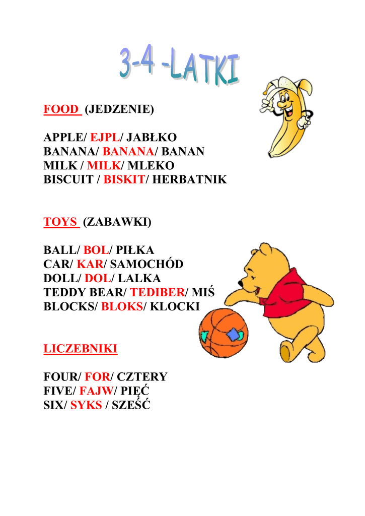FOOD (JEDZENIE) APPLE/ EJPL/ JABŁKO BANANA/ BANANA/ BANAN MILK / MILK/ MLEKO BISCUIT / BISKIT/ HERBATNIK TOYS (ZABAWKI) BALL/ BOL/ PIŁKA CAR/ KAR/ SAMOCHÓD DOLL/ DOL/ LALKA TEDDY BEAR/ TEDIBER/ MIŚ BLOCKS/ BLOKS/ KLOCKI LICZEBNIKI FOUR/ FOR/ CZTERY FIVE/ FAJW/ PIĘĆ SIX/ SYKS / SZEŚĆ MY ROOM (MÓJ POKÓJ) BED/ BED/ ŁÓŻKO CHAIR/ CZER/ KRZESŁO TABLE/ TEJBL/ STÓŁ PICTURE/ PIKCZER/ OBRAZ DOOR/ DOR/ DRZWI WINDOW/ ŁINDOŁ/ OKNO FOOD (JEDZENIE) FISH/ FISZ/ RYBA WATER/ ŁOTER/ WODA BREAD/ BRED/ CHLEB CHEESE/ CZIS/ SER CHICKEN/ CZIKEN/ KURCZAK APPLE/ EJPL/ JABŁKO BANANA/ BANANA/ BANAN MILK/ MILK/ MLEKO BISCUIT/ BISKIT/ HERBATNIK MY ROOM (MÓJ POKÓJ) BED/ BED/ ŁÓŻKO CHAIR/ CZER/ KRZESŁO TABLE/ TEJBL/ STÓŁ PICTURE/ PIKCZER/ OBRAZ DOOR/ DOR/ DRZWI WINDOW/ ŁINDOŁ/ OKNO FOOD (JEDZENIE) FISH/ FISZ/ RYBA WATER/ ŁOTER/ WODA BREAD/ BRED/ CHLEB CHEESE/ CZIS/ SER CAKE/ KEJK/ CIASTO CHICKEN/ CZIKEN/ KURCZAK JUICE/ DŻUS/ SOK APPLE/ EJPL/ JABŁKO BANANA/ BANANA/ BANAN MILK/ MILK/ MLEKO BISCUIT/ BISKIT/ HERBATNIK LEMON/ LEMON/ CYTRYNA POTATO/ POTEJTOŁ/ ZIEMNIAK