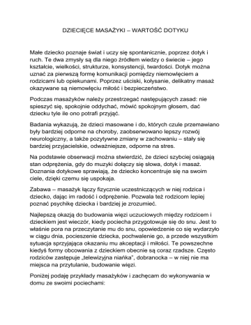 DZIECIĘCE MASAŻYKI – WARTOŚĆ DOTYKU Małe dziecko poznaje świat i uczy się spontanicznie, poprzez dotyk i ruch. Te dwa zmysły są dla niego źródłem wiedzy o świecie – jego kształcie, wielkości, strukturze, konsystencji, twardości. Dotyk można uznać za pierwszą formę komunikacji pomiędzy niemowlęciem a rodzicami lub opiekunami. Poprzez uściski, kołysanie, delikatny masaż okazywane są niemowlęciu miłość i bezpieczeństwo. Podczas masażyków należy przestrzegać następujących zasad: nie spieszyć się, spokojnie oddychać, mówić spokojnym głosem, dać dziecku tyle ile ono potrafi przyjąć. Badania wykazują, że dzieci masowane i do, których czule przemawiano były bardziej odporne na choroby, zaobserwowano lepszy rozwój neurologiczny, a także pozytywne zmiany w zachowaniu – stały się bardziej przyjacielskie, odważniejsze, odporne na stres. Na podstawie obserwacji można stwierdzić, że dzieci szybciej osiągają stan odprężenia, gdy do muzyki dołączy się słowa, dotyk i masaż. Doznania dotykowe sprawiają, że dziecko koncentruje się na swoim ciele, dzięki czemu się uspokaja. Zabawa – masażyk łączy fizycznie uczestniczących w niej rodzica i dziecko, dając im radość i odprężenie. Pozwala też rodzicom lepiej poznać psychikę dziecka i bardziej je zrozumieć. Najlepszą okazją do budowania więzi uczuciowych między rodzicem i dzieckiem jest wieczór, kiedy pociecha przygotowuje się do snu. Jest to właśnie pora na przeczytanie mu do snu, opowiedzenie co się wydarzyło w ciągu dnia, pocieszenie dziecka, pochwalenie go, a przede wszystkim sytuacja sprzyjająca okazaniu mu akceptacji i miłości. Te powszechne kiedyś formy obcowania z dzieckiem obecnie są coraz rzadsze. Często rodziców zastępuje „telewizyjna niańka”, dobranocka – w niej nie ma miejsca na przytulanie, budowanie więzi. Poniżej podaję przykłady masażyków i zachęcam do wykonywania w domu ze swoimi pociechami: IDZIE PANI, WIETRZYK WIEJE Idzie pani: tup, tup, tup Dziadek laską: stuk, stuk, stuk, Dziecko zwrócone do rodziców plecami. Na przemian, z wyczuciem stukamy w jego plecy opuszkami palców wskazujących, delikatnie stukamy zgiętym palcem. Skacze dziecko: hop, hop, hop Naśladujemy dłonią skoki, na przemian opierając ją na przegubie i na palcach; Żaba robi długi skok. Z wyczuciem klepiemy dwie odległe części ciała dziecka, np. stopy i głowę, Wieje wietrzyk: fiu, fiu, fiu Dmuchamy w jedno i w drugie ucho dziecka, Kropi deszczyk: puk, puk, puk, Delikatnie stukamy w plecy wszystkimi palcami. Deszcz ze śniegiem: chlup, Klepiemy dziecko po plecach dłońmi złożonymi w „miseczki” chlup, chlup, A grad w szyby: łup, łup, łup. Lekko stukamy dłońmi złożonymi w pięści, Świeci słonko, Gładzimy plecy wewnętrzną stroną dłoni ruchem kolistym. wieje wietrzyk, Dmuchamy we włosy dziecka, pada deszczyk. Z wyczuciem stukamy opuszkami palców w plecy dziecka. Czujesz dreszczyk? Leciutko szczypiemy w kark. LIST DO BABCI Kochana Babciu. Masujemy plecy dziecka otwartą dłonią, następnie piszemy palcem. KROPKA. Naciskamy plecy w jednym miejscu. Piszę Ci, że Kontynuujemy pisanie. Mamy w domu kotka. KROPKA. Znowu stawiamy kropkę palcem. Kotek chodzi, Kroczymy palcami po plecach. Kotek skacze, Skaczemy, opierając dłoń na przemian na przegubie i na palcach. Kotek drapie, Delikatnie drapiemy dziecko po plecach. Kotek chrapie. Opieramy głowę o plecy i chrapiemy. Składamy list, Krzyżujemy ręce dziecka. Naklejamy znaczek Dotykamy czoła wewnętrzną stroną dłoni. i zanosimy na pocztę. Bierzemy dziecko na ręce i spacerujemy. IDZIE, IDZIE Idzie, idzie stonoga, stonoga, stonoga Dziecko leży na brzuchu. Spacerujemy palcami po jego plecach „dużymi krokami”. A tu… noga! Chwytamy dziecko za nogę, Idzie, idzie malec, malec, malec Wędrujemy dwoma palcami po nodze w kierunku stopy A tu… palec! Chwytamy dziecko za palec u stopy Idzie, idzie koń, koń, koń, Delikatnie, ale zdecydowanie naciskamy jego plecy dłońmi zwiniętymi w pięści na przemian. A tu… dłoń! Chwytamy dziecko za dłoń Leci, leci sowa, sowa, sowa, A tu… głowa! MYSZKA I SEREK Szybko muskamy jego rękę opuszkami palców, Ostrożnie, oburącz chwytamy jego głowę, głaszczemy po włosach. Dziecko leży na brzuchu. „Grabimy” plecy dziecka rozstawionymi palcami, Skrobie serek myszka mała, bardzo dużo naskrobała. Teraz ser do norki niesie, a część na wózeczku wiezie. Kroczymy palcami. Kreślimy dwie równoległe linie palcami wskazującymi po plecach, lekko stukamy palcami. Równo w norce go rozkłada, myszek cieszy się gromada, Głaszczemy plecy ruchem okrężnym, z apetytem gładzą brzuszki, Lekko stukamy wszystkimi palcami. aż z radością tupią nóżki. A gdy serek cały zjadły, Głaszczemy plecy ruchem zgarniającym, Kładziemy dłonie na środku pleców. do snu szybko się pokładły. BAJECZKA Tu ptaszka małego gniazdeczko. Dziecko zwrócone do nas plecami. Głaszczemy je po głowie. Wędrujemy palcami wzdłuż kręgosłupa, zaczynając od karku. Tu się rozlało mleczko. Tu żabka do wody wskoczyła. Delikatnie raz stukamy palcami w plecy. A tędy mróweczka chodziła. Lekko kroczymy palcami; I słoń przeszedł ciężko tamtędy. I wąż miał tu swoje wykręty. I nawet skrobały skrobaki, Kroczymy całymi dłońmi po plecach z lekkim naciskiem; Kreślimy palcem linię falistą wzdłuż kręgosłupa, z dołu do góry. „grabimy” plecy rozstawionymi palcami od dołu do góry wzdłuż kręgosłupa. Na świecie są różne dziwaki. Teraz zaśnij dziecinko miła, Głaszczemy dziecko po plecach. Bo bajeczka już się skończyła. WĄŻ Z JEDNĄ NÓŻKĄ Wciąż i wciąż pełznie wąż. Pełznie sobie polną dróżką, przytupując jedną nóżką. Dziecko leży na brzuchu. Zewnętrzną krawędzią dłoni rysujemy na jego plecach linie faliste, jednocześnie naśladując syczenie węża „ssssssss”. Delikatnie 