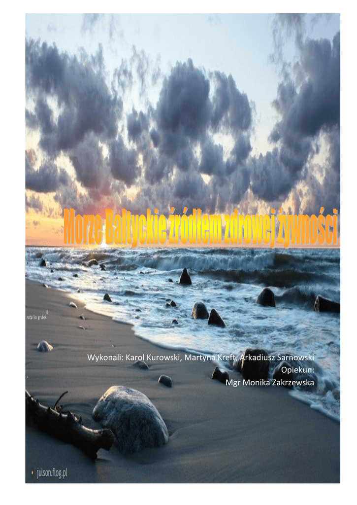 Wykonali: Karol Kurowski, Martyna Kreft, Arkadiusz Sarnowski Opiekun: Mgr Monika Zakrzewska Śledź Oceaniczny Gatunek ławicowej ryby morskiej z rodziny śledziowatych 1 Ma znaczenie gospodarcze stanowiąc główny cel połowów w rybołówstwie morskim. W wyniku przełowienia w latach 90. XX wieku liczebność poszczególnych populacji znacznie się zmniejszyła, jednak nadal śledzie są bardzo ważnymi rybami użytkowymi. Zasięg występowania Śledź atlantycki zasiedla wody strefy umiarkowanej i chłodnej północnego Atlantyku od Oceanu Arktycznego do kanału La Manche i Morza Bałtyckiego. Ryby te żyją w toni wodnej na głębokościach do 250 m. Przebywają w dużych grupach zwanych ławicami. W Morzu Bałtyckim występuje podgatunek śledzia atlantyckiego. 2 ŚLEDŹ- pora docenić smaczną i zdrową rybę Śledzie są źródłem kwasów nienasyconych Śledzie są bogatym źródłem pełnowartościowego i dobrze przyswajalnego białka. Zawierają sporo tłuszczu, bo aż 16 g w 100 g. To właśnie jest największa zaleta śledzi! Aż 70 procent. tego tłuszczu stanowią dobroczynne dla zdrowia kwasy tłuszczowe jedno- i wielonienasycone. Szczególnie cenny jest kwas EPA, który rozszerza naczynia krwionośne, redukuje zlepianie krwinek i tworzenie zakrzepów. Ponadto reguluje ciśnienie tętnicze krwi oraz obniża poziom cholesterolu, a przy tym zwiększa odporność. Śledzie zawierają witaminy i mikroelementy Śledzie są bogatym źródłem witamin A i D oraz E, która ma działanie przeciwmiażdżycowe. Jest w nich sporo witaminy B6 (100 g ryby pokrywa w 20 proc. dzienne zapotrzebowanie na B6) oraz witaminy B12 (jej zawartość w 100 g przewyższa dzienne zapotrzebowanie aż czterokrotnie). Śledzie dostarczają także dużo żelaza, cynku i miedzi oraz fosforu i jodu. Śledzie są wskazane dla osób cierpiących na choroby układu krążenia i niedokrwistość Pieczone na ruszcie albo w piekarniku (w folii aluminiowej lub w tzw. rękawie do pieczenia), duszone lub gotowane na parze są lekko strawne. Mogą być zatem wartościowym daniem dla dzieci, młodzieży i seniorów. Powinny je jadać osoby cierpiące na choroby układu krążenia i niedokrwistość. Śledzie, mimo że tłuste, nie są kaloryczne Śledzie zalicza się do tłustych ryb, nie znaczy to jednak, że są bardzo kaloryczne (100 g dostarcza tylko 160 kcal). Mają przy tym sporo potasu, który ułatwia usuwanie nadmiaru wody z organizmu. W dodatku zawarty w nich kwas omega-3 przyśpiesza przemianę materii i spalanie tłuszczu. Śledzie wpływają też na nastrój, zwiększając poziom serotoniny, działają przeciwdepresyjnie, wzmacniają pamięć i koncentrację. Dorsz Jest ogólnie znanym przedstawicielem bardzo bogatej w gatunki rodziny dorszowatych. Występuje głównie w Bałtyku, w Północnym Atlantyku i w Morzu Północnym. Dorsz jest najchętniej spożywaną rybą w Polsce, ale i w Europie należy do najczęściej spożywanych ryb. Mięso dorsza jest białe i chude. 3 4 Dorsz zawiera dużo witaminy A, D i jodu. Szczególnie dużo witaminy A zawiera wątroba: ok 15.000 µg Z wątroby dorsza produkowany jest tran, którego odżywiają skórę, obniżają ciśnienie krwi i podwyższają odporność Połowy dorsza od 1960-2000 roku 5 Flądra Zasięg występowania to Europejskie wybrzeża Oceanu Atlantyckiego, Morze Śródziemne, Bałtyckie (do środkowej części Zatoki Botnickiej), Czarne i Białe.Introdukowana przypadkowo (prawdopodobnie zawleczona w wodach balastowych statków) na terenie Stanów Zjednoczonych i Kanady. Żyje na głębokościach do 100 m. Wpływa do wód słonawych. Często wędruje w górę rzek. 6 7 Stornia jest bardzo smaczną rybą o białym, średnio tłustym mięsie. Zawartość kwasów tłuszczowych omega-3 w 100g flądry to koło 0,5 gram. Mięśnie flądry zawierają średnio 50-85% wody, 10-25% białka, 0,2-54% tłuszczu, 0,5-5,6% soli mineralnych – głównie fosforu, siarki, chloru, potasu, sodu, magnezu, niewielkie ilości 0,1-0,4% węglowodanów, witaminy z grupy B oraz witaminy A, D i E. Ich białko charakteryzuje się wysoką strawnością 93-97%, porównywalną ze strawnością białka mleka 95% i wyższą od strawności mięsa wołowego 88%. Szczególnie istotny ze zdrowotnego punktu widzenia jest zawarty we flądrze tłuszcz. Cechuje go wysoka przyswajalność oraz obecność wielonienasyconych kwasów tłuszczowych, w tym z rodziny posiadających cenne właściwości dietetyczne. Kwasy obniżają poziom lipidów w osoczu krwi, normalizują ciśnienie krwi, polepszają pracę serca, zmniejszają skłonność do zakrzepów. Wyniki badań potwierdzają także ich wpływ na hamowanie procesów nowotworowych, osłabianie reakcji alergicznych oraz na funkcjonowanie układu nerwowego. Z obecnością tłuszczu związana jest zawartość witamin rozpuszczalnych w tłuszczach A, D, E. Kaloryczność mięsa waha to około 100 kcal/100g. Dzięki temu potrawy z flądry nie należą do tuczących. Delikatna struktura mięsa ryb ułatwia jego obróbkę kulinarną, łatwo przenika przez nie sól, kwasy organiczne, dym wędzarniczy, dodatki smakowo – zapachowe, a pod wpływem podwyższonej temperatury mięso to szybko mięknie, dlatego wymaga krótkiego pieczenia, gotowania czy smażenia. Halibut gatunek morskiej ryby z rodziny flądrowatych. Jest największym przedstawicielem tej rodziny. 8 Występuje w Północnej część Atlantyku w rejonie około arktycznym od wybrzeży Kanady i Grenlandii na północy, poprzez strefę północnego obszaru Morza Północnego po Morze Białe, oraz do północnych obszarów Zatoki Biskajskiej. Sporadycznie spotykany w rejonie Morza Bałtyckiego. Halibut bogaty w kwasy omega-3 Mimo że kulbak (potoczna nazwa halibuta) jest bardzo tłusty to ma prawie o połowę mniej kalorii niż tradycyjny schabowy. Halibut jest przede wszystkim bogatym źródłem białka i witaminy A(29 ug/100g, zapotrzebowanie na nią to 800 ug), niezbędnej do właściwej