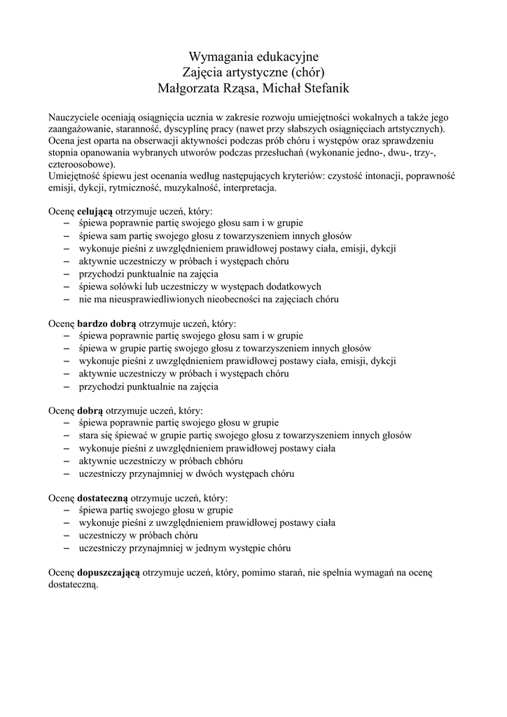Wymagania edukacyjne Zajęcia artystyczne (chór) Małgorzata Rząsa, Michał Stefanik Nauczyciele oceniają osiągnięcia ucznia w zakresie rozwoju umiejętności wokalnych a także jego zaangażowanie, staranność, dyscyplinę pracy (nawet przy słabszych osiągnięciach artstycznych). Ocena jest oparta na obserwacji aktywności podczas prób chóru i występów oraz sprawdzeniu stopnia opanowania wybranych utworów podczas przesłuchań (wykonanie jedno-, dwu-, trzy-, czteroosobowe). Umiejętność śpiewu jest ocenania według następujących kryteriów: czystość intonacji, poprawność emisji, dykcji, rytmiczność, muzykalność, interpretacja. Ocenę celującą otrzymuje uczeń, który: – śpiewa poprawnie partię swojego głosu sam i w grupie – śpiewa sam partię swojego głosu z towarzyszeniem innych głosów – wykonuje pieśni z uwzględnieniem prawidłowej postawy ciała, emisji, dykcji – aktywnie uczestniczy w próbach i występach chóru – przychodzi punktualnie na zajęcia – śpiewa solówki lub uczestniczy w występach dodatkowych – nie ma nieusprawiedliwionych nieobecności na zajęciach chóru Ocenę bardzo dobrą otrzymuje uczeń, który: – śpiewa poprawnie partię swojego głosu sam i w grupie – śpiewa w grupie partię swojego głosu z towarzyszeniem innych głosów – wykonuje pieśni z uwzględnieniem prawidłowej postawy ciała, emisji, dykcji – aktywnie uczestniczy w próbach i występach chóru – przychodzi punktualnie na zajęcia Ocenę dobrą otrzymuje uczeń, który: – śpiewa poprawnie partię swojego głosu w grupie – stara się śpiewać w grupie partię swojego głosu z towarzyszeniem innych głosów – wykonuje pieśni z uwzględnieniem prawidłowej postawy ciała – aktywnie uczestniczy w próbach cbhóru – uczestniczy przynajmniej w dwóch występach chóru Ocenę dostateczną otrzymuje uczeń, który: – śpiewa partię swojego głosu w grupie – wykonuje pieśni z uwzględnieniem prawidłowej postawy ciała – uczestniczy w próbach chóru – uczestniczy przynajmniej w jednym występie chóru Ocenę dopuszczającą otrzymuje uczeń, który, pomimo starań, nie spełnia wymagań na ocenę dostateczną. Sposoby sprawdzania osiągnięć edukacyjnych uczniów Na ocenę semestralną i roczną składają się następujące oceny cząstkowe: 1) za obecność i zaangażowanie na próbach – waga 2 2) za obecność i zaangażowanie na występach – waga 2 3) za śpiew (przynajmniej jedna ocena w semestrze) 4) za solówki na występach Oceny 1, 2 będą wystawiane pod koniec semestru. Oceny 3, 4 – na bieżąco Obecność na próbach: 1. Zajęcia artystyczne są zajęciami obowiązkowymi – nieobecności na tych zajęciach mają być usprawiedliwiane. Wszyscy są obowiązkowo na pierwszej godzinie zajęć we wtorek i w piątek. Ponadto każdy chórzysta jest przydzielony do głosu (sopran, alt, tenor, bas). Na drugiej godzinie we wtorki zostają głosy męskie (tenor/bas), a na drugiej godzinie w piątek głosy żeńskie (sopran/alt). W zależności od realizowanego repertuaru będą zostawać obydwa głosy albo tylko jeden. W wyjątkowych sytuacjach (np. ważny występ) na drugą godzinę będą zostawać wszyscy. Jeśli dany głos nie zostaje na drugiej godzinie próby, w dzienniku elektronicznym pojawia się zapis „zwolniony”. 2. W czasie prób chóru nie można uczestniczyć w kółkach, poprawiać lub zaliczać zaległych sprawdzianów, kartkówek. Należy informować o tym nauczycieli innych przedmiotów. 3. Sposób usprawiedliwiania nieobecności: - Jeśli kogoś nie ma w szkole przez cały dzień (albo przynajmniej na lekcji poprzedzającej chór), to wystarczy usprawiedliwienie nieobecności u wychowawcy - Jeśli ktoś w danym dniu zwalnia się tylko z zajęć chóru, to powinien pokazać pokazać zwolnienie W TYM SAMYM DNIU - tzn. jeszcze przed próbą . W przeciwnym przypadku przyjmujemy, że nieobecność na chórze jest nieusprawiedliwiona. 4. Nieobecności nieusprawiedliwione obniżają ocenę za obecność i zaangażowanie na próbach. Obecność na występach: 1. Obecność na występach jest obowiązkowa (będzie sprawdzana) 2. Ewentualne nieobecności należy usprawiedliwić (usprawiedliwienia w indeksie, z podaniem powodu nieobcności). 3. Jeśli liczba osób na występie będzie ograniczona (tzn. nie każdy zostanie dopuszczony do wystpu), taki występ będzie traktowany jako dodatkowy (może podwyższyć ocenę za występy). Zaangażowanie na próbach i występach - bierzemy pod uwagę: – punktualność – zdyscyplinowanie – dbanie o porządek w sali (wypełnianie dyżurów, ustawianie sali przed i po zajęciach) – aktywny udział w śpiewie – wykonywanie poleceń nauczycieli Śpiew: oceniany w czasie prób w głosach lub przesłuchań indywidualnych lub w mniejszych grupach – według wymagań edukacyjnych na poszczególne oceny.