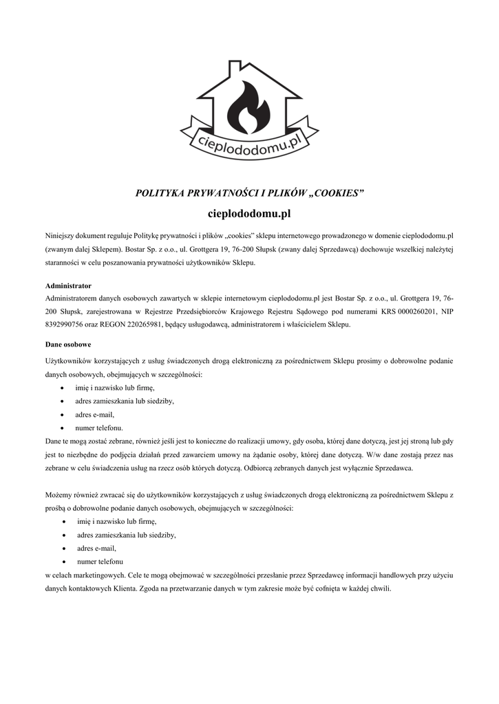 POLITYKA PRYWATNOŚCI I PLIKÓW „COOKIES” cieplododomu.pl Niniejszy dokument reguluje Politykę prywatności i plików „cookies” sklepu internetowego prowadzonego w domenie cieplododomu.pl (zwanym dalej Sklepem). Bostar Sp. z o.o., ul. Grottgera 19, 76-200 Słupsk (zwany dalej Sprzedawcą) dochowuje wszelkiej należytej staranności w celu poszanowania prywatności użytkowników Sklepu. Administrator Administratorem danych osobowych zawartych w sklepie internetowym cieplododomu.pl jest Bostar Sp. z o.o., ul. Grottgera 19, 76200 Słupsk, zarejestrowana w Rejestrze Przedsiębiorców Krajowego Rejestru Sądowego pod numerami KRS 0000260201, NIP 8392990756 oraz REGON 220265981, będący usługodawcą, administratorem i właścicielem Sklepu. Dane osobowe Użytkowników korzystających z usług świadczonych drogą elektroniczną za pośrednictwem Sklepu prosimy o dobrowolne podanie danych osobowych, obejmujących w szczególności: imię i nazwisko lub firmę, adres zamieszkania lub siedziby, adres e-mail, numer telefonu. Dane te mogą zostać zebrane, również jeśli jest to konieczne do realizacji umowy, gdy osoba, której dane dotyczą, jest jej stroną lub gdy jest to niezbędne do podjęcia działań przed zawarciem umowy na żądanie osoby, której dane dotyczą. W/w dane zostają przez nas zebrane w celu świadczenia usług na rzecz osób których dotyczą. Odbiorcą zebranych danych jest wyłącznie Sprzedawca. Możemy również zwracać się do użytkowników korzystających z usług świadczonych drogą elektroniczną za pośrednictwem Sklepu z prośbą o dobrowolne podanie danych osobowych, obejmujących w szczególności: imię i nazwisko lub firmę, adres zamieszkania lub siedziby, adres e-mail, numer telefonu w celach marketingowych. Cele te mogą obejmować w szczególności przesłanie przez Sprzedawcę informacji handlowych przy użyciu danych kontaktowych Klienta. Zgoda na przetwarzanie danych w tym zakresie może być cofnięta w każdej chwili. Administrator danych dochowuje szczególnej i należytej staranności w celu ochrony praw użytkowników, których dane podlegają przetwarzaniu, a w szczególności zapewnia, aby dane te były: przetwarzane zgodnie z prawem, zbierane dla oznaczonych w niniejszym dokumencie i zgodnych z prawem celów, nie poddawane dalszemu przetwarzaniu niezgodnemu z powyższymi celami, merytorycznie poprawne i adekwatne w stosunku do celów, w jakich są przetwarzane, przechowywane w postaci umożliwiającej identyfikację osób, których dotyczą, nie dłużej niż jest to niezbędne do osiągnięcia celu przetwarzania. Użytkownikom przysługuje prawo kontroli przetwarzania danych, które ich dotyczą, zawartych w zbiorach danych Sprzedawcy. Jest to zwłaszcza prawo do dostępu do treści swoich danych oraz ich poprawiania, a także żądania uzupełnienia, uaktualnienia, sprostowania danych osobowych, czasowego lub stałego wstrzymania ich przetwarzania lub ich usunięcia, jeżeli są one niekompletne, nieaktualne, nieprawdziwe lub zostały zebrane z naruszeniem ustawy albo są już zbędne do realizacji celu, dla którego zostały zebrane. Administrator danych osobowych zastrzega, iż zgodnie z przepisami ustawy o ochronie danych osobowych, może powierzyć przetwarzanie danych osobowych Użytkowników, których danymi administruje, innym firmom w celu prawidłowego wykonania przez te firmy czynności związanych z hostingiem, administracją, utrzymywaniem oraz zarządzaniem Sklepem, a także z dochodzeniem roszczeń oraz wyjaśnieniem okoliczności niedozwolonego korzystania z usług świadczonych drogą elektroniczną. Dzienniki systemowe To wewnętrzne dzienniki zdarzeń serwera Sklepu, automatycznie zapisujące żądania stron wysyłane, gdy użytkownicy odwiedzają jego witryny. Dzienniki systemowe zawierają żądanie strony wysłane przez użytkownika, adres IP, typ przeglądarki, język przeglądarki, datę i godzinę żądania oraz co najmniej jeden plik „cookie”, który może jednoznacznie identyfikować przeglądarkę użytkownika. Plik „cookie” Jest niewielkim plikiem zawierającym ciąg znaków, który jest wysyłany do komputera użytkownika podczas odwiedzania przez niego Sklepu. Gdy użytkownik odwiedza Sklep ponownie, dzięki plikowi „cookie” przeglądarka użytkownika może zostać rozpoznana przez Sklep. W ustawieniach przeglądarki można wybrać opcję odrzucania plików „cookie” lub sygnalizowania, że taki plik został przesłany. Użytkownik Sklepu może wyrazić zgodę na korzystanie z plików „cookie”. Bez nich, niektóre funkcje lub usługi Sklepi mogą jednak nie działać poprawnie. Gromadzenie danych Dane gromadzone w dziennikach systemowych są wykorzystywane przez Sprzedawcę przez czas nieokreślony wyłącznie w celu administrowania Sklepem. Nie są one przekazywane na rzecz podmiotów trzecich, z wyłączeniem okoliczności opisanych w niniejszym dokumencie. W związku z korzystaniem ze Sklepu przez użytkowników, w sposób automatyczny możemy zbierać i zapisywać w dziennikach serwerów szczegóły techniczne dotyczące sposobu korzystania z usług, przesłane przez użytkownika żądania związane ze świadczeniem usług drogą elektroniczną, adres IP oraz dane techniczne o działaniu Sklepu w związku z czynnościami dokonywanymi przez użytkownika, w szczególności informacje o rozpoczęciu, zakończeniu oraz zakresie każdorazowego korzystania z usługi świadczonej drogą elektroniczną. Możemy również zbierać informacje, celem przechowywania ich lokalnie na urządzeniu użytkownika, korzystając z mechanizmu pamięci przeglądarki. W trakcie świadczenia usług na rzecz użytkowników, stosujemy profesjonalne technologie do gromadzenia i zapisywania informacji, takie jak pliki „cookie”. Dostęp do danych „cookie” może posiadać również firma Google za pośrednictwem narzędzi Google Analytics oraz Google Adwords, w celu sporządzenia statystyk ruchu or