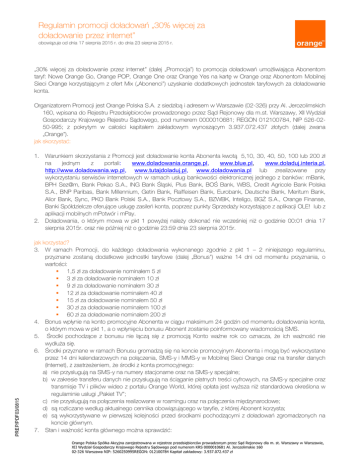 Regulamin promocji doładowań „30% więcej za doładowanie przez internet” obowiązuje od dnia 17 sierpnia 2015 r. do dnia 23 sierpnia 2015 r. „30% więcej za doładowanie przez internet” (dalej „Promocja”) to promocja doładowań umożliwiająca Abonentom taryf: Nowe Orange Go, Orange POP, Orange One oraz Orange Yes na kartę w Orange oraz Abonentom Mobilnej Sieci Orange korzystającym z ofert Mix („Abonenci”) uzyskanie dodatkowych jednostek taryfowych za doładowanie konta. Organizatorem Promocji jest Orange Polska S.A. z siedzibą i adresem w Warszawie (02-326) przy Al. Jerozolimskich 160, wpisana do Rejestru Przedsiębiorców prowadzonego przez Sąd Rejonowy dla m.st. Warszawy, XII Wydział Gospodarczy Krajowego Rejestru Sądowego, pod numerem 0000010681; REGON 012100784, NIP 526-0250-995; z pokrytym w całości kapitałem zakładowym wynoszącym 3.937.072.437 złotych (dalej zwana „Orange”). jak skorzystać: PREP/PDF03/0815 1. Warunkiem skorzystania z Promocji jest doładowanie konta Abonenta kwotą 5,10, 30, 40, 50, 100 lub 200 zł na jednym z portali: www.doladowania.orange.pl, www.blue.pl, www.doladuj.interia.pl, http://www.doladowania.wp.pl, www.tutajdoladuj.pl, www.doladowania.pl lub zrealizowane przy wykorzystaniu serwisów internetowych w ramach usług bankowości elektronicznej jednego z banków: mBank, BPH Sez@m, Bank Pekao S.A., ING Bank Śląski, Plus Bank, BOŚ Bank, WBS, Credit Agricole Bank Polska S.A., BNP Paribas, Bank Millennium, Getin Bank, Raiffeisen Bank, Eurobank, Deutsche Bank, Meritum Bank, Alior Bank, Sync, PKO Bank Polski S.A., Bank Pocztowy S.A., BZWBK, Inteligo, BGŻ S.A., Orange Finanse, Banki Spółdzielcze oferujące usługę zasileń konta, poprzez punkty Sprzedaży korzystające z aplikacji OLE! lub z aplikacji mobilnych mPotwór i mPay. 2. Doładowania, o którym mowa w pkt 1 powyżej należy dokonać nie wcześniej niż o godzinie 00:01 dnia 17 sierpnia 2015r. oraz nie później niż o godzinie 23:59 dnia 23 sierpnia 2015r. jak korzystać? 3. W ramach Promocji, do każdego doładowania wykonanego zgodnie z pkt 1 – 2 niniejszego regulaminu, przyznane zostaną dodatkowe jednostki taryfowe (dalej „Bonus”) ważne 14 dni od momentu przyznania, o wartości: 1,5 zł za doładowanie nominałem 5 zł 3 zł za doładowanie nominałem 10 zł 9 zł za doładowanie nominałem 30 zł 12 zł za doładowanie nominałem 40 zł 15 zł za doładowanie nominałem 50 zł 30 zł za doładowanie nominałem 100 zł 60 zł za doładowanie nominałem 200 zł 4. Bonus wpłynie na konto promocyjne Abonenta w ciągu maksimum 24 godzin od momentu doładowania konta, o którym mowa w pkt 1, a o wpłynięciu bonusu Abonent zostanie poinformowany wiadomością SMS. 5. Środki pochodzące z bonusu nie łączą się z promocją Konto ważne rok co oznacza, że ich ważność nie wydłuża się. 6. Środki przyznane w ramach Bonusu gromadzą się na koncie promocyjnym Abonenta i mogą być wykorzystane przez 14 dni kalendarzowych na połączenia, SMS-y i MMS-y w Mobilnej Sieci Orange oraz na transfer danych (Internet), z zastrzeżeniem, że środki z konta promocyjnego: a) nie przysługują na SMS-y na numery stacjonarne oraz na SMS-y specjalne; b) w zakresie transferu danych nie przysługują na ściąganie płatnych treści cyfrowych, na SMS-y specjalne oraz transmisje TV i plików wideo z portalu Orange World, której opłata jest wyższa niż standardowa określona w regulaminie usługi „Pakiet TV”; c) nie przysługują na połączenia realizowane w roamingu oraz na połączenia międzynarodowe; d) są rozliczane według aktualnego cennika obowiązującego w taryfie, z której Abonent korzysta; e) są wykorzystywane w pierwszej kolejności przed środkami pochodzącymi z doładowań zgromadzonych na koncie głównym. 7. Stan i ważność konta głównego można sprawdzić: Orange Polska Spółka Akcyjna zarejestrowana w rejestrze przedsiębiorców prowadzonym przez Sąd Rejonowy dla m. st. Warszawy w Warszawie, XII Wydział Gospodarczy Krajowego Rejestru Sądowego pod numerem KRS 0000010681 Al. Jerozolimskie 160 02-326 Warszawa NIP: 5260250995REGON: 012100784 Kapitał zakładowy: 3.937.072.437 zł - dzwoniąc pod numer *500 , - logując się na www.orange.pl - poprzez krótki kod *124*# [zadzwoń] ile to kosztuje: 8. Bonus w ramach Promocji przyznawany jest bezpłatnie. PREP/PDF03/0815 dodatkowe informacje: 9. Promocja łączy się z innymi ofertami i usługami promocyjnymi dostępnymi w ofercie Abonenta, chyba że warunki danej taryfy lub usługi stanowią inaczej. 10. Promocja nie łączy się z promocją „10% więcej za doładowanie przez stronę www.doladowania.orange.pl” 11. Niniejszy Regulamin jest dostępny na stronie internetowej www.orange.pl, w siedzibie Orange Polska S.A. 12. W pozostałym zakresie stosuje się Regulamin świadczenia usług telekomunikacyjnych dla abonentów ofert na kartę w Mobilnej sieci Orange regulaminy oraz cennik obowiązujące w ofercie, z której abonent korzysta. 13. Mobilna sieć Orange - sieć telekomunikacyjna, której operatorem jest Orange Polska S.A. Orange Polska Spółka Akcyjna zarejestrowana w rejestrze przedsiębiorców prowadzonym przez Sąd Rejonowy dla m. st. Warszawy w Warszawie, XII Wydział Gospodarczy Krajowego Rejestru Sądowego pod numerem KRS 0000010681 Al. Jerozolimskie 160 02-326 Warszawa NIP: 5260250995REGON: 012100784 Kapitał zakładowy: 3.937.072.437 zł