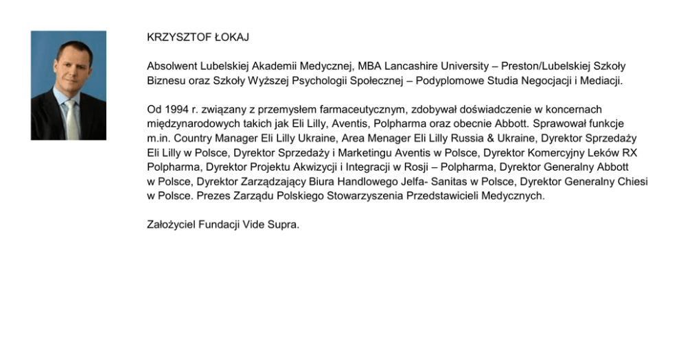 KRZYSZTOF ŁOKAJ Absolwent Lubelskiej Akademii Medycznej, MBA Lancashire University – Preston/Lubelskiej Szkoły Biznesu oraz Szkoły Wyższej Psychologii Społecznej – Podyplomowe Studia Negocjacji i Mediacji. Od 1994 r. związany z przemysłem farmaceutycznym, zdobywał doświadczenie w koncernach międzynarodowych takich jak Eli Lilly, Aventis, Polpharma oraz obecnie Abbott. Sprawował funkcje m.in. Country Manager Eli Lilly Ukraine, Area Menager Eli Lilly Russia & Ukraine, Dyrektor Sprzedaży Eli Lilly w Polsce, Dyrektor Sprzedaży i Marketingu Aventis w Polsce, Dyrektor Komercyjny Leków RX Polpharma, Dyrektor Projektu Akwizycji i Integracji w Rosji – Polpharma, Dyrektor Generalny Abbott w Polsce, Dyrektor Zarządzający Biura Handlowego Jelfa- Sanitas w Polsce, Dyrektor Generalny Chiesi w Polsce. Prezes Zarządu Polskiego Stowarzyszenia Przedstawicieli Medycznych. Założyciel Fundacji Vide Supra.
