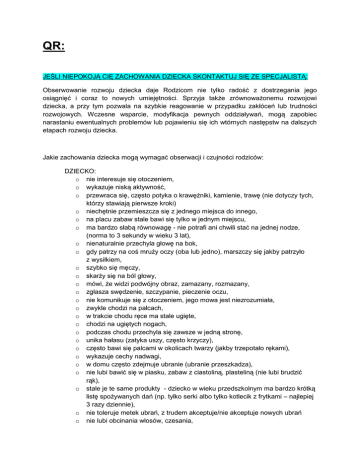 QR: JEŚLI NIEPOKOJĄ CIĘ ZACHOWANIA DZIECKA SKONTAKTUJ SIĘ ZE SPECJALISTĄ: Obserwowanie rozwoju dziecka daje Rodzicom nie tylko radość z dostrzegania jego osiągnięć i coraz to nowych umiejętności. Sprzyja także zrównoważonemu rozwojowi dziecka, a przy tym pozwala na szybkie reagowanie w przypadku zakłóceń lub trudności rozwojowych. Wczesne wsparcie, modyfikacja pewnych oddziaływań, mogą zapobiec narastaniu ewentualnych problemów lub pojawieniu się ich wtórnych następstw na dalszych etapach rozwoju dziecka. Jakie zachowania dziecka mogą wymagać obserwacji i czujności rodziców: DZIECKO: o nie interesuje się otoczeniem, o wykazuje niską aktywność, o przewraca się, często potyka o krawężniki, kamienie, trawę (nie dotyczy tych, którzy stawiają pierwsze kroki) o niechętnie przemieszcza się z jednego miejsca do innego, o na placu zabaw stale bawi się tylko w jednym miejscu, o ma bardzo słabą równowagę - nie potrafi ani chwili stać na jednej nodze, (norma to 3 sekundy w wieku 3 lat), o nienaturalnie przechyla głowę na bok, o gdy patrzy na coś mruży oczy (oba lub jedno), marszczy się jakby patrzyło z wysiłkiem, o szybko się męczy, o skarży się na ból głowy, o mówi, że widzi podwójny obraz, zamazany, rozmazany, o zgłasza swędzenie, szczypanie, pieczenie oczu, o nie komunikuje się z otoczeniem, jego mowa jest niezrozumiała, o zwykle chodzi na palcach, o w trakcie chodu ręce ma stale ugięte, o chodzi na ugiętych nogach, o podczas chodu przechyla się zawsze w jedną stronę, o unika hałasu (zatyka uszy, często krzyczy), o często bawi się palcami w okolicach twarzy (jakby trzepotało rękami), o wykazuje cechy nadwagi, o w domu często zdejmuje ubranie (ubranie przeszkadza), o nie lubi bawić się w piasku, zabaw z ciastoliną, plasteliną (nie lubi brudzić rąk), o stale je te same produkty - dziecko w wieku przedszkolnym ma bardzo krótką listę spożywanych dań (np. tylko serki albo tylko kotlecik z frytkami – najlepiej 3 razy dziennie), o nie toleruje metek ubrań, z trudem akceptuje/nie akceptuje nowych ubrań o nie lubi obcinania włosów, czesania, o o o o o o o o o o o o o nie reaguje na ból, samo się okalecza (gryzie, szczypie, uderza głową w twarde przedmioty), łatwo się dławi, intensywnie wącha ręce, ubrania, przedmioty, przez dłuższy czas ma problemy ze snem, lubi zawijać się w koce, chować pod kołdry, nie lubi supermarketów i miejsc publicznych, przykłada ucho do wibrujących powierzchni, lubi przysłuchiwać się włączonym maszynom (pralka, zmywarka, odkurzacz), stuka się po głowie, po uszach, ssie własny język, policzki, patrzy bokiem (peryferycznie), mocno zamyka oczy (uciska gałki oczne), LATARENKA Drodzy Opiekunowie, nie diagnozujcie zaburzeń, nie róbcie nadinterpretacji, nie nazywajcie trudności na podstawie zestawu przypadkowych opisów, zawartych powyżej. One są tylko małą latarnią, która ma oświetlić drogę – lepiej poznać potrzeby dziecka, pozwolić widzieć pewne rzeczy, dowiedzieć się, zrozumieć, może szukać dalej. Do potwierdzenia lub zaprzeczenia diagnozy zazwyczaj potrzebny jest specjalista. Bądźcie Rodzicami, którzy z wrażliwością troszcząc się o dziecko, zauważą pewne sygnały we właściwym czasie, w momencie optymalnym dla prawidłowego rozwoju swojego dziecka. Pamiętaj! Powyższa lista nie musi oznaczać kłopotów. Nie wszystkie z wymienionych objawów jednoznacznie wskazują na potencjalne problemy rozwojowe. Dziecko, które pociera oczy może mieć wadę wzroku albo zapalenie spojówek, dziecko może być śpiące lub mieć ciało obce w oku. Zachowanie dwojga dzieci w podobny sposób, czy nawet identyczna reakcja w określonej sytuacji, mogą być spowodowane innym zjawiskiem, odmiennym bodźcem. KAŻDE DZIECKO JEST INNE OD POZOSTAŁYCH, MA SWÓJ TEMPERAMENT, INDYWIDUALNE CECHY OSOBOWOŚCIOWE. Jedne z nich szybciej zaczynają chodzić, wspinać się, biegać czy jeździć na rowerze, inne nieco później. Niektóre dzieci są śmiałe, rezolutne, jakby niczego się nie bały, inne - onieśmielone najprostszą sytuacją - najchętniej schowałyby się z tyłu za rodzicem albo nie chcą puścić ręki babci czy dziadka. Tak jak wśród dorosłych - dzieci bywają różne. Ważne! W ocenie rozwoju dziecka pomocne mogą być wskazówki lekarza podczas planowych wizyt profilaktycznych. Gdy coś Cię niepokoi w zachowaniu Twojego dziecka, opowiedz o tym podczas wizyty w przychodni. Pamiętaj o bilansie 2-, 4-, 6-, 10-, 14- i 18-latka. Zakres i rodzaj badania zależy od wieku dziecka. U młodszych pacjentów lekarz zawsze ocenia, jak przebiega rozwój fizyczny i psychoruchowy. Dane (wzrost, waga) nanosi na siatkę centylową w książeczce zdrowia. Ocenia wzrok, postawę ciała i uzębienie. To dobry czas, aby opowiedzieć o swoich obawach i zapytać o radę. Jeśli jednak widzisz coś w zachowaniu, reakcjach dziecka, co warto skonsultować ze specjalistą, a nie jest termin na bilans, nie czekaj, umów się na wizytę. Wybierz przychodnię zdrowia (najprościej rejonową, w której dziecko ma lekarza pierwszego kontaktu, gdzie po wstępnej konsultacji, w razie potrzeby, mały pacjent może dostać skierowanie do specjalisty). Poniżej użyteczne dane kontaktowe z przychodniami zdrowia i poradnią psychologiczno – pedagogiczną na Targówku: Dane teleadresowe Przychodni Zdrowia na Targówku telefon do rejestracji do placówek: (22) 518 26 66 Balkonowa 4 Łojewska 6 Poborzańska 6 Lekarze specjaliści dla dzieci (22) 518 26 66: http://www.zoztargowek.waw.pl/index.php?go=specjalistyka_dz Rembielińska 8 Rehabilitacja dla dzieci, ul. Balkonowa: (22) 74 40 053 http://www.zoztargowek.waw.pl/index.php?go=rehabilitacja_dz Remiszewska 14 Tykocińska 34 Ważne! W każdym czasie Rodzice mogą się również zgłosić do Poradni PsychologicznoPedagogicznej i skorzystać z pomocy specjalistów albo też nauczyciela, pedagoga, psychologa w placówce 