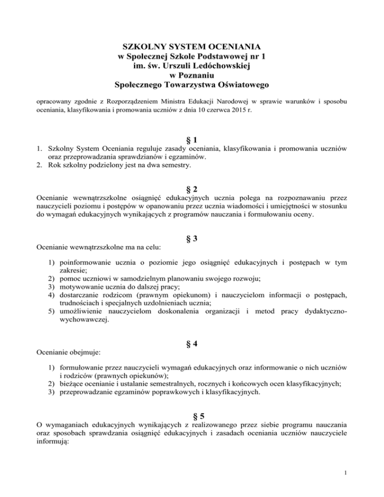 SZKOLNY SYSTEM OCENIANIA w Społecznej Szkole Podstawowej nr 1 im. św. Urszuli Ledóchowskiej w Poznaniu Społecznego Towarzystwa Oświatowego opracowany zgodnie z Rozporządzeniem Ministra Edukacji Narodowej w sprawie warunków i sposobu oceniania, klasyfikowania i promowania uczniów z dnia 10 czerwca 2015 r. §1 1. Szkolny System Oceniania reguluje zasady oceniania, klasyfikowania i promowania uczniów oraz przeprowadzania sprawdzianów i egzaminów. 2. Rok szkolny podzielony jest na dwa semestry. §2 Ocenianie wewnątrzszkolne osiągnięć edukacyjnych ucznia polega na rozpoznawaniu przez nauczycieli poziomu i postępów w opanowaniu przez ucznia wiadomości i umiejętności w stosunku do wymagań edukacyjnych wynikających z programów nauczania i formułowaniu oceny. §3 Ocenianie wewnątrzszkolne ma na celu: 1) poinformowanie ucznia o poziomie jego osiągnięć edukacyjnych i postępach w tym zakresie; 2) pomoc uczniowi w samodzielnym planowaniu swojego rozwoju; 3) motywowanie ucznia do dalszej pracy; 4) dostarczanie rodzicom (prawnym opiekunom) i nauczycielom informacji o postępach, trudnościach i specjalnych uzdolnieniach ucznia; 5) umożliwienie nauczycielom doskonalenia organizacji i metod pracy dydaktycznowychowawczej. §4 Ocenianie obejmuje: 1) formułowanie przez nauczycieli wymagań edukacyjnych oraz informowanie o nich uczniów i rodziców (prawnych opiekunów); 2) bieżące ocenianie i ustalanie semestralnych, rocznych i końcowych ocen klasyfikacyjnych; 3) przeprowadzanie egzaminów poprawkowych i klasyfikacyjnych. §5 O wymaganiach edukacyjnych wynikających z realizowanego przez siebie programu nauczania oraz sposobach sprawdzania osiągnięć edukacyjnych i zasadach oceniania uczniów nauczyciele informują: 1 a) uczniów na pierwszej lekcji każdego roku szkolnego; wymagania edukacyjne wraz z planem dydaktyczno-wynikowym znajdują się u Dyrektora Szkoły; informację o sposobach sprawdzania osiągnięć edukacyjnych i zasady oceniania w zakresie każdego przedmiotu uczeń wkleja do zeszytu przedmiotowego lub do dzienniczka; b) rodziców (prawnych opiekunów) na pierwszym klasowym zebraniu rodziców danego roku szkolnego, dokumentując w dzienniku lekcyjnym; rodzice potwierdzają przyjęcie do wiadomości regulaminów własnym podpisem w zeszytach przedmiotowych lub w dzienniczku dziecka. §6 1. Oceny są jawne zarówno dla ucznia jak i jego rodziców (prawnych opiekunów). 2. Na prośbę ucznia lub rodziców (prawnych opiekunów) nauczyciel ustalający ocenę powinien ją uzasadnić. §7 1. Uczniowie o szczególnych uzdolnieniach mogą ubiegać się o indywidualny program nauczania lub indywidualny tok nauki. Postępowanie w tej sprawie reguluje odrębny regulamin, zatwierdzany przez Radę Pedagogiczną. 2. Nauczyciel jest zobowiązany na podstawie pisemnej opinii poradni psychologicznopedagogicznej obniżyć wymagania edukacyjne w stosunku do ucznia, u którego stwierdzono specyficzne trudności w uczeniu się lub deficyty rozwojowe uniemożliwiające sprostanie wymaganiom edukacyjnym wynikającym z programu nauczania. 3. Dla ucznia realizującego indywidualny tok nauczania wymagania edukacyjne ustala się indywidualnie w porozumieniu z pedagogiem i psychologiem szkolnym. §8 1. 2. W klasach 1-3 oceny bieżące, semestralne i roczne oceny klasyfikacyjne z zajęć edukacyjnych, z wyłączeniem religii, są ocenami opisowymi. Ocenę opisową reguluje załącznik dla pierwszego etapu edukacyjnego. §9 Badanie osiągnięć edukacyjnych ucznia może przebiegać m.in. w następujących formach: a) praca klasowa (sprawdzian) – zapowiedziana z tygodniowym wyprzedzeniem i wpisana do terminarza dziennika elektronicznego pisemna forma sprawdzenia wiedzy i umiejętności, obejmująca znaczną partię materiału (dział, cykl); czas trwania do 90 minut; b) kartkówka – jest pisemną formą odpowiedzi, obejmuje niewielką partię materiału; c) odpowiedź – wypowiedzi powstałe na lekcji (pisemne, ustne). Nauczyciele mogą stosować również inne formy badania osiągnięć uczniów. § 10 1. Oceny cząstkowe, począwszy od klasy 4, wystawia się w stopniach, według następującej skali: a) stopień celujący – 6; b) stopień celujący minus – 5,75; c) stopień bardzo dobry plus – 5,5; d) stopień bardzo dobry – 5; 2 e) stopień bardzo dobry minus – 4,75; f) stopień dobry plus – 4,5; g) stopień dobry – 4; h) stopień dobry minus – 3,75; i) stopień dostateczny plus – 3,5; j) stopień dostateczny – 3; k) stopień dostateczny minus – 2,75; l) stopień dopuszczający plus – 2,5; m) stopień dopuszczający – 2; n) stopień dopuszczający minus – 1,75; o) stopień niedostateczny plus – 1,5; p) stopień niedostateczny – 1. Ocenami pozytywnymi są oceny ustalone w stopniach, o których mowa w punktach a-n. Ocenami negatywnymi są oceny ustalone w stopniach, o których mowa w punktach o-p. 2. Oceny prac klasowych (sprawdzianów) ustalane są na podstawie skali procentowej według następujących zasad: Stopień niedostateczny dopuszczający dostateczny dobry bardzo dobry celujący procenty – udział punktów 0% - 40% powyżej 40% - 55% powyżej 55% - 70% powyżej 70% - 85% powyżej 85% i mniej niż100% 100% O progach procentowych będących podstawą zróżnicowania stopni znakami „+” „–” decyduje każdorazowo nauczyciel. 3. Klasyfikowanie semestralne i roczne polega na podsumowaniu osiągnięć edukacyjnych ucznia z zajęć edukacyjnych określonych w szkolnym planie nauczania i ustalaniu ocen klasyfikacyjnych, począwszy od klasy IV szkoły podstawowej, według skali: a) stopień celujący (6); b) stopień bardzo dobry (5); c) stopień dobry (4); d) stopień dostateczny (3); e) stopień dopuszczający (2); f) stopień niedostateczny (1). Ocena semestralna może być różnicowana znakiem „+” lub „–”. § 11 1. 2. Ocena zachowania nie ma wpływu na ocenę z przedmiotu i odwrotnie. Ocenę zachowania formułuje się na pod