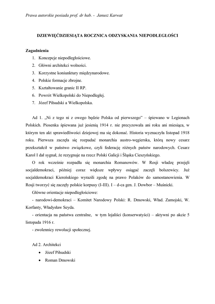 Prawa autorskie posiada prof. dr hab. - Janusz Karwat DZIEWIĘĆDZIESIĄTA ROCZNICA ODZYSKANIA NIEPODLEGŁOŚCI Zagadnienia 1. Koncepcje niepodległościowe. 2. Gł‚wni architekci wolności. 3. Korzystne koniunktury międzynarodowe. 4. Polskie formacje zbrojne. 5. Kształtowanie granic II RP. 6. Powr‚t Wielkopolski do Niepodległej. 7. J‚zef Piłsudski a Wielkopolska. Ad 1. „Ni z tego ni z owego będzie Polska od pierwszego” – śpiewano w Legionach Polskich. Piosenka śpiewana już jesienią 1914 r. nie precyzowała ani roku ani miesiąca, w kt‚rym ten akt sprawiedliwości dziejowej ma się dokonać. Historia wyznaczyła listopad 1918 roku. Pierwsza zaczęła się rozpadać monarchia austro-węgierska, kt‚rą nowy cesarz przekształcił w państwo związkowe, czyli federację r‚żnych państw narodowych. Cesarz Karol I dał sygnał, że rezygnuje na rzecz Polski Galicji i Śląska Cieszyńskiego. O rok wcześnie rozpadła się monarchia Romanow‚w. W Rosji władzę przejęli socjaldemokraci, p‚źniej coraz większe wpływy osiągać zaczęli bolszewicy. Już socjaldemokraci Kiereńskiego wyrazili zgodę na prawo Polak‚w do samostanowienia. W Rosji tworzyć się zaczęły polskie korpusy (I-III). I – d-ca gen. J. Dowbor – Muśnicki. Gł‚wne orientacje niepodległościowe: - narodowi-demokraci – Komitet Narodowy Polski: R. Dmowski, Wład. Zamojski, W. Korfanty, Władysław Seyda. - orientacja na państwa centralne, w tym lojaliści (konserwatyści) – aktywni po akcie 5 listopada 1916 r. - zwolennicy rewolucji społecznej. Ad 2. Architekci J€zef Piłsudski Roman Dmowski Prawa autorskie posiada prof. dr hab. - Janusz Karwat Ignacy Daszyński – szef socjalist€w w Galicji. To on zapewniał poparcie socjalist€w dla J. Piłsudskiego. Dzięki wpływom w Wiedniu przychylność dla sprawy polskiej. Wincenty Witos, Usamodzielnił ruch ludowy, zjednoczył go. Trzykrotny premier. Ignacy Paderewski – ogromny autorytet w świecie, od 2.01.1919 r. premier. Edward Rydz-Śmigły – doskonały żołnierz, trzymany przez Marszałka z dala od polityki. Szymon Aszkenazy – dał ducha niepodległościowego nowej generacji Polak‚w. Idea walki zbrojnej z Rosją. Rola Wilhelma Feldmana i Stanisława Wyspiańskiego. W listopadzie 1918 r. ucichły strzały na wszystkich frontach pierwszej wojny światowej. Klęskę poniosły trzy państwa zaborcze, co dla Polak€w oznaczało odrodzenie Rzeczypospolitej. Nastroje euforii zapanowały w Krakowie, Lublinie i Warszawie, ale nie w Poznaniu. Wielkopolanie przezywali zaw€d. Spodziewali się bowiem, że po klęsce Niemiec polskie ziemie zachodnie powr€cą w końcu do macierzy. Podpisany 11 listopada rozejm w Compiegne przewidywał powr€t do granic z 1 sierpnia 1914 r. Wielkopolska nadal pozostawała w nawiasie niemieckim. W sytuacji rewolucyjnego zamętu, jaki ogarnął Niemcy, Wielkopolanie nie załamywali jednak rąk. Powstała tr€jwładza: nadal pracowała administracja pruska, tworzyły się rady żołnierskie i robotnicze oraz polskie rady ludowe. Te ostatnie wyłoniły szybko własną reprezentację w postaci Naczelnej Rady Ludowej, jako najwyższy organ społeczeństwa polskiego. Polacy dysponowali własnym siłami paramilitarnymi: Strażą Ludową i oddziałami Straży Służby i Bezpieczeństwa, składającymi się gł€wnie z byłych żołnierzy frontowych. Ćwiczenia wojskowe podjęto także w gniazdach „Sokoła”. Działały organizacje niepodległościowe, min. od roku rozwijała się Polska Organizacja Wojskowa Zaboru Pruskiego pod kierownictwem Wincentego Wierzejewskiego i coraz liczniejsze boj€wki konspiracyjne. Brano pod uwagę wybuch powstania, obejmującego nawet wszystkie ziemie polskie zaboru pruskiego. W tym przypadku liczono głownie na pomoc udzieloną przez Armię Polską we Francji oraz wojska Ententy. Przodował w tych przygotowaniach Poznań. Przed wybuchem powstania w r€żnych oddziałach na terenie Wielkopolski znajdowało się co najmniej 6 tysięcy gotowych do walki ochotnik€w. Prawa autorskie posiada prof. dr hab. - Janusz Karwat Atmosfera stawała się coraz bardziej napięta. W dniu 26 grudnia 1918 r. witano entuzjastycznie w Poznaniu Ignacego Jana Paderewskiego. Dzień następny przyni€sł wydarzenia dość nieoczekiwane dla przyw€dc€w polskiego ruchu niepodległościowego, w planach kt€rych czyn zbrojny przewidziany był na termin p€źniejszy. Og€lne plany wstępne Tajnego Sztabu Wojskowego zorganizowanego przez Bohdana Hulewicza i Mieczysława Palucha, nie zdążyły dojrzeć do stadium realizacji. Odpowiadając na demonstracje polskie, Niemcy postanowili zamanifestować swoja obecność w Poznaniu organizując 28 grudnia 1918 r. poch€d. Na jego czele stanęli żołnierze miejscowego garnizonu, maszerując na Bazar, gdzie przebywał Paderewski z misją aliancką. W wielu punktach miasta doszło do obustronnej wymiany ognia. Obiekty poznańskiej twierdzy opanowane zostały w ciągu kilku dni. Aresztowano dow€dztwo V Korpusu Armijnego, a w nocy z 5 na 6 stycznia 1919 r. przeprowadzona została operacja zajęcia stacji lotniczej na Ławicy. Wybuch walk w Poznaniu stał się hasłem do podjęcia akcji powstańczej na prowincji. Szybko i samorzutnie uformowały się pierwsze ochotnicze oddziały, złożone przeważnie z mieszkańc€w jednej miejscowości. Najczęściej, drogą demokratycznego wyboru ustalano dow€dcę, przyjmowane takie formy organizacyjne, do kt€rych przyzwyczajono się na froncie w armii niemieckiej. Początkowo nie było oddział€w mających charakteru konkretnej formacji. Działały bataliony i kompanie o nazwach regionalnych, lecz bez określenia broni, np. batalion średzki, kompania k€rnicka czy kompania skautowa. Powstańcy wykorzystali moment zaskoczenia i na og€ł niskie morale wojsk niemieckich, wyzwalając większość Poznańskiego. W p€łnocnej Wielkopolsce duże znaczenie miało wyzwolenie Gniezna i Wrześni. Stąd pow