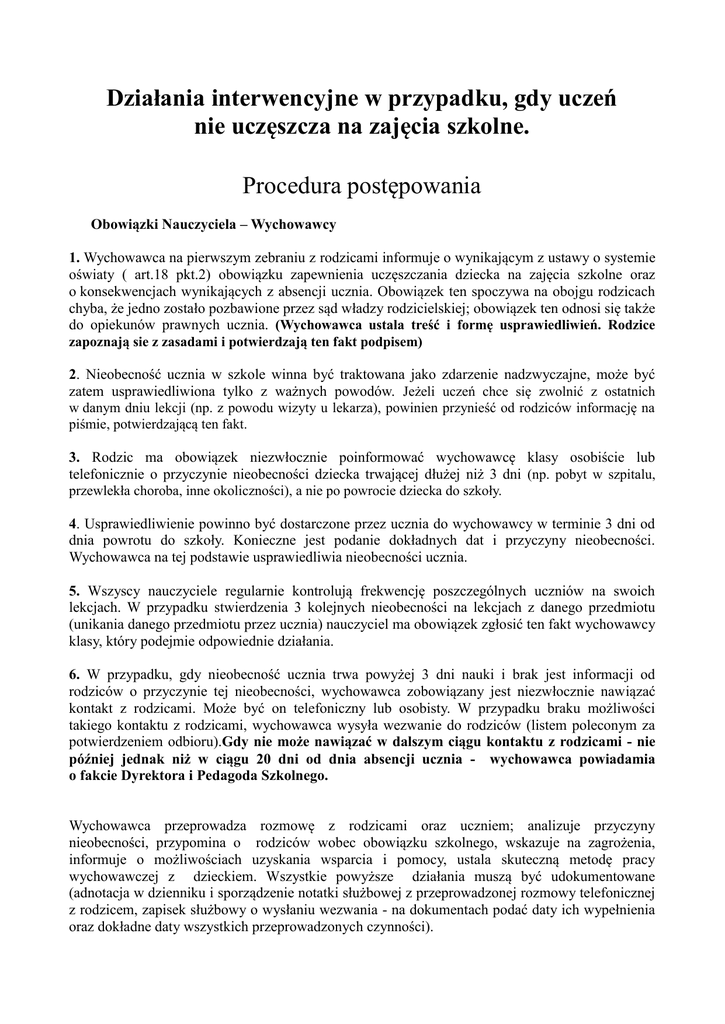 Działania interwencyjne w przypadku, gdy uczeń nie uczęszcza na zajęcia szkolne. Procedura postępowania Obowiązki Nauczyciela – Wychowawcy 1. Wychowawca na pierwszym zebraniu z rodzicami informuje o wynikającym z ustawy o systemie oświaty ( art.18 pkt.2) obowiązku zapewnienia uczęszczania dziecka na zajęcia szkolne oraz o konsekwencjach wynikających z absencji ucznia. Obowiązek ten spoczywa na obojgu rodzicach chyba, że jedno zostało pozbawione przez sąd władzy rodzicielskiej; obowiązek ten odnosi się także do opiekunów prawnych ucznia. (Wychowawca ustala treść i formę usprawiedliwień. Rodzice zapoznają sie z zasadami i potwierdzają ten fakt podpisem) 2. Nieobecność ucznia w szkole winna być traktowana jako zdarzenie nadzwyczajne, może być zatem usprawiedliwiona tylko z ważnych powodów. Jeżeli uczeń chce się zwolnić z ostatnich w danym dniu lekcji (np. z powodu wizyty u lekarza), powinien przynieść od rodziców informację na piśmie, potwierdzającą ten fakt. 3. Rodzic ma obowiązek niezwłocznie poinformować wychowawcę klasy osobiście lub telefonicznie o przyczynie nieobecności dziecka trwającej dłużej niż 3 dni (np. pobyt w szpitalu, przewlekła choroba, inne okoliczności), a nie po powrocie dziecka do szkoły. 4. Usprawiedliwienie powinno być dostarczone przez ucznia do wychowawcy w terminie 3 dni od dnia powrotu do szkoły. Konieczne jest podanie dokładnych dat i przyczyny nieobecności. Wychowawca na tej podstawie usprawiedliwia nieobecności ucznia. 5. Wszyscy nauczyciele regularnie kontrolują frekwencję poszczególnych uczniów na swoich lekcjach. W przypadku stwierdzenia 3 kolejnych nieobecności na lekcjach z danego przedmiotu (unikania danego przedmiotu przez ucznia) nauczyciel ma obowiązek zgłosić ten fakt wychowawcy klasy, który podejmie odpowiednie działania. 6. W przypadku, gdy nieobecność ucznia trwa powyżej 3 dni nauki i brak jest informacji od rodziców o przyczynie tej nieobecności, wychowawca zobowiązany jest niezwłocznie nawiązać kontakt z rodzicami. Może być on telefoniczny lub osobisty. W przypadku braku możliwości takiego kontaktu z rodzicami, wychowawca wysyła wezwanie do rodziców (listem poleconym za potwierdzeniem odbioru).Gdy nie może nawiązać w dalszym ciągu kontaktu z rodzicami - nie później jednak niż w ciągu 20 dni od dnia absencji ucznia - wychowawca powiadamia o fakcie Dyrektora i Pedagoda Szkolnego. Wychowawca przeprowadza rozmowę z rodzicami oraz uczniem; analizuje przyczyny nieobecności, przypomina o rodziców wobec obowiązku szkolnego, wskazuje na zagrożenia, informuje o możliwościach uzyskania wsparcia i pomocy, ustala skuteczną metodę pracy wychowawczej z dzieckiem. Wszystkie powyższe działania muszą być udokumentowane (adnotacja w dzienniku i sporządzenie notatki służbowej z przeprowadzonej rozmowy telefonicznej z rodzicem, zapisek służbowy o wysłaniu wezwania - na dokumentach podać daty ich wypełnienia oraz dokładne daty wszystkich przeprowadzonych czynności). 7. Szybkiej i uważnej interwencji wychowawcy wymaga także tzw. „chodzenie w kratkę”. Jeśli uczeń realizuje obowiązek szkolny nieregularnie, spóźnia się wielokrotnie na wybrane lekcje, unika danych lekcji - wychowawca nawiązuje kontakt z rodzicami, ustala metodę pracy wychowawczej z dzieckiem. 8. Wychowawca zobowiązany jest do współpracy z pedagogiem szkolnym w sytuacji powtarzających się nieusprawiedliwionych nieobecności ucznia. Pedagog i wychowawca analizują przyczyny wagarowania i ustalają dalszą strategię – w zależności od problemu, może to być wsparcie psychologiczne dla ucznia z trudnościami, wskazanie poradni specjalistycznej, nawiązanie kontaktu z kuratorem lub skierowanie sprawy do sądu rodzinnego(jeżeli uczeń jest nieletni). 9. Do dnia 10 każdego miesiąca wychowawca przekazuje pedagogowi sprawozdanie dotyczące realizacji obowiązku szkolnego przez jego podopiecznych(z wyszczególnieniem osób które często opuszczają poszczególne zajęcia lub nie usprawiedliwiają nieobecności). 10. Do rodziców lub opiekunów prawnych ucznia, który opuścił co najmniej 50 % zajęć dydaktycznych w miesiącu i są to godziny nieusprawiedliwione, dyrektor szkoły wysyła upomnienie w sprawie wykonywania obowiązku szkolnego-nauki przez dziecko (do obydwojga rodziców, listem poleconym za potwierdzeniem odbioru). Jest ono wezwaniem rodziców do zapewnienia dziecku spełniania obowiązku nauki pod rygorem wszczęcia egzekucji. Gdy upomnienie poskutkowało, wychowawca ma obowiązek wsparcia ucznia w powrocie do szkoły – pomoc w nadrobieniu zaległości, pomoc koleżeńska, itp. 11. W przypadku dalszych nieobecności ucznia lub gdy uczeń tylko przez kilka dni chodzi do szkoły, a później znów wagaruje, dyrektor szkoły podejmuje dalsze kroki: - kieruje wniosek do sądu rodzinnego w sprawie zbadania sytuacji rodzinnej ucznia i wypełniania przez jego rodziców podstawowych obowiązków z jednoczesnym powiadomieniem rodziców/opiekunów; - wystawia tytuł wykonawczy, załącza do niego kopię upomnienia, dowód doręczenia upomnienia, sporządza wniosek o wszczęcie egzekucji i kieruje w/w dokumenty do W.E. Urzędu Miasta Wrocławia, z jednoczesnym pisemnym powiadomieniem rodziców/ opiekunów. 12. Miejsca gromadzenia danych: - Dokumentacja wychowawcy klasy (dziennik lekcyjny, notatka służbowa). - Dokumentacja pedagoga szkolnego. - Dziennik korespondencji. - Księga ewidencji uczniów. - Baza komputerowa - Sprawozdania z plenarnych rad pedagogicznych.