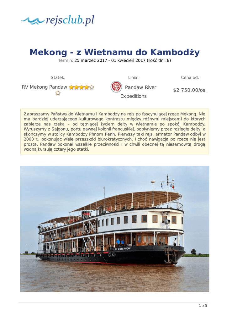 Mekong - z Wietnamu do Kambodży Termin: 25 marzec 2017 - 01 kwiecień 2017 (ilość dni: 8) Statek: RV Mekong Pandaw Linia: Pandaw River Cena od: $2 750.00/os. Expeditions Zapraszamy Państwa do Wietnamu i Kambodży na rejs po fascynującej rzece Mekong. Nie ma bardziej uderzającego kulturowego kontrastu między różnymi miejscami do których zabierze nas rzeka – od tętniącej życiem delty w Wietnamie po spokój Kambodży. Wyruszymy z Sajgonu, portu dawnej kolonii francuskiej, popłyniemy przez rozległe delty, a skończymy w stolicy Kambodży Phnom Penh. Pierwszy taki rejs, armator Pandaw odbył w 2003 r., pokonując wiele przeszkód biurokratycznych. I choć nawigacja po rzece nie jest prosta, Pandaw pokonał wszelkie przeciwności i w chwili obecnej tą niesamowitą drogą wodną kursują cztery jego statki. 1 z5 TRASA REJSU dzień 1 Data Port sobota 25.03.2017 Ho Chi Minh (daw. Sajgon) Wietnam Wpłynięcie Wypłynięcie Legenda --:-- --:-- Sajgon (obecna nazwa: Ho C hi Minh) jest stolicą południowego Wietnamu i drugim pod względem wielkości, po Hanoi, miastem w kraju. P omimo boomu ostatnich dziesięciu lat miasto to zachowało klimat dawnych Indochin. Łatwo można się o tym przekonać spacerując po szerokich bulwarach i zwiedzając wspaniałe zabytki kolonialnej francuskiej architektury. Szczególnie polecamy katedrę Notre Dame, pocztę oraz Operę, a także Ratusz. Sajgon jest też doskonałym miejscem, gdzie można spróbować francuskiej i wietnamskiej kuchni. Zapraszamy także na wycieczkę, trwającą pół dnia, do kompleksu tuneli C hu C hi. To swoiste podziemne miasto, zbudowane przez Wietkong, które pozwalało chronić się przed nalotami dywanowymi. dzień 2 niedziela 26.03.2017 Cai Be Wietnam --:-- --:-- Dziś udamy się do małej, ale bardzo charakterystycznej dla tego regionu miejscowości o nazwie C ai Be. P opłyniemy tam małymi, tradycyjnymi łodziami, zwanymi sampang odwiedzając po drodze Vinh Long, swoistą bramę do odkrywania atrakcji delty Mekongu. P łynąc wzdłuż kanałów i rozlewisk dotrzemy do C ai Be. Stoi tam wspaniały kościół zbudowany stylu gotyku francuskiego, ale nie to jest największą atrakcją miejscowości. Stanowi ją „pływający rynek”, gdzie sprzedawcy sprzedają towary prosto z łodzi. Samo C ai Be, podobnie jak większość wietnamskich miast, jest czyste i dobrze zorganizowane, po którym spacer nie stanowi problemu. dzień 3 poniedziałek 27.03.2017 Chau Doc Wietnam --:-- --:-- To jedno z najciekawszych miejsc w delcie Mekongu, graniczące z Kambodżą. Główny pomost łączący oba kraje znajduje się w centrum miasta, tuż obok hotelu Victoria, który jest bardzo przyjemnym miejscem. Można tam wypić drinka w barze, pograć w bilarda, można też skorzystać z Internetu, gdyż jest tam dostępne WIFI. Samo miasto zachowuje "francuski" styl i kusi urokiem wielu starych kolonialnych budynków (obecnie użytkowanych przez Komunistyczną P artię Wietnamu). C hau Doc jest bardzo zróżnicowane etnicznie. Obok siebie mieszkają C hamowie, Khmerowie oraz C hińczycy. Każda z tych nacji ma swoją kulturę, religię, a nawet architekturę. W okolicach miasta znajduje się wiele farm rybnych, gdzie ryby hoduje się w „zagrodach”, wielkich kadziach z bambusa, zawieszonych pod górnymi piętrami mieszkań, bezpośrednio w rzece. dzień 4 wtorek 28.03.2017 Phnom Penh Kambodża --:-- --:-- W dniu dzisiejszym odwiedzimy P hnom P enh, miasto słynące z francuskiej kolonialnej architektury, wielu kawiarni i klubów. Na wycieczkę wyruszymy rikszami (każdy swoją), skorzystamy bowiem z usług C yclo C entrum P hnom P enh, organizacji, którą właściwie można nazwać charytatywną. Dba się tam o kierujących rikszami jak nigdzie indziej, zapewniając im podstawowe potrzeby, dostęp do sanitariatów, opiekę medyczną, a nawet daje możliwości kształcenia w różnych zawodach. Na taką wycieczkę każdy z P aństwa wyruszy indywidualnie (zaopatrzywszy się uprzednio w nr kontaktowy na statek). Zwiedzanie w ten sposób nie będzie zbyt męczące, a jest co oglądać na dość rozległym terenie. P olecamy P omnik Niepodległości, Srebrną P agodę (P ałac Królewski), Muzeum Narodowe, gdzie znajdą P aństwo wyjątkową kolekcję rzemiosła Khmerów, czy ciekawe świątynie. P o południu udamy się (autokarem) do Toul Sleng, muzeum ludobójstwa, ponurego Więzienia Bezpieczeństwa (S-21) urządzonego przez reżim C zerwonych Khmerów w dawnej 2 z5 szkole (w języku khmerskim: „Wzgórze Zatrutych Drzew”). dzień 5 środa 29.03.2017 Kampong Chhnang Kambodża --:-- --:-- Dziś wyruszymy na wycieczkę w stronę prowincji Kampong C hhnang płynąc rzeką Tonle lub jadąc autokarem, ponieważ nie zawsze poziom wody pozwala na rejs. Kampong C hhnang to region położony na żyznej, niemal stale mokrej ziemi w sercu Kambodży. Rzeka Tonle wypływa z jeziora o tej samej nazwie płynąc w stronę Mekongu, przepływając między innymi przez P hnom P enh czy Siem Reap (w pobliżu którego znajdują się słynne ruiny Angkor). Najbardziej malowniczy odcinek rzeki to zwężenie między P hnom P enh i Kampong C hannang, gdzie rzeka wije się między lasami i wzgórzami zahaczając o wsie. Tonle jest nietypowa, ponieważ dwa razy w roku zmienia kierunek. Wraz z nadejściem monsunu, w lipcu, rzeka cofa się i zalewa centralną równinę Kambodży. Kiedy ta pora mija, poziom wody spada, a rzeka ponownie zmienia kierunek. dzień 6 czwartek 30.03.2017 Kampong Cham Kambodża --:-- --:-- Dziś zatrzymamy się w małej wiosce C hong Ko znanej z tkalni jedwabiu, na krótki poranny spacer. W godzinach popołudniowych przybędziemy do kolejnej wioski P eam C hi Kang, aby odwiedzić lokalną świątynię (wat) lub klasztor i szkołę. W świątyni przechowywane są wspaniałe lokalne łodzie wyścigowe. Kampong C ham jest ważną stolicą prowincji z zachowanymi francuskimi budynkami z czasów kolonialnych, wieloma targami i atrakcy