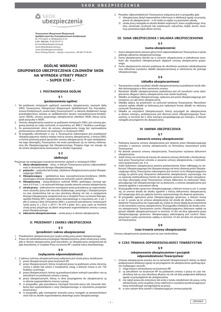 SKOK UBEZPIECZENIA 2. Ponadto, odpowiedzialność Towarzystwa wyłączona jest w przypadku gdy: 1) Ubezpieczony złożył nieprawdziwe informacje w deklaracji zgody na przystąpienie do ubezpieczenia – o ile miało to wpływ na powstanie szkody, 2) utrata pracy nastąpiła na skutek działań wojennych, stanu wyjątkowego, strajków, zamieszek cywilnych lub wojskowych, rozruchów, bójek, buntu, rewo lucji, powstania bądź aktów terroru. III. SUMA UBEZPIECZENIA I SKŁADKA UBEZPIECZENIOWA §5 (suma ubezpieczenia) 1. Suma ubezpieczenia stanowi górny limit odpowiedzialności Towarzystwa z tytułu jednego zdarzenia ubezpieczeniowego. 2. Sumę ubezpieczenia określa się w umowie ubezpieczenia w jednakowej wyso kości dla wszystkich Ubezpieczonych objętych umową ubezpieczenia grupo wego. 3. Suma ubezpieczenia stanowi podstawę do określenia wysokości odszkodowania oraz obliczenia wysokości składki ubezpieczeniowej w odniesieniu do jednego Ubezpieczonego. OGÓLNE WARUNKI GRUPOWEGO UBEZPIECZENIA CZŁONKÓW SKOK NA WYPADEK UTRATY PRACY – SUPER ETAT – §6 (składka ubezpieczeniowa) 1. Towarzystwo ustala wysokość składki ubezpieczeniowej na podstawie taryfy składek obowiązującej w dniu zawierania umowy. 2. Wysokość składki ubezpieczeniowej uzależniona jest od wysokości sumy ubezpieczenia, długości okresu ubezpieczenia oraz stawki taryfowej. 3. Składka za każdego Ubezpieczonego, opłacana jest przez Ubezpieczającego jednorazowo, za cały okres ubezpieczenia. 4. Składkę opłaca się przelewem na rachunek bankowy Towarzystwa. Warunkiem uznania wpłaty składki za dokonaną jest wpłynięcie kwoty składki na właściwy rachunek Towarzystwa. 5. Składka za wszystkich Ubezpieczonych, którzy przystąpili do ubezpieczenia w danym miesiącu, przekazywana jest zbiorczo przez Ubezpieczającego Towarzystwu, w terminie do 5. dnia miesiąca przypadającego po miesiącu, w którym nastąpiło przystąpienie do ubezpieczenia. I. POSTANOWIENIA OGÓLNE §1 (postanowienia ogólne) 1. Na podstawie niniejszych ogólnych warunków ubezpieczenia, zwanych dalej OWU, Towarzystwo Ubezpieczeń Wzajemnych Spółdzielczych Kas Oszczędnościowo-Kredytowych, zwane dalej „Towarzystwem”, w zakresie działalności swego przedsiębiorstwa, zawiera ze spółdzielczymi kasami oszczędnościowo-kredytowymi (SKOK), umowy grupowego ubezpieczenia członków SKOK, którzy zaciągnęli pożyczkę w SKOK. 2. Umowa ubezpieczenia zawarta na podstawie niniejszych OWU, jest umową grupową zawartą na cudzy rachunek, w rozumieniu art. 808 § 1 Kodeksu cywilnego. 3. Za porozumieniem stron, do umowy ubezpieczenia mogą być wprowadzone postanowienia odmienne od ustalonych w niniejszych OWU. 4. W przypadku określonym w ust. 3, Towarzystwo zobowiązane jest przedstawić Ubezpieczającemu różnicę między treścią umowy ubezpieczenia, a treścią OWU, w formie pisemnej przed zawarciem umowy ubezpieczenia. W razie niedopełnienia tego obowiązku, Towarzystwo nie może powoływać się na różnicę niekorzy stną dla Ubezpieczającego lub Ubezpieczonego. Przepisu tego nie stosuje się do umów ubezpieczenia zawieranych w drodze negocjacji. IV. UMOWA UBEZPIECZENIA §7 (zawarcie umowy ubezpieczenia) 1. Podstawą zawarcia umowy ubezpieczenia jest złożenie przez Ubezpieczającego wniosku o zawarcie umowy ubezpieczenia na formularzu stosowanym przez Towarzystwo. 2. Na dowód zawarcia umowy ubezpieczenia, Towarzystwo wystawia dokument ubezpieczenia. 3. Jeżeli strony nie umówią się inaczej, do zawarcia umowy dochodzi z chwilą akcep tacji przez Towarzystwo wniosku o zawarcie umowy ubezpieczenia, z zastrzeżeniem postanowień ust. 4–6. 4. Jeżeli dokument ubezpieczenia zawiera postanowienia, które odbiegają na niekorzyść Ubezpieczającego lub Ubezpieczonego od treści złożonej przez Ubezpieczającego oferty, Towarzystwo zobowiązane jest zwrócić na to Ubezpieczającemu uwagę na piśmie przy doręczeniu dokumentu ubezpieczenia, wyznaczając mu co najmniej siedmiodniowy termin do zgłoszenia sprzeciwu. W razie niewykonania tego obowiązku przez Towarzystwo, zmiany dokonane na niekorzyść Ubezpieczającego lub Ubezpieczonego nie są skuteczne, a umowa ubezpieczenia jest zawarta zgodnie z warunkami oferty. 5. W przypadku braku sprzeciwu Ubezpieczającego, o którym mowa w ust. 4, uważa się, że umowa doszła do skutku zgodnie z treścią dokumentu ubezpieczenia, od następnego dnia po upływie terminu wyznaczonego do złożenia sprzeciwu. 6. W przypadku zgłoszenia przez Ubezpieczającego sprzeciwu, o którym mowa w ust. 4, uważa się że umowa ubezpieczenia nie doszła do skutku, a odpowiedzialność Towarzystwa nie rozpoczęła się, chyba że strony dojdą do porozumienia co do warunków umowy ubezpieczenia. W przypadku niedojścia do skutku umowy ubezpieczenia, Towarzystwo zwróci Ubezpieczającemu dokonane wpłaty na poczet składek ubezpieczeniowych w terminie 14 dni od dnia zgłoszenia przez Ubezpieczającego sprzeciwu. Ubezpieczający zobowiązany jest zwrócić Ubezpieczonym wyżej wymienione wpłaty w terminie 14 dni od dnia ich otrzymania od Towarzystwa. §2 (definicje) Przyjmuje się następujące znaczenia terminów użytych w niniejszych OWU: 1) okres ubezpieczenia – okres, w którym Towarzystwo ponosi odpowiedzialność w stosunku do danego Ubezpieczonego, 2) pożyczka – pożyczka lub kredyt, udzielona Ubezpieczonemu przez Ubezpieczającego (SKOK), 3) Ubezpieczający – spółdzielcza kasa oszczędnościowo-kredytowa (SKOK), zawierająca umowę ubezpieczenia na rachunek swoich członków, 4) Ubezpieczony – pożyczkobiorca (członek SKOK), spełniający wymogi opi sane w § 9 ust. 1, na rachunek którego została zawarta umowa ubezpieczenia, 5) utrata pracy – jednostronne rozwiązanie przez pracodawcę za wypowiedzeniem stosunku pracy lub stosunku służbowego, zawartego z Ubezpieczonym na czas nieokreślony lub na czas określony dłuższy niż rok, w następstwie którego U