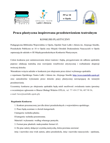 ! ! ! ! ! PP nr 18 w Opolu Praca plastyczna inspirowana przedstawieniem teatralnym ! KONKURS PLASTYCZNY ! Pedagogiczna Biblioteka Wojewódzka w Opolu, Opolski Teatr Lalki i Aktora im. Alojzego Smolki, Przedszkole Publiczne nr 18 w Opolu oraz Miejski Ośrodek Doskonalenia Nauczycieli w Opolu zapraszają do udziału w III Międzyprzedszkolnym Konkursie Plastycznym. ! Celem konkursu jest zainteresowanie dzieci teatrem i bajką, przygotowanie do odbioru spektaklu poprzez edukację teatralną oraz rozwijanie wrażliwości artystycznej i rozbudzanie ekspresji twórczej dziecka. Warunkiem wzięcia udziału w konkursie jest obejrzenie przez dzieci wybranego spektaklu z repertuaru Opolskiego Teatru Lalki i Aktora im. Alojzego Smolki http://www.teatrlalki.opole.pl/ oraz samodzielne wykonanie przez dziecko pracy plastycznej nawiązującej do tematyki przedstawienia. Uczestnicy konkursu po obejrzeniu spektaklu będą mieli możliwość zwiedzenia teatru (prosimy o wcześniejsze zgłoszenie w Biurze Obsługi Widzów OTLiA, tel. 77/ 454 37 96; 407 90 56, e-mail: [email protected]). Regulamin Konkursu: 1. Konkurs przeznaczony jest dla dzieci przedszkolnych z województwa opolskiego. 2. Prace będą oceniane w dwóch kategoriach: I kategoria: technika płaska; II kategoria: technika przestrzenna. Materiał i wykonanie: według własnego pomysłu. 3. Format prac płaskich: maksymalnie format A3. 4. Do prac należy dołączyć czytelną metryczkę, która powinna zawierać: imię i nazwisko oraz wiek autora, adres przedszkola, imię i nazwisko nauczyciela - opiekuna, numer telefonu kontaktowego, tytuł spektaklu. 5. Miejsce oddawania prac konkursowych: Pedagogiczna Biblioteka Wojewódzka w Opolu, ul. Kościuszki 14 (czytelnia, pok. nr 16, od poniedziałku do piątku w godz. 9-18, sobota w godz. 9-15) oraz Przedszkole Publiczne nr 18 w Opolu, ul. Lelewela 7 (w godz. pracy przedszkola). 6. Termin oddawania prac: do 30 kwietnia 2015 roku. 7. Prace będą oceniane w trzech kategoriach wiekowych (dzieci 3-4-letnie, 5-letnie, 6-7-letnie) przez komisję konkursową powołaną przez organizatora. 8. O wynikach konkursu opiekunowie laureatów zostaną powiadomieni telefonicznie. 9. Laureaci konkursu zostaną wyróżnieni dyplomem oraz nagrodą. Laureaci zostaną zaproszeni na uroczyste podsumowanie konkursu. 10. Rozstrzygnięcie konkursu nastąpi w maju 2015 roku. O dokładnym terminie poinformujemy telefonicznie oraz na stronie biblioteki www.pedagogiczna.pl i teatru www.teatrlalki.opole.pl. 11. Udział w konkursie jest równoznaczny z wyrażeniem zgody na prezentację prac i danych autorów oraz zdjęć dla potrzeb konkursu (w tym na stronie internetowej biblioteki www.pedagogiczna.pl). 12. Wszystkie prace będzie można oglądać na pokonkursowej wystawie w budynku PBW w Opolu i w OTLiA im. A.Smolki. 13. Wszystkie prace przechodzą na własność organizatora. 14. Jedna placówka może zgłosić maksymalnie 2 prace z każdego oddziału przedszkolnego. ! Komisja konkursowa: Barbara Błyszczakowska - doradca metodyczny nauczycieli bibliotekarzy MODN w Opolu; Dagmara Kawoń-Noga – dyrektor PBW w Opolu; Alicja Morawska-Rubczak – pedagog teatru i kierownik literacki OTLiA; Krystyna Rokita – dyrektor PP nr 18 w Opolu; Barbara Wiśniewska – doradca metodyczny nauczycieli wychowania przedszkolnego MODN w Opolu. ! W razie pytań prosimy o kontakt: Barbara Wiśniewska: [email protected]; Monika Matkowska: [email protected], tel. 77 454 12 40 wew.107 wew. 114; Barbara Pająk: [email protected], tel. 77 454 12 40 wew.107; Biuro Obsługi Widzów OTLiA: [email protected], tel. 77/ 454 37 96; 77/ 407 90. ! Serdecznie zapraszamy do udziału w konkursie!