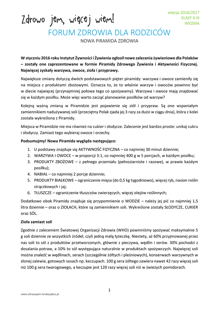 edycja 2016/2017 KLASY II-III WIOSNA FORUM ZDROWIA DLA RODZICÓW NOWA PIRAMIDA ZDROWIA W styczniu 2016 roku Instytut Żywności i Żywienia ogłosił nowe zalecenia żywieniowe dla Polaków – zostały one zaprezentowane w formie Piramidy Zdrowego Żywienia i Aktywności Fizycznej. Najwięcej zyskały warzywa, owoce, zioła i przyprawy. Największe zmiany dotyczą dwóch podstawowych pięter piramidy: warzywa i owoce zamieniły się na miejsca z produktami zbożowymi. Oznacza to, że to właśnie warzyw i owoców powinno być w diecie najwięcej (przynajmniej połowa tego co spożywamy). Warzywa i owoce mają znajdować się w każdym posiłku. Może więc warto zacząć planowanie posiłków od warzyw? Kolejną ważną zmianą w Piramidzie jest pojawienie się ziół i przypraw. Są one wspaniałym zamiennikiem nadużywanej soli (przeciętny Polak zjada jej 3 razy za dużo w ciągu dnia), która z kolei została wykreślona z Piramidy. Miejsca w Piramidzie nie ma również na cukier i słodycze. Zalecenie jest bardzo proste: unikaj cukru i słodyczy. Zamiast tego wybieraj owoce i orzechy. Podsumujmy! Nowa Piramida wygląda następująco: 1. U podstawy znajduje się AKTYWNOŚĆ FIZYCZNA – co najmniej 30 minut dziennie; 2. WARZYWA I OWOCE – w proporcji 3:1, co najmniej 400 g w 5 porcjach, w każdym posiłku; 3. PRODUKTY ZBOŻOWE – z pełnego przemiału (pełnoziarniste i razowe), w prawie każdym posiłku); 4. NABIAŁ – co najmniej 2 porcje dziennie; 5. PRODUKTY BIAŁKOWE – ograniczenie mięsa (do 0,5 kg tygodniowo), więcej ryb, nasion roślin strączkowych i jaj; 6. TŁUSZCZE – ograniczenie tłuszczów zwierzęcych, więcej olejów roślinnych; Dodatkowo obok Piramidy znajduje się przypomnienie o WODZIE – należy jej pić co najmniej 1,5 litra dziennie – oraz o ZIOŁACH, które są zamiennikiem soli. Wykreślone zostały SŁODYCZE, CUKIER oraz SÓL. Zioła zamiast soli Zgodnie z zaleceniem Światowej Organizacji Zdrowia (WHO) powinniśmy spożywać maksymalnie 5 g soli dziennie ze wszystkich źródeł, czyli jedną małą łyżeczkę. Niestety, aż 60% przyjmowanej przez nas soli to sól z produktów przetworzonych, głównie z pieczywa, wędlin i serów. 30% pochodzi z dosalania potraw, a 10% to sól występująca naturalnie w produktach spożywczych. Najwięcej soli można znaleźć w wędlinach, serach (szczególnie żółtych i pleśniowych), konserwach warzywnych w słonej zalewie, gotowych sosach np. keczupach. 100 g sera żółtego zawiera nawet 42 razy więcej soli niż 100 g sera twarogowego, a keczupie jest 120 razy więcej soli niż w świeżych pomidorach. www.zdrowojem.fundacjabos.pl 1 edycja 2016/2017 KLASY II-III WIOSNA Metoda małych kroków Pierwszą czynnością, wręcz oczywistą, jest usunięcie solniczki ze stołu i wyeliminowanie ciągłego dosalania potraw. Drugą, zmniejszenie ilości soli używanej podczas gotowania oraz dodawanie jej „do smaku” dopiero na końcu procesu. Zamiast soli warto stosować zioła i przyprawy, które są wspaniałą alternatywą. Zioła mają wiele korzystnych dla naszego organizmu właściwości: wspomagają metabolizm cholesterolu, mają działanie antyoksydacyjne, zmniejszają stany zapalne, niektóre z przypraw działają również bakterio- i wirusobójczo. Warto zaopatrzyć swoją kuchnię w świeży czosnek (naturalny antybiotyk), rozmaryn, oregano, tymianek czy bazylię. Kreatywnym i wiosennym rozwiązaniem może być także ziołowy ogródek na balkonie, lub parapecie. Pamiętajmy, że gotowe mieszanki z przyprawami np. do kurczaka lub ryb często zawierają ukrytą sól. Tymczasem z łatwością można skomponować mieszankę ziołową, którą będziemy wykorzystywać w naszej kuchni. Trzeba pamiętać, że sól ukrywa się pod różnymi nazwami, których często z nią nie kojarzymy. Sporo soli znajdziemy w sosie sojowym oraz przyprawach uniwersalnych takich jak kostki rosołowe i tym podobne. Poza ziołami i przyprawami dobrą alternatywą dla soli jest sok z cytryny. Nadaje potrawom głębię smaku, a także doskonale pasuje do świeżych warzyw i sałatek. Zmiany na etykietach i przeliczenie Jak weryfikować na co dzień ile soli znajduje się w danym produkcie? Warto czytać etykiety. Na każdej z nich można znaleźć informację o zawartości sodu. To właśnie sód znacznie częściej pojawia się na etykietach niż informacja na temat ilości soli. W grudniu 2016 ma się to zmienić. Producenci będą musieli obowiązkowo podawać wartość soli, a nie sodu w produkcie. W tej chwili pozostaje nam samodzielne przeliczanie zawartości soli na podstawie sodu. Jak to zrobić? Zawartość sodu należy pomnożyć razy 2,5 co da nam zawartość soli. Przykładowo: jeśli: w 100 g produktu znajduje się 1000 mg sodu to zawiera on 2,5 x 1000 mg = 2500 mg soli, czyli 2,5 grama. www.zdrowojem.fundacjabos.pl 2 edycja 2016/2017 KLASY II-III WIOSNA Na stronie www.aktywniepozdrowie.pl znajduje się KALKULATOR ZDROWIA DZIECKA – jest to krótka ankieta, która pozwala ocenić czy nasze dzieci odżywiają się prawidłowo. Warto wypełnić ankietę i sprawdzić czy wszystko jest w porządku. więcej na www.aktywniepozdrowie.pl www.zdrowojem.fundacjabos.pl 3