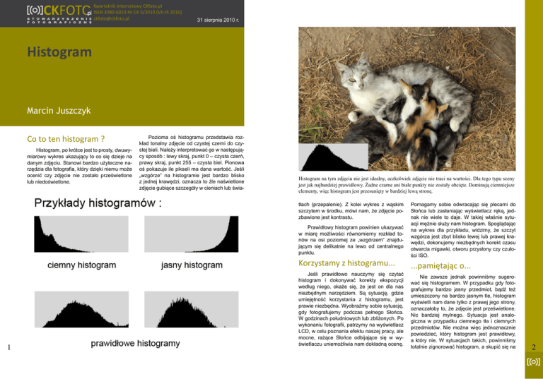 Kwartalnik Internetowy CKfoto.pl ISSN 2080-6353 Nr CK 5/2010 (VII-IX 2010) [email protected] 31 sierpnia 2010 r. Histogram Marcin Juszczyk Co to ten histogram ? Histogram, po krótce jest to prosty, dwuwymiarowy wykres ukazujący to co się dzieje na danym zdjęciu. Stanowi bardzo użyteczne narzędzia dla fotografia, który dzięki niemu może ocenić czy zdjęcie nie zostało prześwietlone lub niedoświetlone. Pozioma oś histogramu przedstawia rozkład tonalny zdjęcie od czystej czerni do czystej bieli. Należy interpretować go w następujący sposób : lewy skraj, punkt 0 – czysta czerń, prawy skraj, punkt 255 – czysta biel. Pionowa oś pokazuje ile pikseli ma dana wartość. Jeśli „wzgórze” na histogramie jest bardzo blisko z jednej krawędzi, oznacza to źle naświetlone zdjęcie gubiące szczegóły w cieniach lub świa- Histogram na tym zdjęciu nie jest idealny, aczkolwiek zdjęcie nie traci na wartości. Dla tego typu sceny jest jak najbardziej prawidłowy. Żadne czarne ani białe punkty nie zostały obcięte. Dominują ciemniejsze elementy, więc histogram jest przesunięty w bardziej lewą stronę. tłach (przepalenie). Z kolei wykres z wąskim szczytem w środku, mówi nam, że zdjęcie pozbawione jest kontrastu. Prawidłowy histogram powinien ukazywać w miarę możliwości równomierny rozkład tonów na osi poziomej ze „wzgórzem” znajdującym się delikatnie na lewo od centralnego punktu. Korzystamy z histogramu... 1 Jeśli prawidłowo nauczymy się czytać histogram i dokonywać korekty ekspozycji według niego, okaże się, że jest on dla nas niezbędnym narzędziem. Są sytuację, gdzie umiejętność korzystania z histogramu, jest prawie niezbędna. Wyobraźmy sobie sytuację, gdy fotografujemy podczas pełnego Słońca. W godzinach południowych lub zbliżonych. Po wykonaniu fotografii, patrzymy na wyświetlacz LCD, w celu poznania efektu naszej pracy, ale mocne, rażące Słońce odbijające się w wyświetlaczu uniemożliwia nam dokładną ocenę. Pomagamy sobie odwracając się plecami do Słońca lub zasłaniając wyświetlacz ręką, jednak nie wiele to daje. W takiej właśnie sytuacji mężnie służy nam histogram. Spoglądając na wykres dla przykładu, widzimy, że szczyt wzgórza jest zbyt blisko lewej lub prawej krawędzi, dokonujemy niezbędnych korekt czasu otwarcia migawki, otworu przysłony czy czułości ISO. ...pamiętając o... Nie zawsze jednak powinniśmy sugerować się histogramem. W przypadku gdy fotografujemy bardzo jasny przedmiot, bądź też umieszczony na bardzo jasnym tle, histogram wyświetli nam dane tylko z prawej jego strony, oznaczałoby to, że zdjęcie jest prześwietlone. Nic bardziej mylnego. Sytuacja jest analogiczna w przypadku ciemnego tła i ciemnych przedmiotów. Nie można więc jednoznacznie powiedzieć, który histogram jest prawidłowy, a który nie. W sytuacjach takich, powinniśmy totalnie zignorować histogram, a skupić się na 2 Analizując ten histogram stwierdzamy, po małym słupku przy krawędzi, że jest ono miejscami prześwietlone, jednocześnie, że jest niedoświetlone, patrząc na górkę po lewej. W sytuacji tej wszystko jednak jest w porządku. Jasny słupek przedstawia światła latarni odbite w wodzie i odblaski na chodniku. Ciemna górka natomiast dach budynku, oraz ogólnie to, że zdjęcie zostało wykonane wieczorem. W przypadku tym, jeśli uniknelibyśmy przepalenie świateł latarni, popsulibyśmy cały klimat zdjęcia. osiągnięciu żądanego efektu fotografii. Kolejnym przykładem może być zdjęcie na którym mamy czarny przedmiot na białym tle. Histogram wyświetli wtedy dwa słupki przy krawędziach, co też oznajmiało by, że zdjęcie jest źle naświetlone. Równomierny rozkład wartości przez całą skalę tonalną zazwyczaj jest pożądany, niekoniecznie jednak zdjęcie takie dla nas jest przydatne. Pamiętajmy! Histogram po prostu wyświetla nam jak dane zdjęcie zostało naświetlone. Dlatego naprawdę warto poświęcić trochę czasu na naukę umiejętnego posługiwania się histogramem. 3 Powyższy histogram wydaje się być nieprawidłowy, jednkaże jeśli chcemy uzyskać efekt samej sylwetki postaci robiąc zdjęcie pod Słońce, nie unikniemy takiej oto jego postaci. Głębokie czernie powinny zostać przycięte. ZAPRASZAMY DO DYSKUSJI NA FORUM http://ckfoto.pl/forum 4