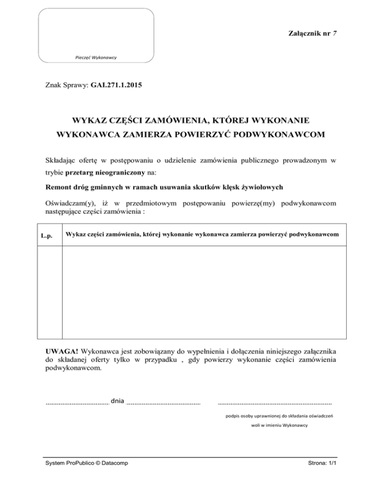 Załącznik nr 7 Pieczęć Wykonawcy Znak Sprawy: GAI.271.1.2015 pieczęć wykonawcy WYKAZ CZĘŚCI ZAMÓWIENIA, KTÓREJ WYKONANIE WYKONAWCA ZAMIERZA POWIERZYĆ PODWYKONAWCOM Składając ofertę w postępowaniu o udzielenie zamówienia publicznego prowadzonym w trybie przetarg nieograniczony na: Remont dróg gminnych w ramach usuwania skutków klęsk żywiołowych Oświadczam(y), iż w przedmiotowym postępowaniu powierzę(my) podwykonawcom następujące części zamówienia : L.p. Wykaz części zamówienia, której wykonanie wykonawca zamierza powierzyć podwykonawcom UWAGA! Wykonawca jest zobowiązany do wypełnienia i dołączenia niniejszego załącznika do składanej oferty tylko w przypadku , gdy powierzy wykonanie części zamówienia podwykonawcom. dnia podpis osoby uprawnionej do składania oświadczeń woli w imieniu Wykonawcy System ProPublico © Datacomp Strona: 1/1