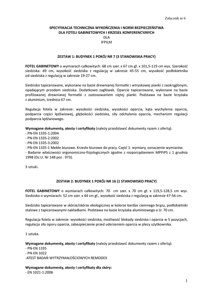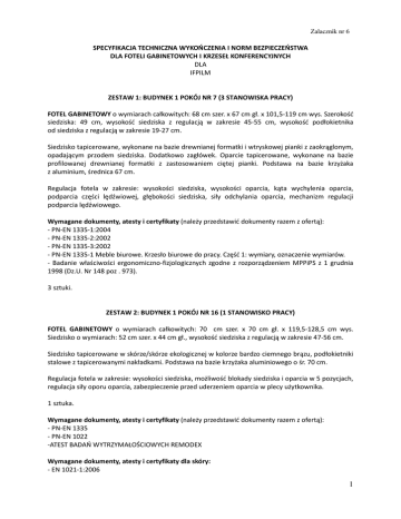 Zalacznik nr 6 SPECYFIKACJA TECHNICZNA WYKOŃCZENIA I NORM BEZPIECZEŃSTWA DLA FOTELI GABINETOWYCH I KRZESEŁ KONFERENCYJNYCH DLA IFPILM ZESTAW 1: BUDYNEK 1 POKÓJ NR 7 (3 STANOWISKA PRACY) FOTEL GABINETOWY o wymiarach całkowitych: 68 cm szer. x 67 cm gł. x 101,5-119 cm wys. Szerokość siedziska: 49 cm, wysokość siedziska z regulacją w zakresie 45-55 cm, wysokość podłokietnika od siedziska z regulacją w zakresie 19-27 cm. Siedzisko tapicerowane, wykonane na bazie drewnianej formatki i wtryskowej pianki z zaokrąglonym, opadającym przodem siedziska. Dodatkowo zagłówek. Oparcie tapicerowane, wykonane na bazie profilowanej drewnianej formatki z zastosowaniem ciętej pianki. Podstawa na bazie krzyżaka z aluminium, średnica 67 cm. Regulacja fotela w zakresie: wysokości siedziska, wysokości oparcia, kąta wychylenia oparcia, podparcia części lędźwiowej, głębokości siedziska, siły odchylania oparcia, mechanizm regulacji podparcia lędźwiowego. Wymagane dokumenty, atesty i certyfikaty (należy przedstawić dokumenty razem z ofertą): - PN-EN 1335-1:2004 - PN-EN 1335-2:2002 - PN-EN 1335-3:2002 - PN-EN 1335-1 Meble biurowe. Krzesło biurowe do pracy. Część 1: wymiary, oznaczenie wymiarów. - Badanie właściwości ergonomiczno-fizjologicznych zgodne z rozporządzeniem MPPiPS z 1 grudnia 1998 (Dz.U. Nr 148 poz . 973). 3 sztuki. ZESTAW 2: BUDYNEK 1 POKÓJ NR 16 (1 STANOWISKO PRACY) FOTEL GABINETOWY o wymiarach całkowitych: 70 cm szer. x 70 cm gł. x 119,5-128,5 cm wys. Siedzisko o wymiarach: 52 cm szer. x 44 cm gł., wysokość siedziska z regulacją w zakresie 47-56 cm. Siedzisko tapicerowane w skórze/skórze ekologicznej w kolorze bardzo ciemnego brązu, podłokietniki stalowe z tapicerowanymi nakładkami. Podstawa na bazie krzyżaka aluminiowego o śr. 70 cm. Regulacja fotela w zakresie: wysokości siedziska, możliwość blokady siedziska i oparcia w 5 pozycjach, regulacja siły oporu oparcia, zabezpieczenie przed uderzeniem oparcia w plecy użytkownika. 1 sztuka. Wymagane dokumenty, atesty i certyfikaty (należy przedstawić dokumenty razem z ofertą): - PN-EN 1335 - PN-EN 1022 -ATEST BADAŃ WYTRZYMAŁOŚCIOWYCH REMODEX Wymagane dokumenty, atesty i certyfikaty dla skóry: - EN 1021-1:2006 1 Wymagane dokumenty, atesty i certyfikaty dla skóry ekologicznej: - PN-EN 1021-1:2007 - PN-EN 1021-2:2007 - Atest Higieniczny KRZESŁA KONFERENCYJNE o wymiarach całkowitych: 49 cm szer. x 55 cm gł. x 80 cm wys., siedzisko o wymiarach 44,5 cm szer. x 47 cm gł., wysokość siedziska: 45 cm. Siedzisko tapicerowane w skórze, kolor ciemny grafitowy brąz, oparte na stelażu metalowym chromowanym. Oparcie z tkaniny siatkowej wykonane na bazie ramki plastikowej opartej na stelażu metalowym. 5 sztuk. Wymagane dokumenty, atesty i certyfikaty (należy przedstawić dokumenty razem z ofertą): - PN-EN 13761:2004 - PN-EN 1335-1:2004 ZESTAW 3: BUDYNEK 1 POKÓJ NR 20 (3 STANOWISKA PRACY) FOTEL GABINETOWY o wymiarach całkowitych: 64 cm szer. x 62 cm gł. x 117,5-132,5 cm wys. (z zagłówkiem). Siedzisko o wymiarach: 47 cm szer. x 47 cm gł., wysokość siedziska z regulacją zakresie 45,5-57,5 cm. Siedzisko tapicerowane w tkaninie typu mikrofibra, kolor szary, wykonane na bazie drewnianej formatki i pianki ciętej z zaokrąglonym, opadającym przodem siedziska. Oparcie tapicerowane w tkaninie typu mikrofibra, kolor szary, wykonane na bazie profilowanej plastikowej formatki. Regulacja fotela w zakresie: wysokości siedziska, wysokości oparcia, kąta wychylenia oparcia, głębokości siedziska, siły odchylenia oparcia, kąta pochylenia siedziska w pozycji do pracy. 1 sztuka. Wymagane dokumenty, atesty i certyfikaty (należy przedstawić dokumenty razem z ofertą): - PN-EN 13761:2004 - PN-EN 1335-1:2004 - PN-EN 1335-2:2002 - PN-EN 1335-3:2002 FOTEL GABINETOWY o wymiarach całkowitych: 64 cm szer. x 62 cm gł. x 99,5-116 cm wys. Siedzisko o wymiarach: 47 cm szer. x 47 cm gł., wysokość siedziska z regulacją zakresie 45,5-57,5 cm. Siedzisko tapicerowane w tkaninie typu mikrofibra, kolor szary, wykonane na bazie drewnianej formatki i pianki ciętej z zaokrąglonym, opadającym przodem siedziska. Oparcie tapicerowane w tkaninie typu mikrofibra, kolor szary, wykonane na bazie profilowanej plastikowej formatki. Regulacja fotela w zakresie: wysokości siedziska, wysokości oparcia, kąta wychylenia oparcia, głębokości siedziska, siły odchylenia oparcia, kąta pochylenia siedziska w pozycji do pracy. 2 sztuki. 2 Wymagane dokumenty, atesty i certyfikaty (należy przedstawić dokumenty razem z ofertą): - PN-EN 13761:2004 - PN-EN 1335-1:2004 - PN-EN 1335-2:2002 - PN-EN 1335-3:2002 KRZESŁA KONFERENCYJNE o wymiarach całkowitych: 49 cm szer. x 55 cm gł. x 80 cm wys., siedzisko o wymiarach 44,5 cm szer. x 47 cm gł., wysokość siedziska: 45 cm. Siedzisko tapicerowane w tkaninie typu mikrofibra, kolor szary, oparte na stelażu metalowym chromowanym. Oparcie z tkaniny siatkowej, wykonane na bazie ramki plastikowej opartej na stelażu metalowym. 2 sztuki. Wymagane dokumenty, atesty i certyfikaty (należy przedstawić dokumenty razem z ofertą): - PN-EN 13761:2004 - PN-EN 1335-1:2004 ZESTAW 4: BUDYNEK 2 POKÓJ NR 212 (4 STANOWISKA PRACY) FOTEL GABINETOWY o wymiarach całkowitych: 68 cm szer. x 67 cm gł. x 101,5-119 cm wys. Szerokość siedziska: 49 cm, wysokość siedziska z regulacją w zakresie 45-55 cm, wysokość podłokietnika od siedziska z regulacją w zakresie 19-27 cm. Siedzisko tapicerowane w tkaninie typu mikrofibra, kolor szary, wykonane na bazie drewnianej formatki i wtryskowej pianki z zaokrąglonym, opadającym przodem siedziska. Dodatkowo zagłówek. Oparcie tapicerowane, wykonane na bazie profilowanej drewnianej formatki z zastosowaniem ciętej pianki. Podstawa na bazie krzyżaka z aluminium, średnica 67 cm. Regulacja fotela w zakresie: wysokości siedziska, wysokości oparcia, kąta wychylenia oparcia, podparcia części lędźwiowej, głębokości siedziska, siły odchylania