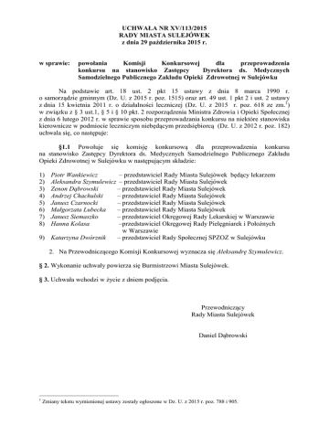 UCHWAŁA NR XV/113/2015 RADY MIASTA SULEJÓWEK z dnia 29 października 2015 r. w sprawie: powołania Komisji Konkursowej dla przeprowadzenia konkursu na stanowisko Zastępcy Dyrektora ds. Medycznych Samodzielnego Publicznego Zakładu Opieki Zdrowotnej w Sulejówku Na podstawie art. 18 ust. 2 pkt 15 ustawy z dnia 8 marca 1990 r. o samorządzie gminnym (Dz. U. z 2015 r. poz. 1515) oraz art. 49 ust. 1 pkt 2 i ust. 2 ustawy z dnia 15 kwietnia 2011 r. o działalności leczniczej (Dz. U. z 2015 r. poz. 618 ze zm.1) w związku z § 3 ust.1, § 5 i § 10 pkt. 2 rozporządzenia Ministra Zdrowia i Opieki Społecznej z dnia 6 lutego 2012 r. w sprawie sposobu przeprowadzania konkursu na niektóre stanowiska kierownicze w podmiocie leczniczym niebędącym przedsiębiorcą (Dz. U. z 2012 r. poz. 182) uchwala się, co następuje: §1.1 Powołuje się komisję konkursową dla przeprowadzenia konkursu na stanowisko Zastępcy Dyrektora ds. Medycznych Samodzielnego Publicznego Zakładu Opieki Zdrowotnej w Sulejówku w następującym składzie: Piotr Wankiewicz – przedstawiciel Rady Miasta Sulejówek będący lekarzem Aleksandra Szymulewicz – przedstawiciel Rady Miasta Sulejówek Zenon Dąbrowski – przedstawiciel Rady Miasta Sulejówek Andrzej Chachulski – przedstawiciel Rady Miasta Sulejówek Janusz Czarnocki – przedstawiciel Rady Miasta Sulejówek Małgorzata Lubecka – przedstawiciel Rady Miasta Sulejówek Janusz Siemaszko – przedstawiciel Okręgowej Rady Lekarskiej w Warszawie Hanna Kolasa –przedstawiciel Okręgowej Rady Pielęgniarek i Położnych w Warszawie 9) Katarzyna Dwórznik – przedstawiciel Rady Społecznej SPZOZ w Sulejówku 1) 2) 3) 4) 5) 6) 7) 8) 2. Na Przewodniczącego Komisji Konkursowej wyznacza się Aleksandrę Szymulewicz. § 2. Wykonanie uchwały powierza się Burmistrzowi Miasta Sulejówek. § 3. Uchwała wchodzi w życie z dniem podjęcia. Przewodniczący Rady Miasta Sulejówek Daniel Dąbrowski 1 Zmiany tekstu wymienionej ustawy zostały ogłoszone w Dz. U. z 2015 r. poz. 788 i 905. UZASADNIENIE do uchwały w sprawie powołania komisji konkursowej dla przeprowadzenia konkursu na stanowisko zastępcy dyrektora ds. medycznych Samodzielnego Publicznego Zakładu Opieki Zdrowotnej w Sulejówku Zgodnie z art. 49 ust. 1 pkt. 2 ustawy o działalności leczniczej w podmiocie leczniczym niebędącym przedsiębiorcą, przeprowadza się konkurs na stanowisko zastępcy kierownika zakładu, w przypadku gdy kierownik nie jest lekarzem. Do kompetencji Rady Miasta - zgodnie z § 3 ust. 1 rozporządzenia Ministra Zdrowia i Opieki Społecznej z dnia 6 lutego 2012 r. w sprawie sposobu przeprowadzania konkursu na niektóre stanowiska kierownicze w podmiocie leczniczym niebędącym przedsiębiorcą (Dz. U. z 2012 r. poz. 182) – należy powołanie komisji konkursowej. Niniejsze rozporządzenie określa również skład komisji konkursowej. Przedstawiciela zakładowej organizacji związkowej nie włączono do składu komisji konkursowej, ponieważ w SPZOZ w Sulejówku taka organizacja nie działa.