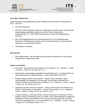 Anna Meier-Osiński M.A. Abteilungsleiterin Auskunftserteilung zu NS-Verfolgten des International Tracing Service (ITS) – seit 2015 2012-2014 Elternzeit 2007-2011 Stellvertretende Leiterin der Pädagogischen Abteilung der Internationalen Jugendbegegnungsstätte Oświęcim/Auschwitz, Aktion Sühnezeichen Friedensdienste e.V., 2008-2009 kommissarische Leitung der Pädagogischen Abteilung 2001-2006 Magisterstudium der Kulturgeschichte Ost- und Ostmitteleuropas, Polonistik und Politikwissenschaften an der Universität Bremen, Forschungsstelle Osteuropa, und Uniwersytet Gdański. 1979 geboren in Bremen Monographie Die Intelligenzaktion. Die Vernichtung der polnischen Oberschicht im Gau Danzig Westpreussen. Saarbrücken 2008. Artikel und Aufsätze Pani Zofia – wspomnienia (Erinnerungen an Frau Zofia), in: Oś – Oświęcim – Ludzie – Historia – Kultura Nr. 35, März 2011, S. 3. Internationale Jugendbegegnungsstätte Auschwitz/Oświęcim, in: Jahresberichte der Aktion Sühnezeichen Friedensdienste e.V. 2007, 2008, 2009, 2010, 2011. Przyklad odwagi cywilnej: Irena Sendler – ratująca dzieci żydowskie z getta warszawskiego (Ein Besipiel von Zivilcourage: Irena Sendler, die Retterin der jüdischen Kinder aus dem Warschauer Ghetto), in: Oś – Oświęcim – Ludzie – Historia – Kultura Nr. 30, Oktober 2010, S.5. Celuloidowy pomnik. Historie w biografii – Tadeusz Smreczyński (Ein Denkmal aus Zelluloid. Geschichten zur Biographie - Tadeusz Smreczyński), in: Oś – Oświęcim – Ludzie – Historia – Kultura Nr. 26, Juni 2010, S. 10-11. II Wojna Światowa i zbiorowej Pamięci w Polsce, Niemczech i na Ukrainie. Wzorce Pamięci, Debaty I interpretacje przed i po 1989 r. (Der zweite Weltkrieg im Kollektiven Gedächtnis in Polen, Deutschland und der Ukraine, Erinnerungsmuster, Debatten und deren Interpretationen vor und nach 1989), in: Oś – Oświęcim – Ludzie – Historia – Kultura Nr. 19, November 2009, S. 9-10. To nieważne, skąd pochodzimy, ale kim jesteśmy (Es ist nicht wichtig woher wir kommen, aber wer wir sind), in: Oś – Oświęcim – Ludzie – Historia – Kultura Nr. 9, Januar 2009, S.5-6. Historie w biografii – Zofia Lyś (Geschichten zur Biographie - Zofia Lyś), in: Oś – Oświęcim – Ludzie – Historia – Kultura Nr. 13, Mai 2009, S. 6. Podróże wolontariuszy Akcji Znaku Pokuty do Miejsc Pamięci (Gedenkstättenfahrten der Freiwilligen der Aktion Sühnezeichen Freidensdienste e.V.), in: Oś – Oświęcim – Ludzie – Historia – Kultura Nr.31, August 2009, S. 6. Gestalten heißt Entscheiden. Fünf Thesen zu Funktionen ästhetischen Darstellens in künstlerischen Workshops, S.83-85. Tworzyć to znaczy decydować. Pieć tez na temat funkcji estetycznej prezentacji podczas warsztatów artystycznych, s.101-103, in: kunst – raum – erinnerung. Künstlerische und kulturpädagogische Strategien in KZ – Gedenkstätten/sztuka – przestrzeń – pamięc. Strategie artystyczne i kulturalnopedagogiczene w miejscach pamięci po byłych obozach koncentracyjnych. Bildungsverbund für die Internationale Jugendbegegnungsstätte Sachsenhausen e.V., Potsdam 2010. Aufklären, verständigen, aufräumen. Skizzen zur deutsch-polnischen Begegnung, S. 142-143.Oświęcic, zrozumieć, posprzątać. Skice o spotkaniu polsko-niemieckim, s.155-157, in: kunst – raum – erinnerung. Künstlerische und kulturpädagogische Strategien in KZ – Gedenkstätten/sztuka – przestrzeń – pamięc. Strategie artystyczne i kulturalno-pedagogiczene w miejscach pamięci po byłych obozach koncentracyjnych. Bildungsverbund für die Internationale Jugendbegegnungsstätte Sachsenhausen e.V., Potsdam 2010. um nicht den deutsch-polnischen Kontext zu vergessen. S.133-135./ aby nie zapomnieć o polsko-niemieckim kontekscie, s. 147-149, in: kunst – raum – erinnerung. Künstlerische und kulturpädagogische Strategien in KZ – Gedenkstätten/sztuka – przestrzeń – pamięc. Strategie artystyczne i kulturalnopedagogiczene w miejscach pamięci po byłych obozach koncentracyjnych. Bildungsverbund für die Internationale Jugendbegegnungsstätte Sachsenhausen e.V., Potsdam 2010. Polsko-niemieckie warsztaty artystyczne (Deutsch-Polnische Kunstworkshops), in: Oś – Oświęcim – Ludzie – Historia – Kultura Nr. 25, Mai 2010, S.7. Ich bin Roma und habe dieses Land verteidigt, in: Polen und wir. Zeitschrift für deutsch-polnische Verständigung, Nr. 4/2010(93), S.14-16 und in: Zeichen der Aktion Sühnezeichen Friedensdienste e.V. Nr.2 Sommer 2010, S. 13-15. Die Internationale Jugendbegegnungsstätte in Oświęcim/Auschwitz, in: Zeichen der Aktion Sühnezeichen Friedensdienste e.V. Nr.2 Mai 2009, S.20-21. Intensive Auseinandersetzung mit Orten der Vernichtung, in: Predigthilfe der Aktion Sühnezeichen Friedensdienste e.V. zum 27. Januar 2009, Gedenktag für die Opfer des Nationalsozialismus. S. 69-72. Ein sichtbares Zeichen. Die Internationale Jugendbegegnungsstätte Oświęcim /Auschwitz, in: Zeichen der Aktion Sühnezeichen Friedensdienste e.V. Jubiläumsausgabe Mai 2008, S.42-43. Redaktion Marsz Śmierci. Przewodnik po trasie Oświęcim – Wodzisław Śląski, Andrzej Strzelecki. Biuletyn specjalny Nr 52-53. Oświęcim 2008./Der Todesmarsch. Wegweiser über die Route Oświęcim (Auschwitz) – Wodzisław Śląski (Loslau), Andrzej Strzelecki. Biulettin Sonderausgabe Nr.52-53, Oświęcim 2008. DVD Geschichten zur Biographie - Historie w biografii. Deutsch-polnische DVD zur gleichnamigen dreiteiligen Seminarreihe Geschichten zur Biographie (2008-2010), die den drei Auschwitz-Überlebenden Zofia Łyś, Józef Paczyński und Tadeusz Smreczyński gewidmet ist, Oświęcim 2010. Stand: Januar 2016